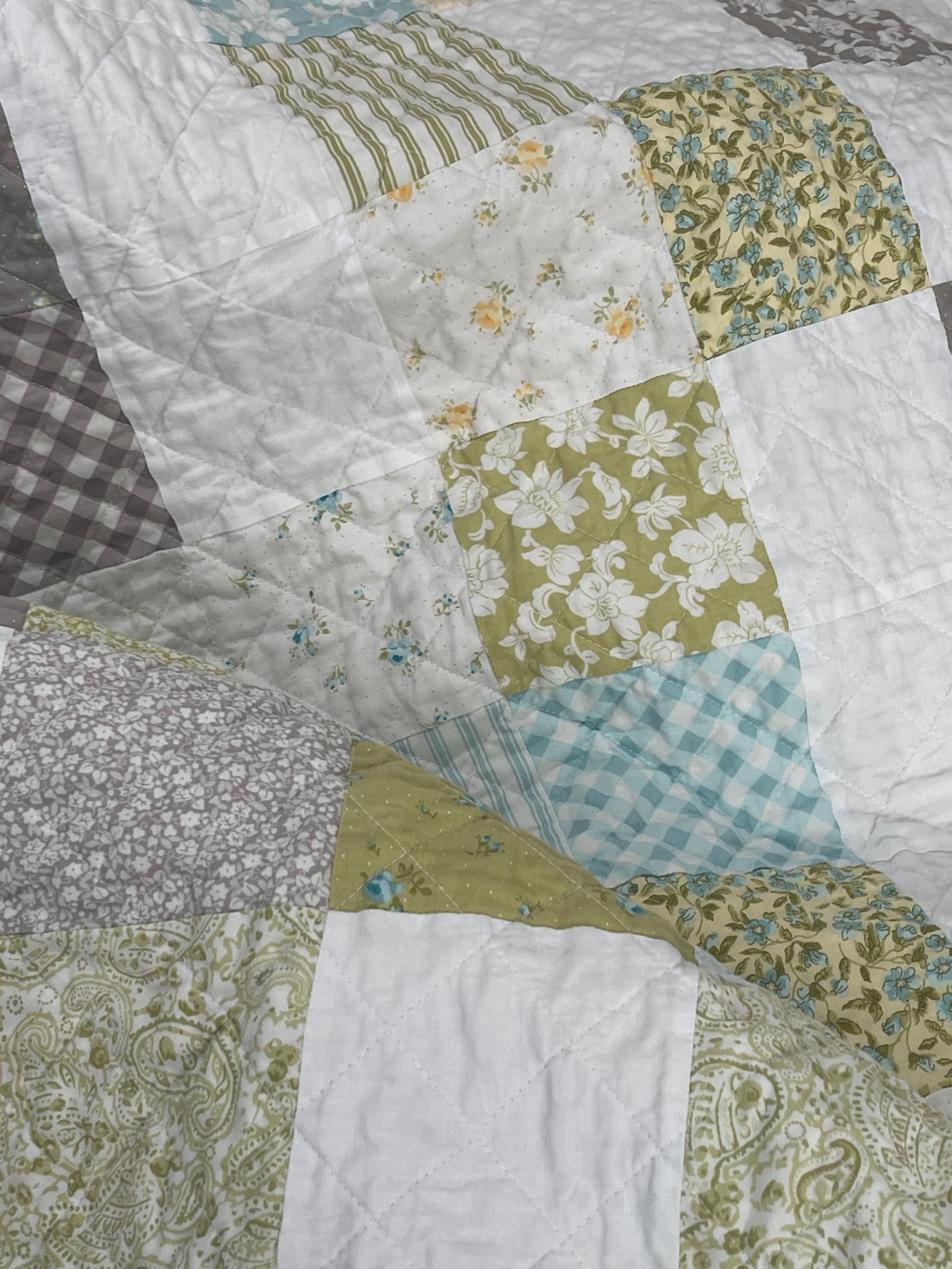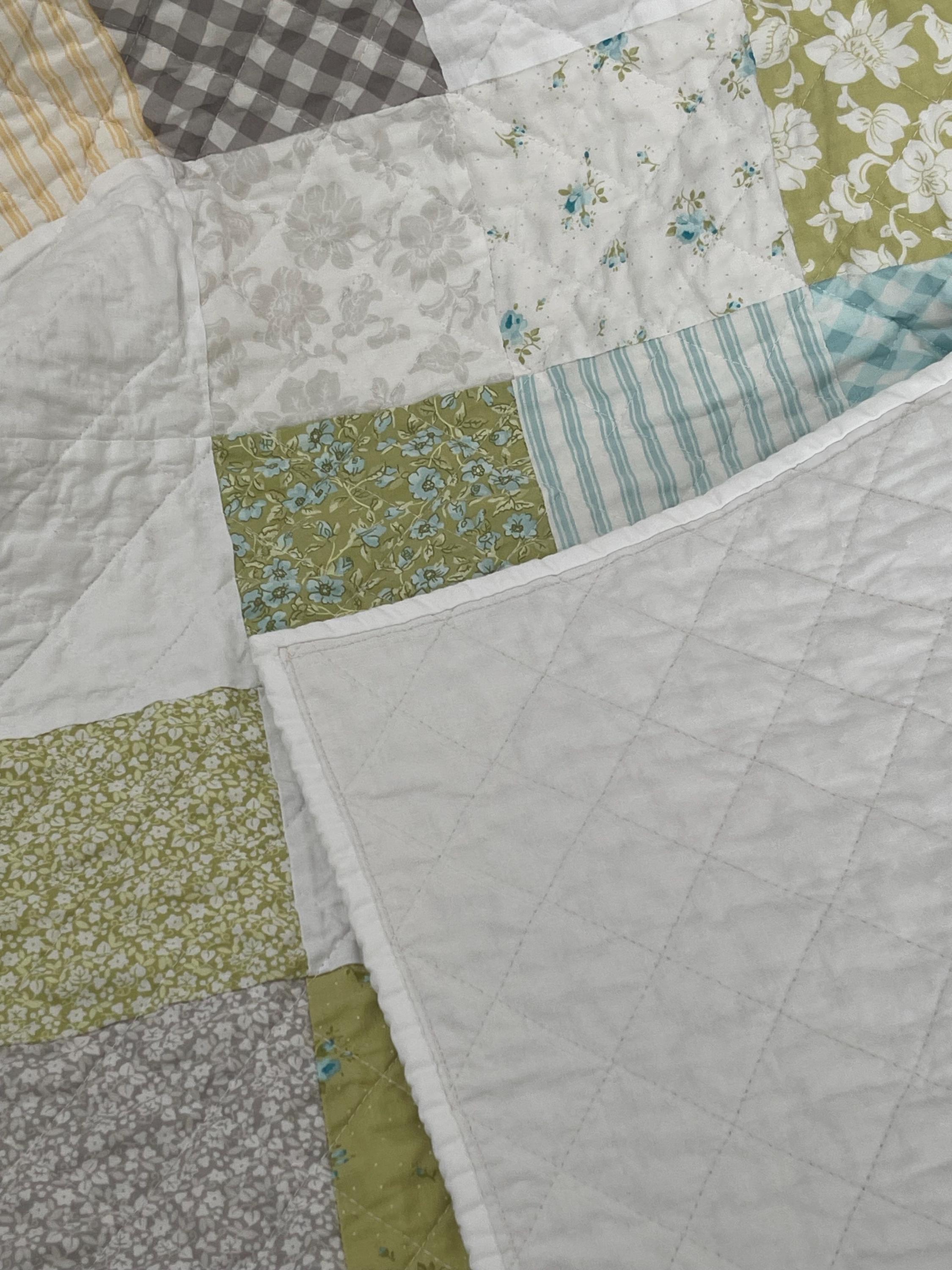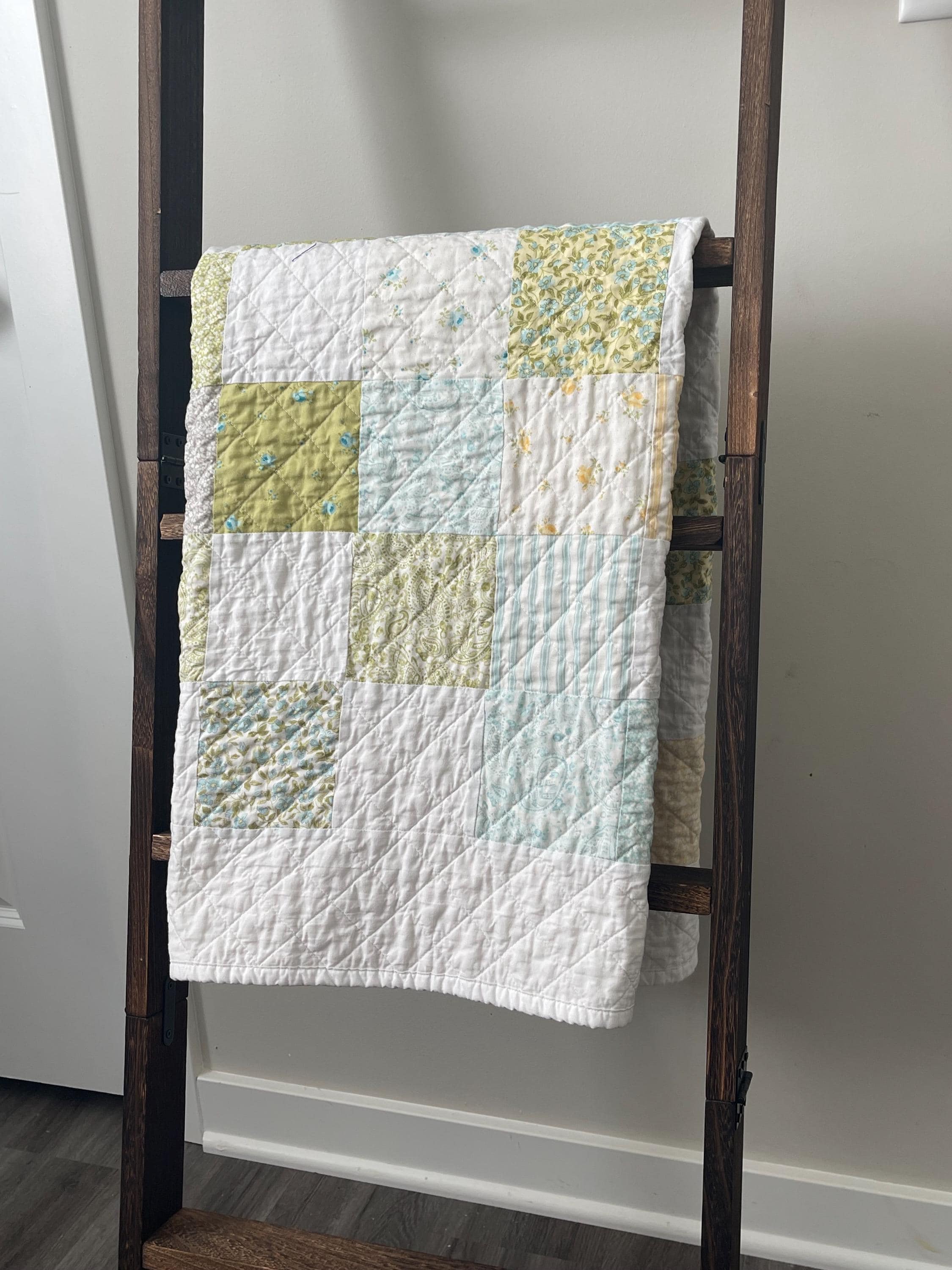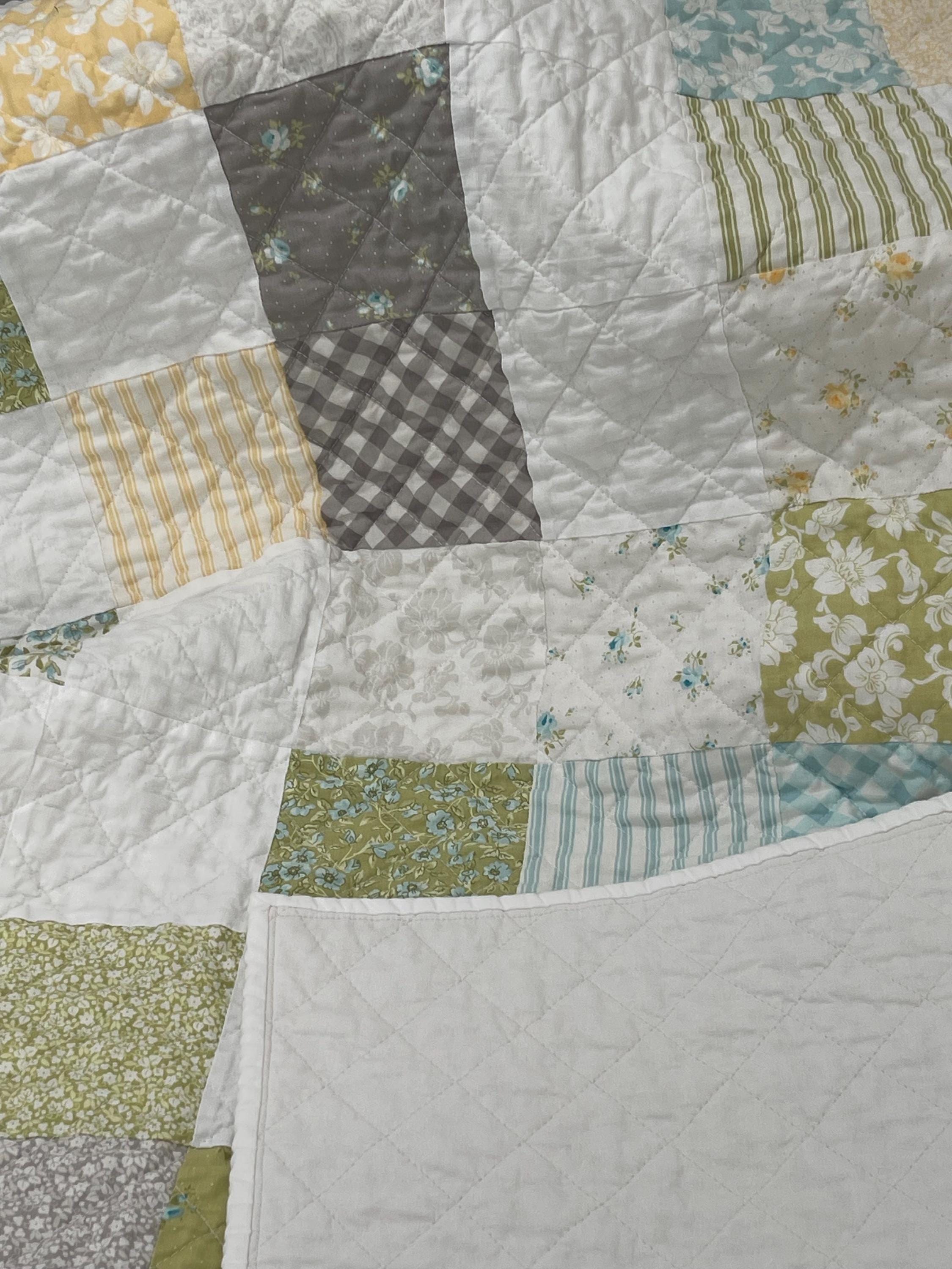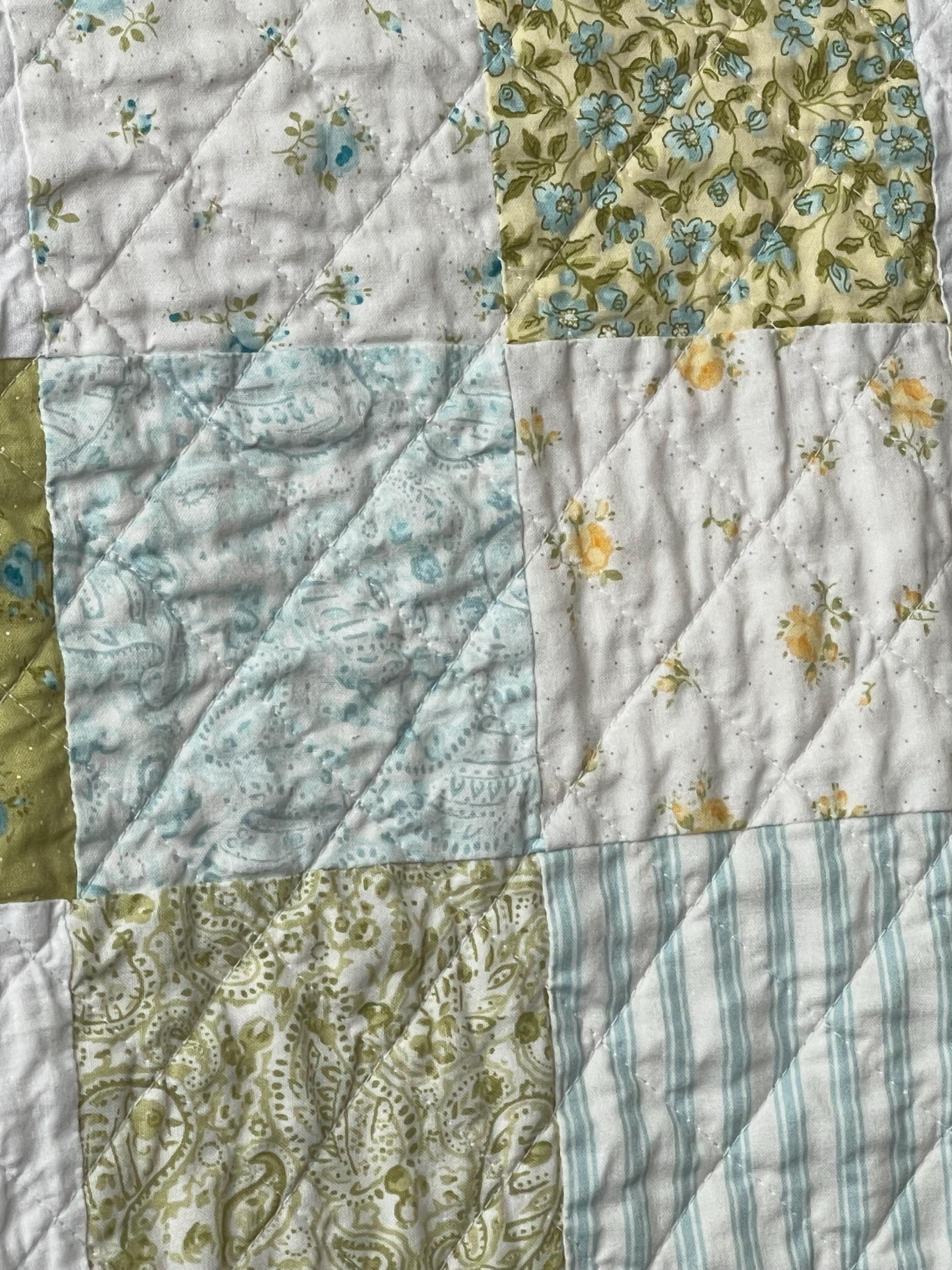 Wrap your little one in timeless comfort with this one-of-a-kind handmade baby quilt. Carefully crafted with high-quality cotton fabrics, this quilt features a charming patchwork design in soft pastel tones of yellow, green, aqua, and white, accented with delicate floral and gingham prints. The soothing color palette makes it a perfect addition to any nursery—ideal for both boys and girls.