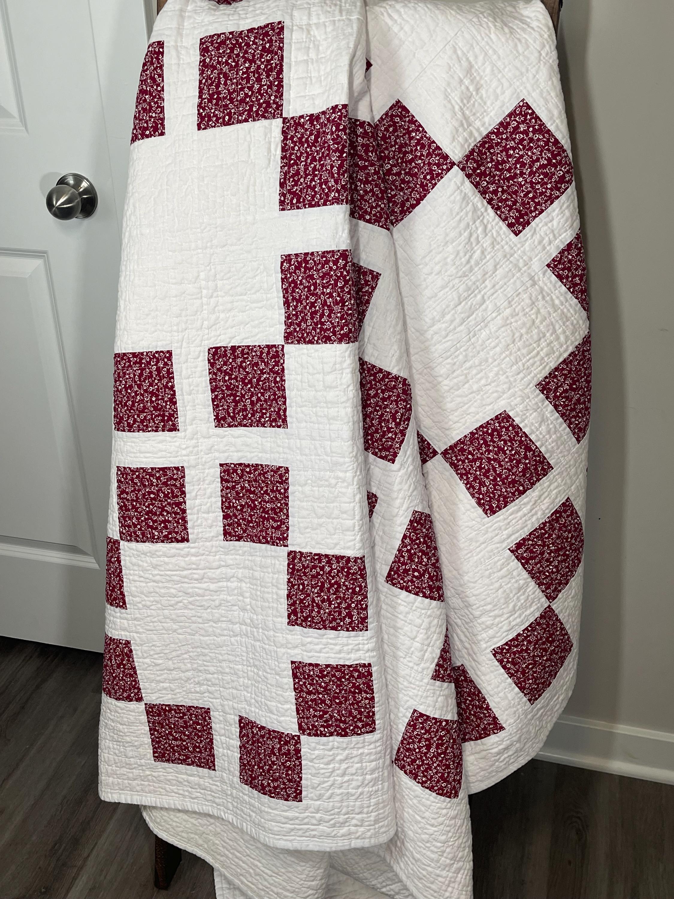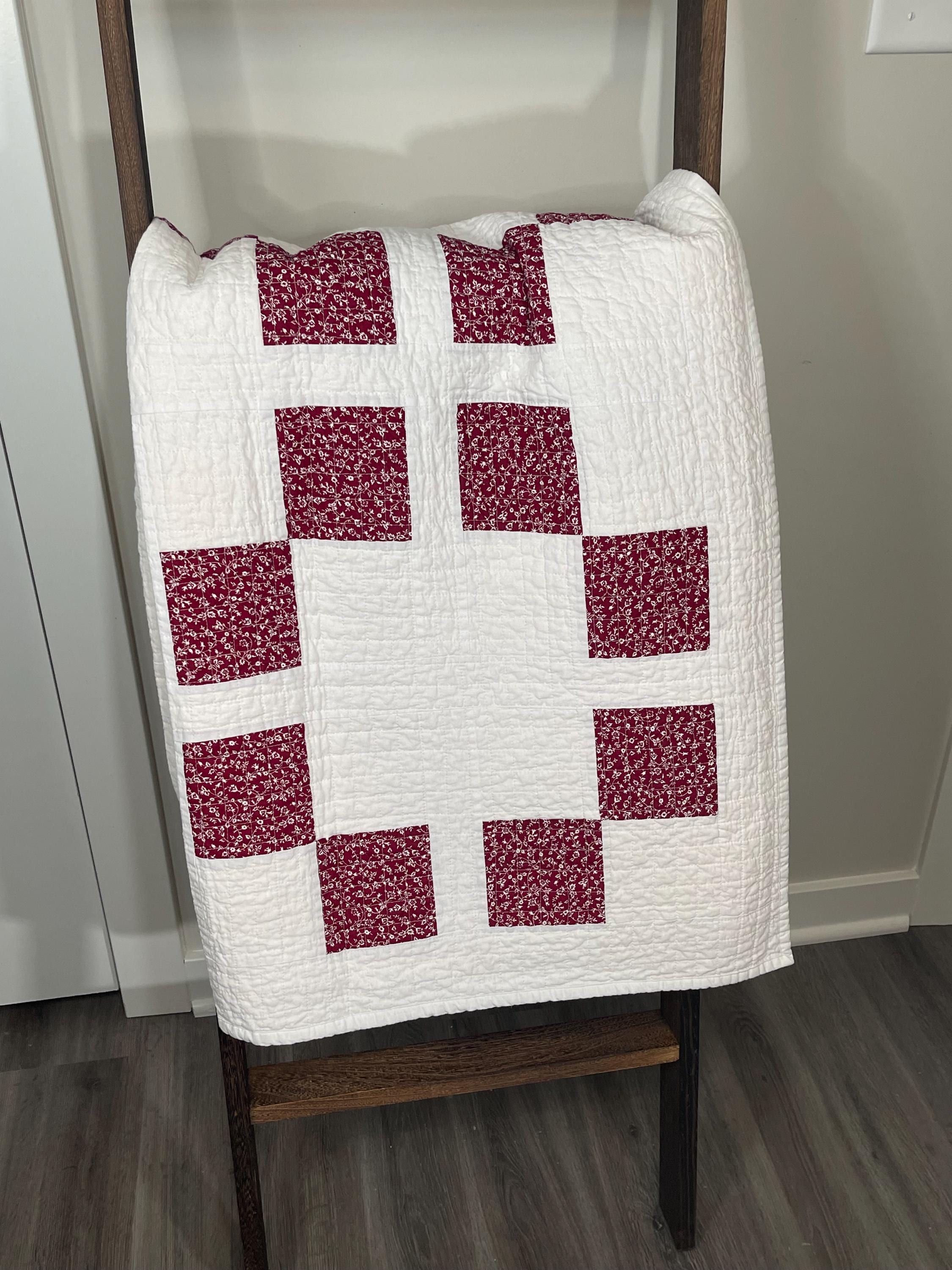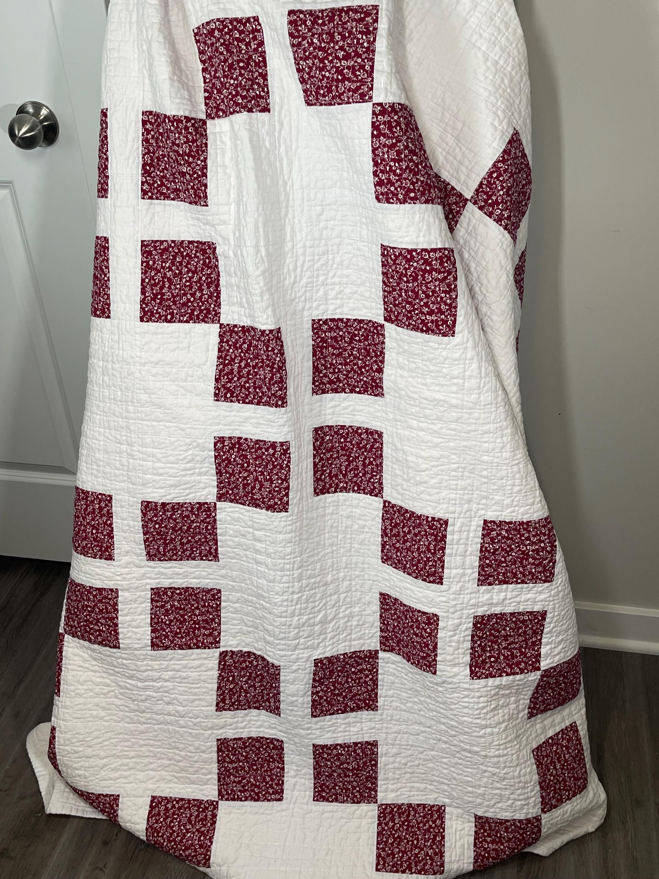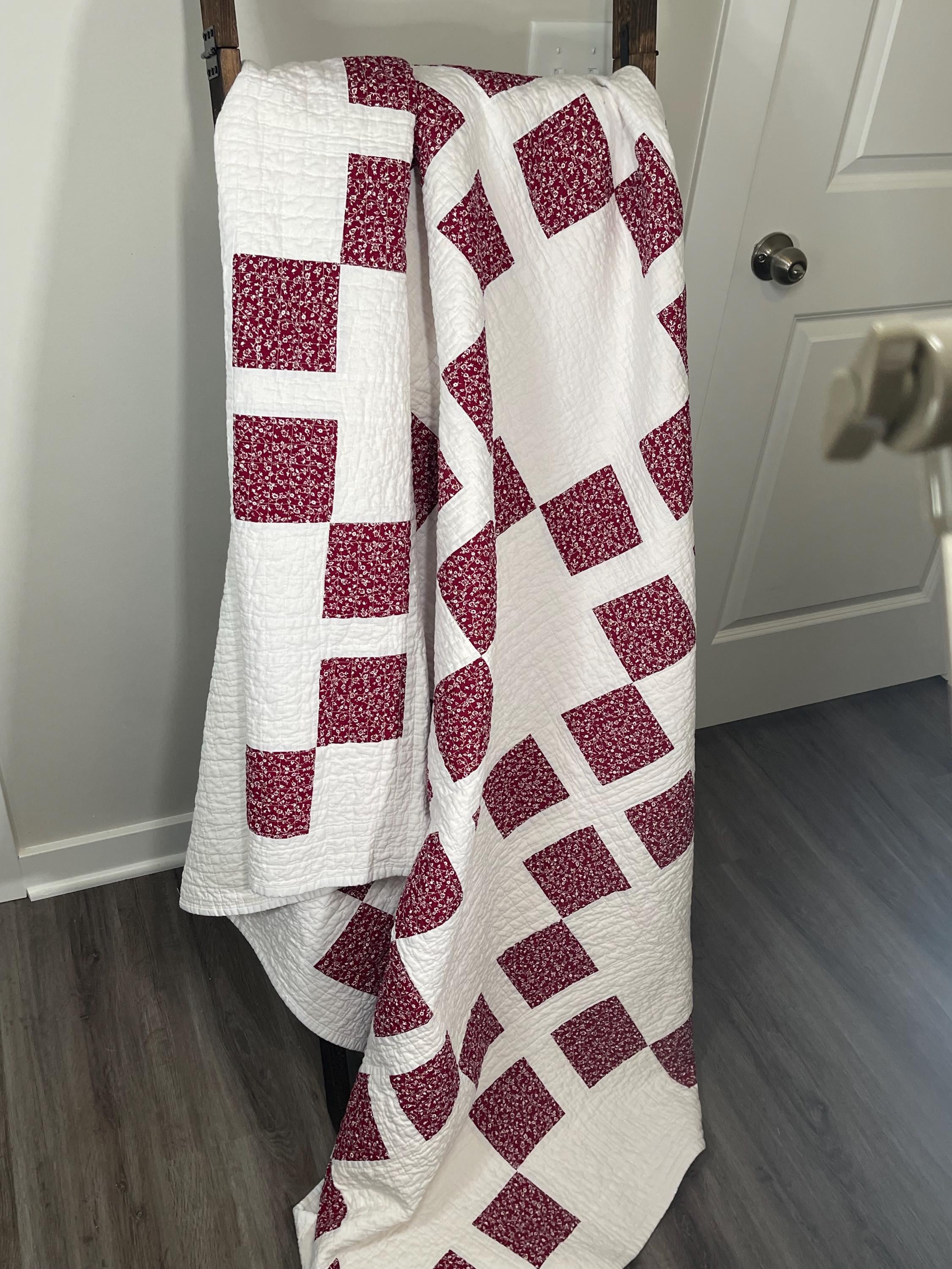 This beautiful handmade quilt is a modern take on a classic design, perfect for adding a touch of cozy elegance to any room. The striking red and white design features a classic quilt block pattern, with the red fabric showcasing a charming, subtle floral print. Each quilt is lovingly made, featuring soft, breathable materials and a simple, yet stylish, straight-line quilting pattern. This makes it an ideal throw blanket for your couch or a stunning accent piece on a quilt ladder.