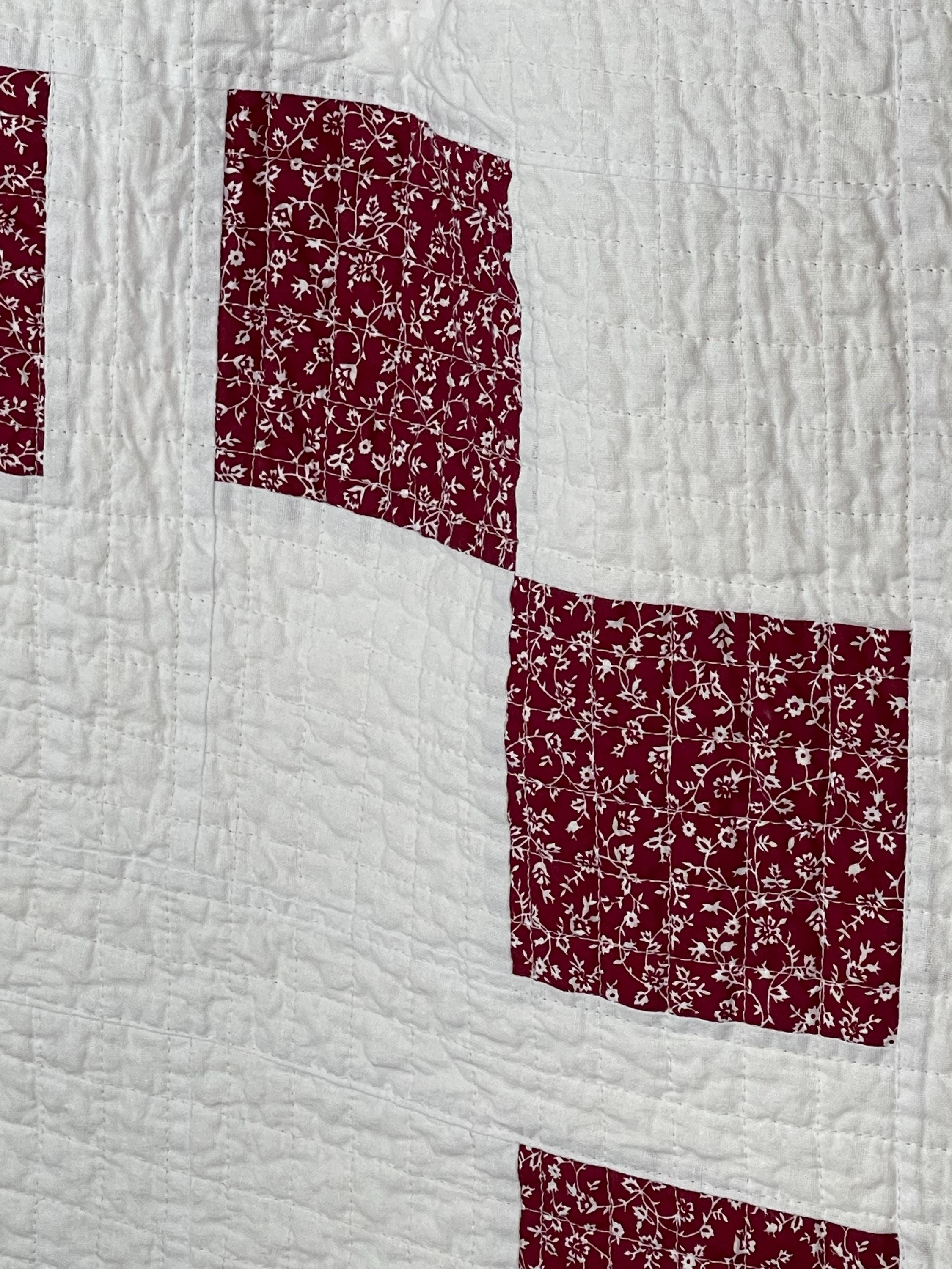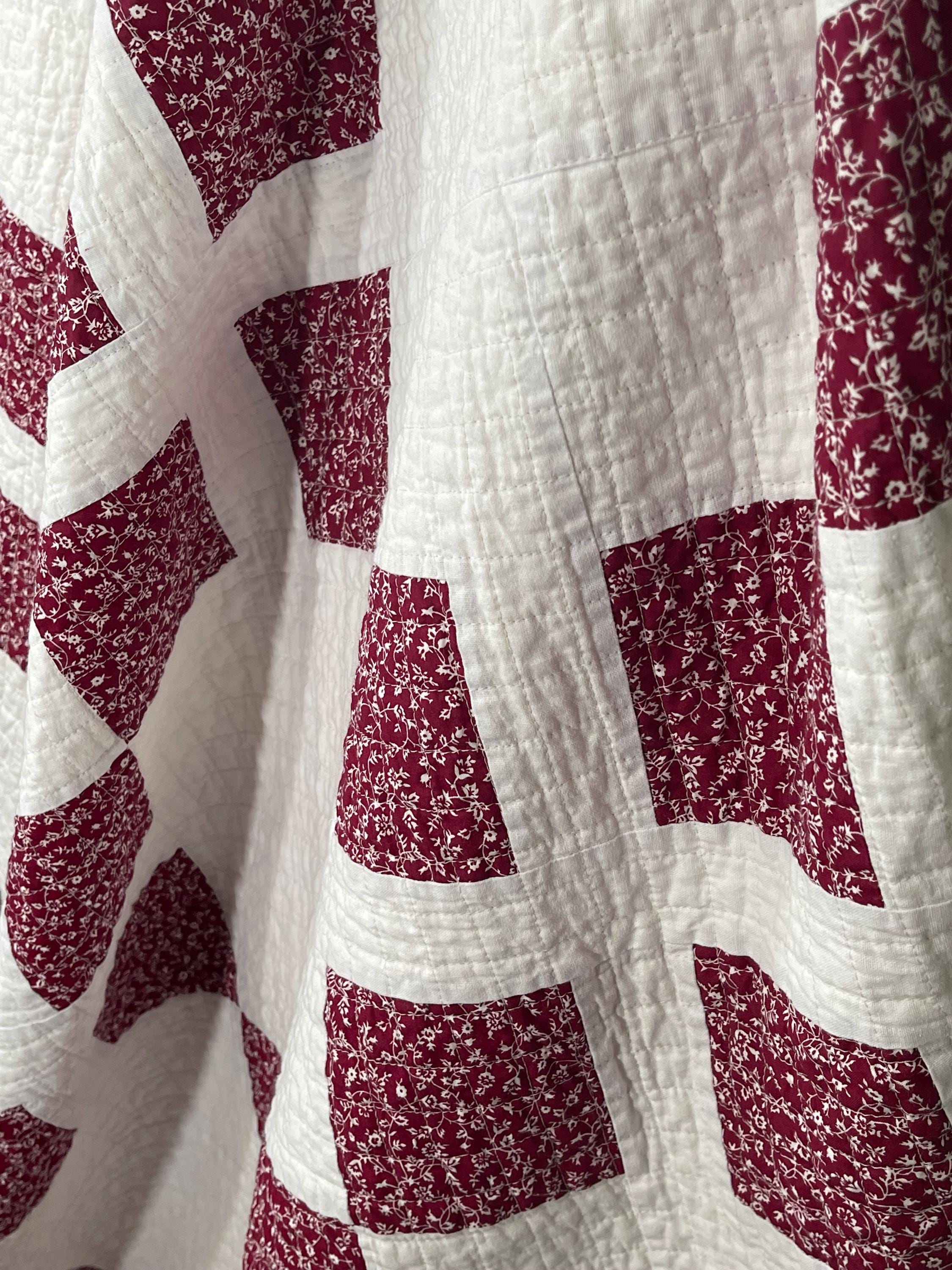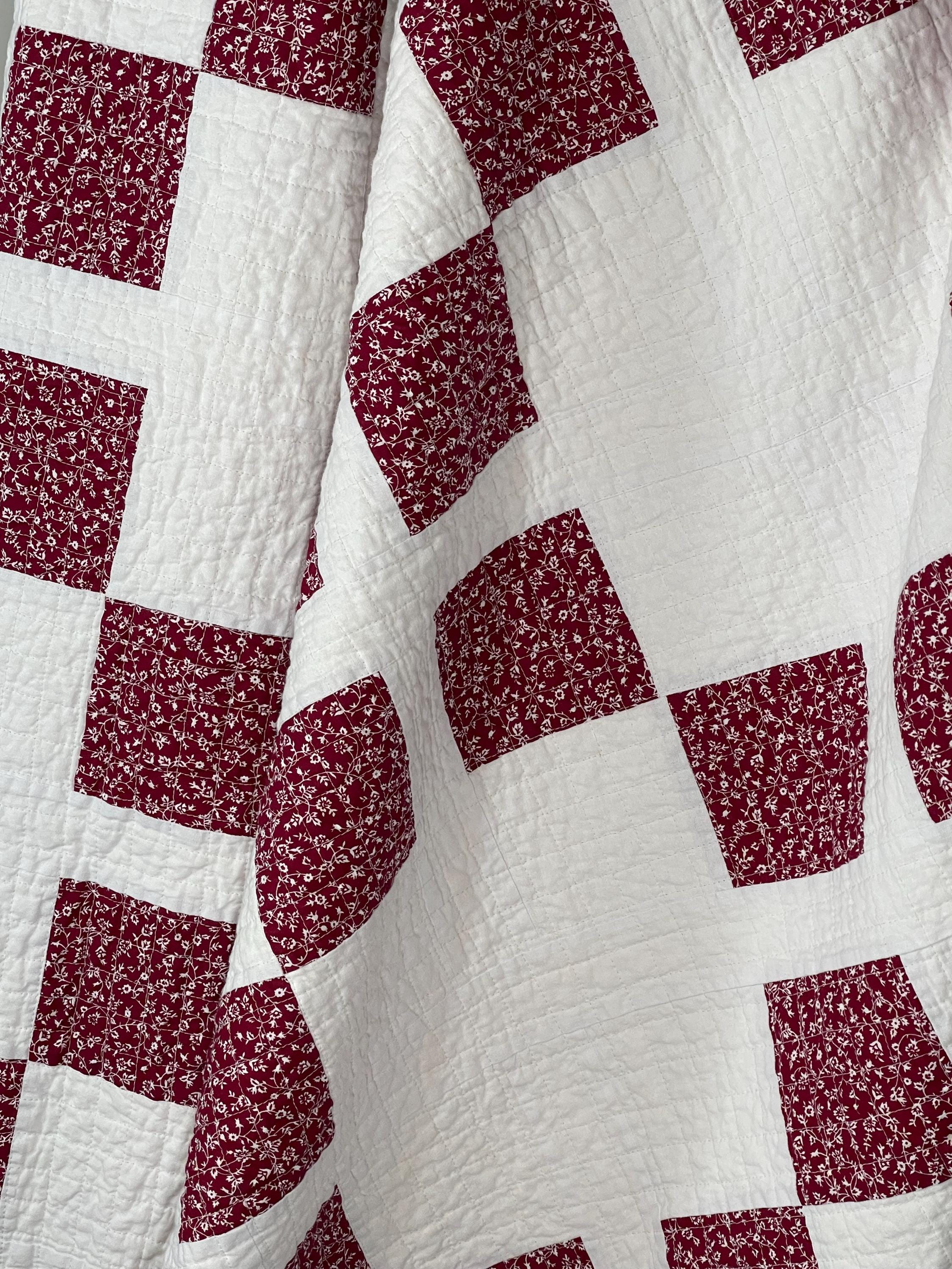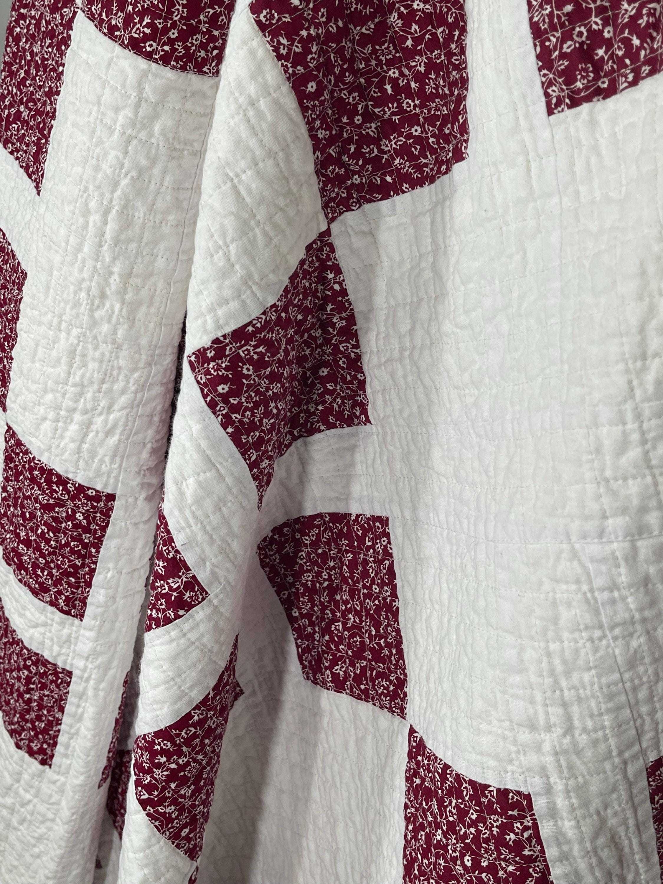 This beautiful handmade quilt is a modern take on a classic design, perfect for adding a touch of cozy elegance to any room. The striking red and white design features a classic quilt block pattern, with the red fabric showcasing a charming, subtle floral print. Each quilt is lovingly made, featuring soft, breathable materials and a simple, yet stylish, straight-line quilting pattern. This makes it an ideal throw blanket for your couch or a stunning accent piece on a quilt ladder.