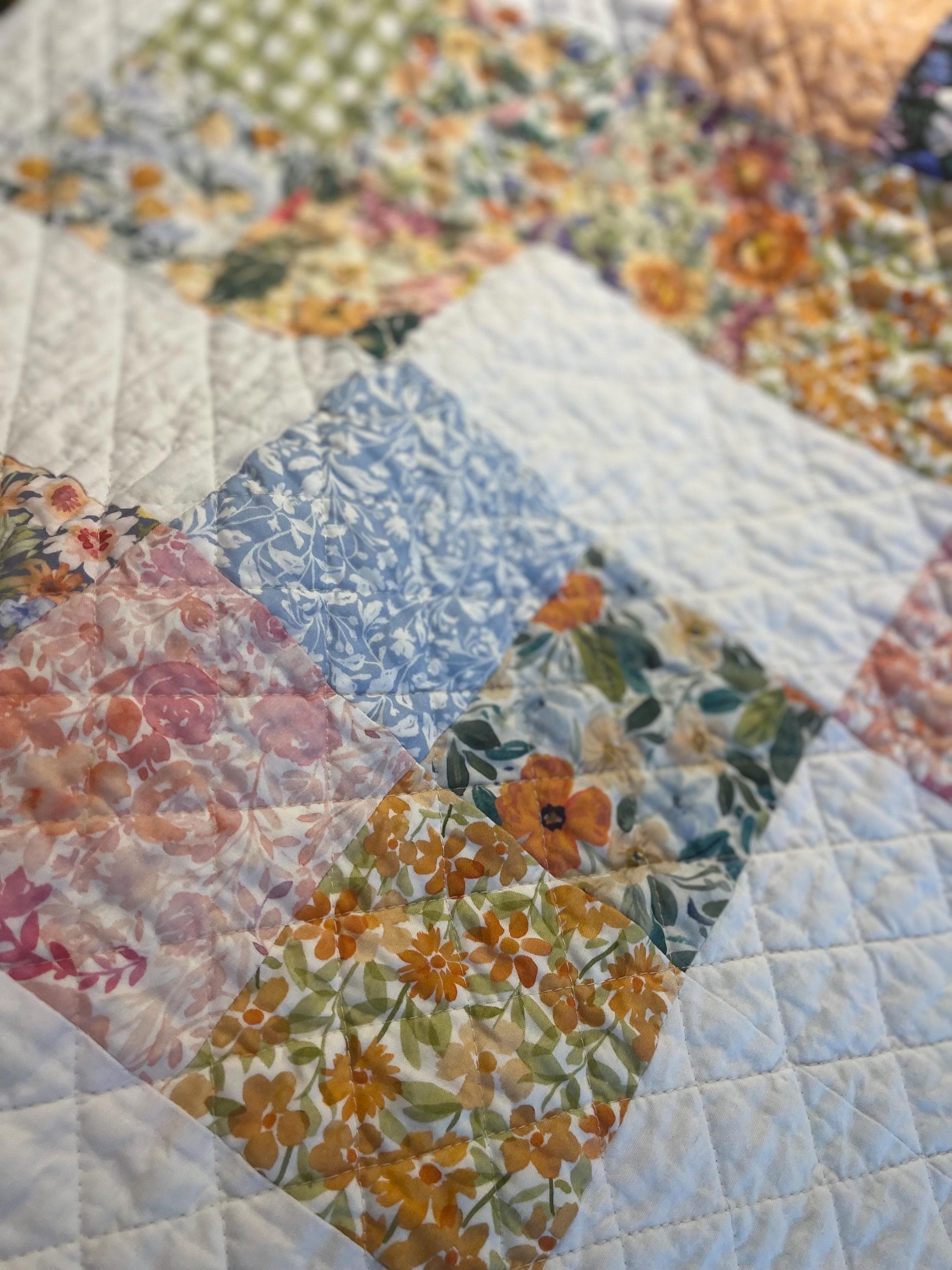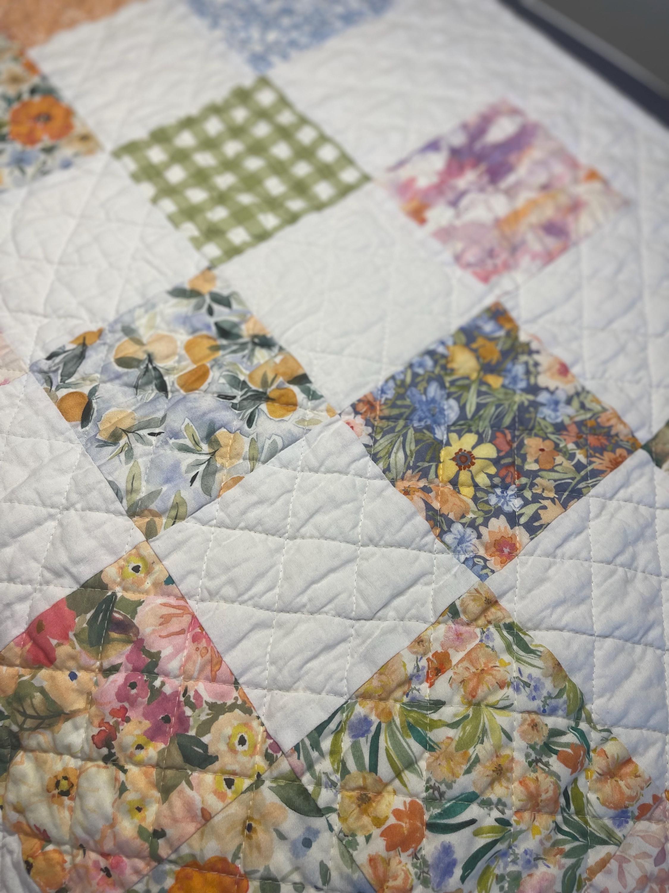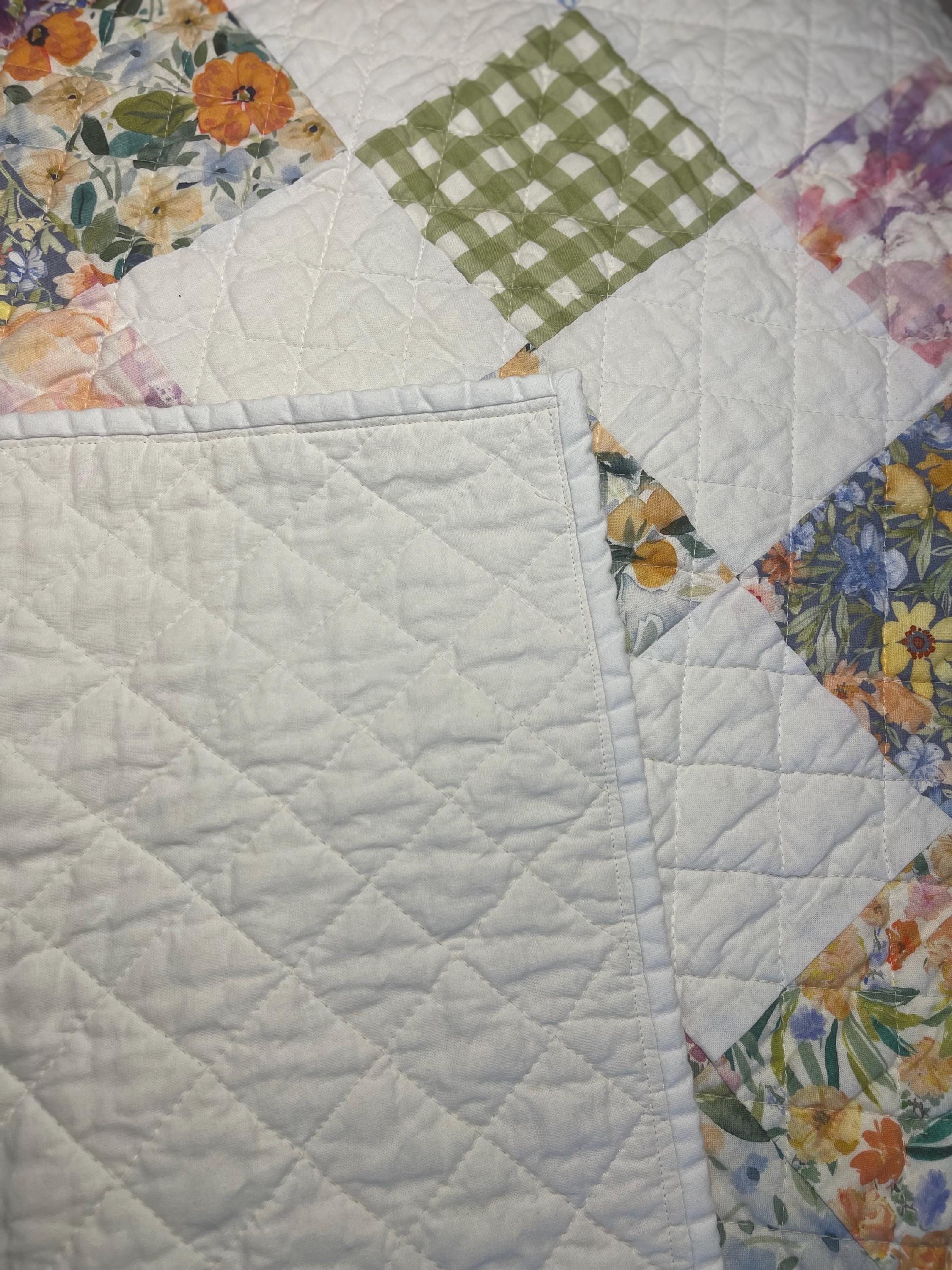 Crafted with care, this soft and cozy quilt features a charming patchwork design of floral, fruit, and classic gingham patterns, all set against a clean, white background. Each square is a delightful blend of colors, from warm oranges and cheerful yellows to calming blues and delicate pinks. The quilt is finished with a simple yet elegant diamond stitch quilting, giving it a soft, puffy texture perfect for snuggling.