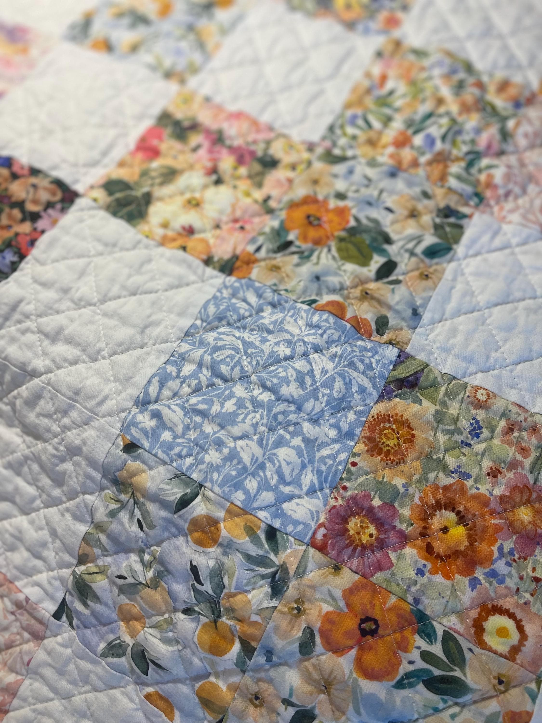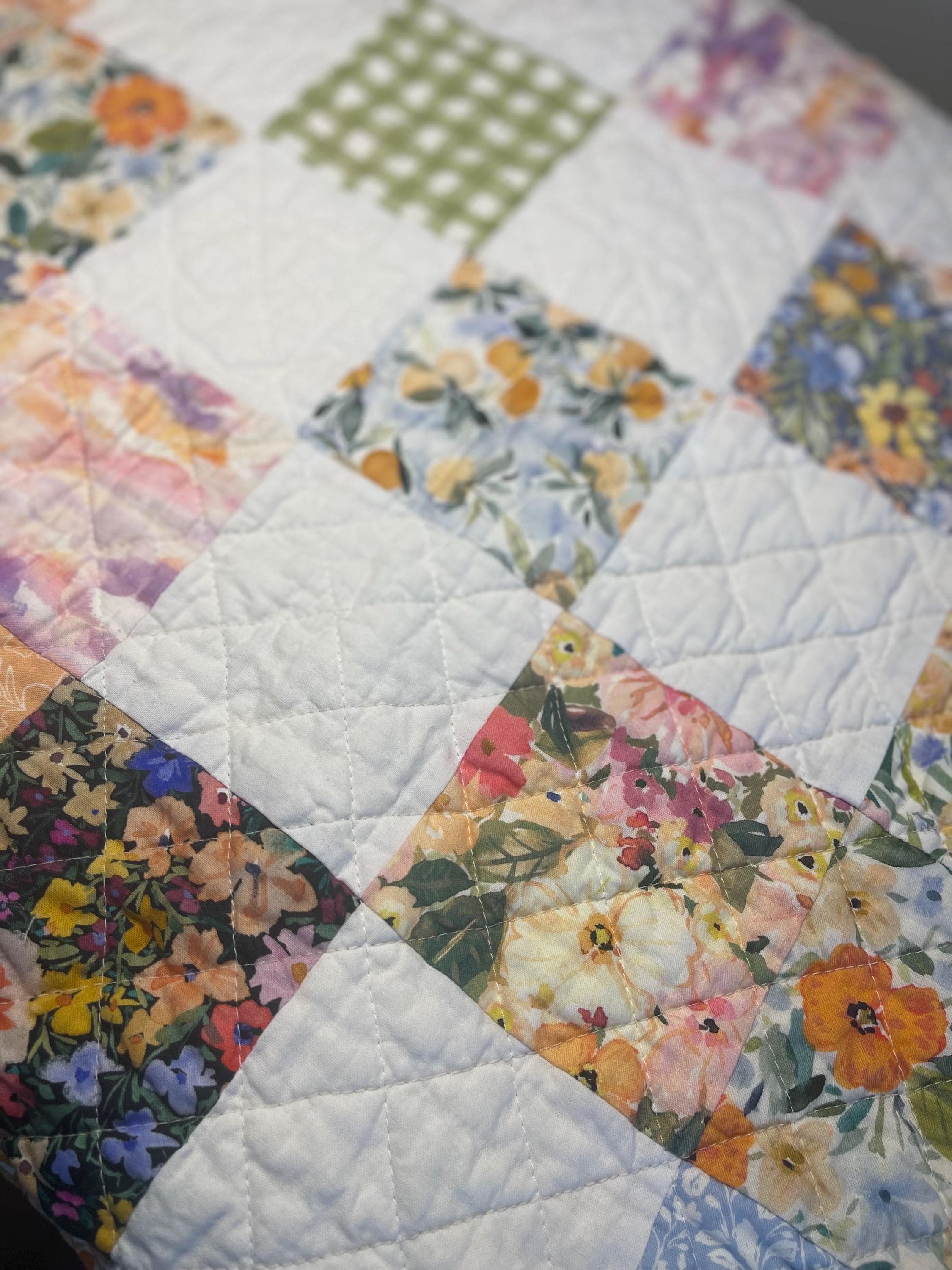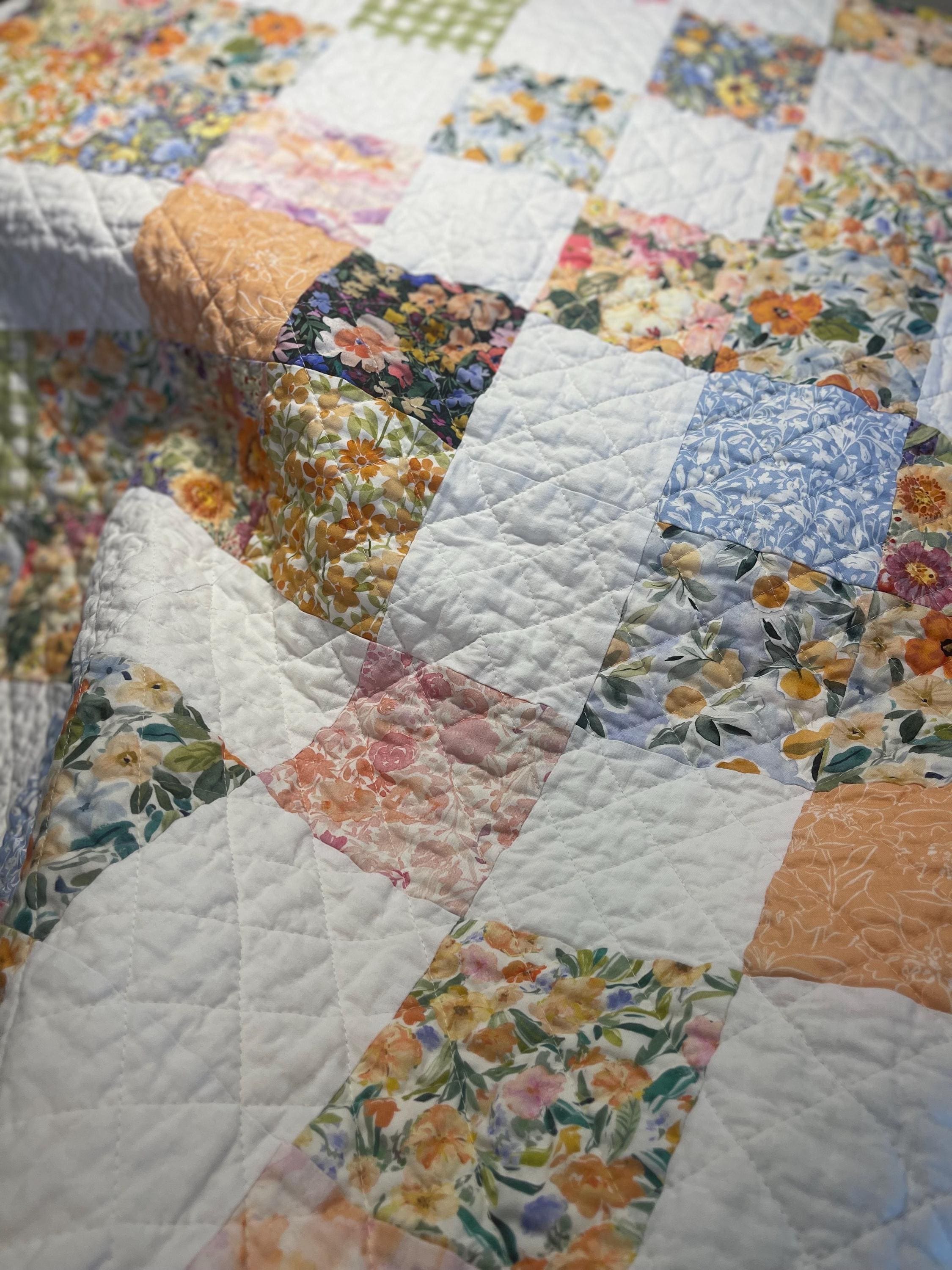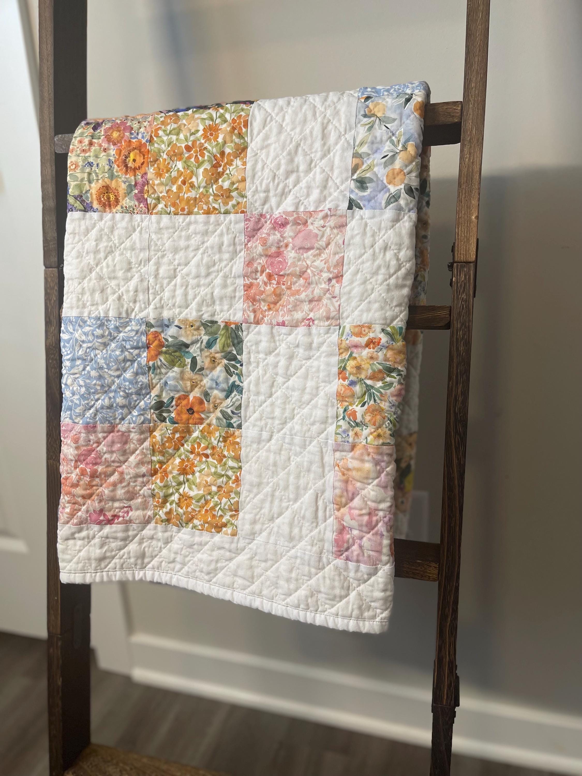 Crafted with care, this soft and cozy quilt features a charming patchwork design of floral, fruit, and classic gingham patterns, all set against a clean, white background. Each square is a delightful blend of colors, from warm oranges and cheerful yellows to calming blues and delicate pinks. The quilt is finished with a simple yet elegant diamond stitch quilting, giving it a soft, puffy texture perfect for snuggling.