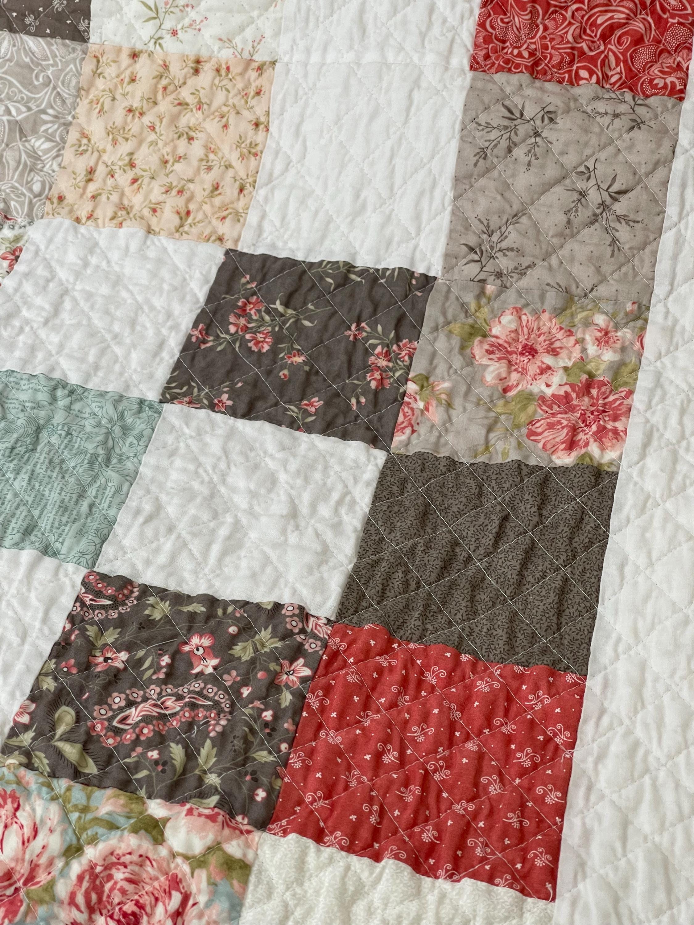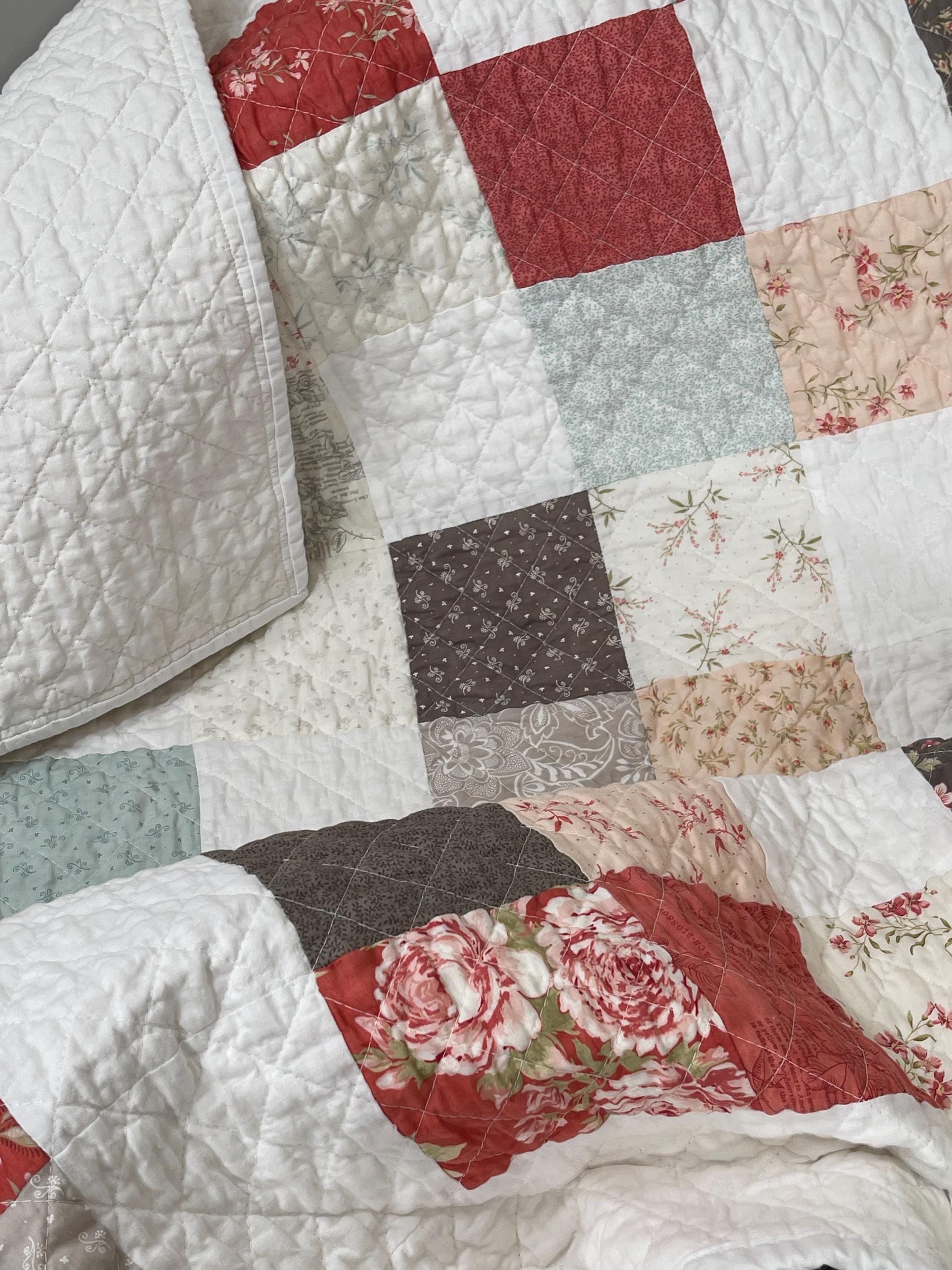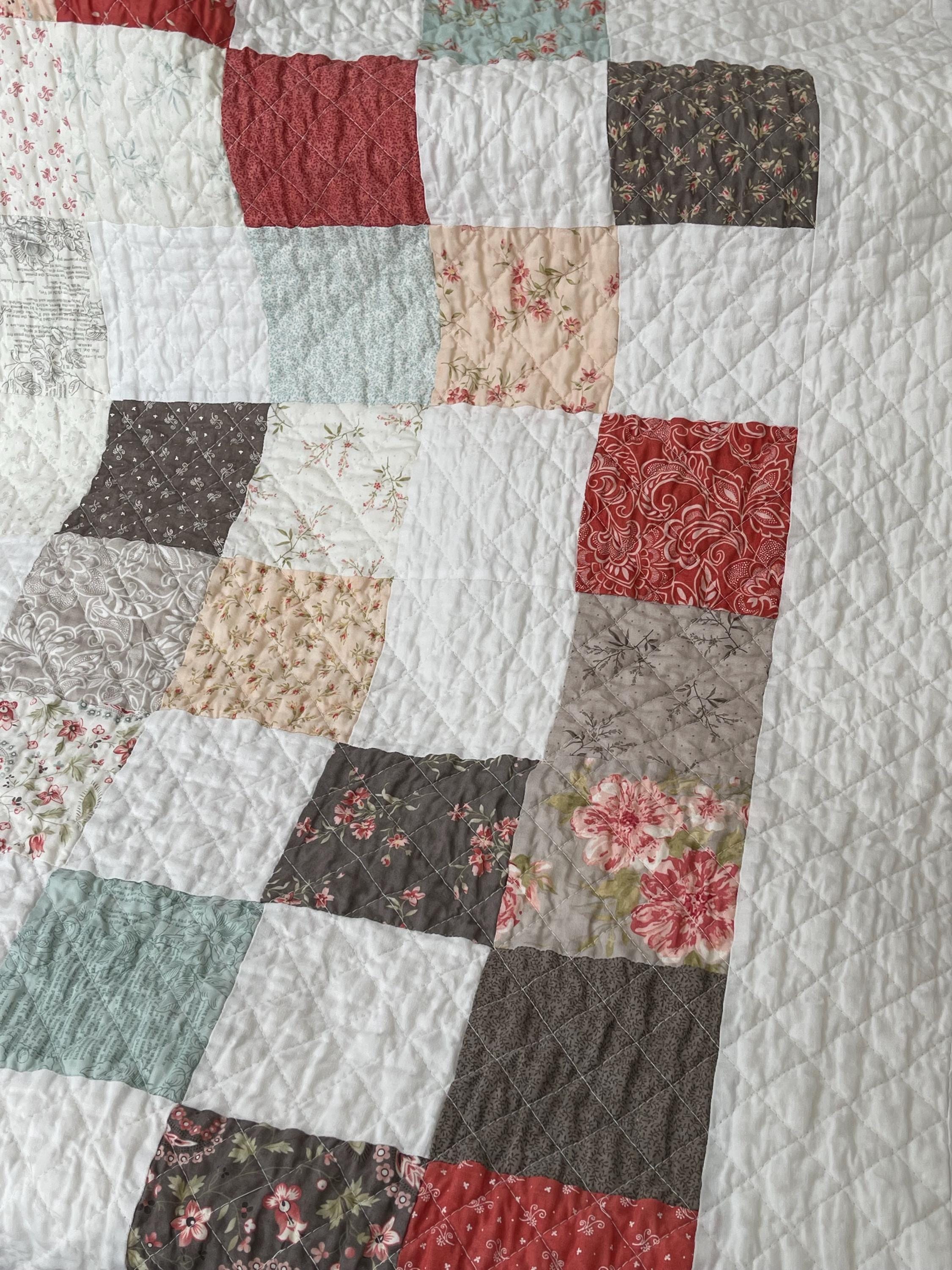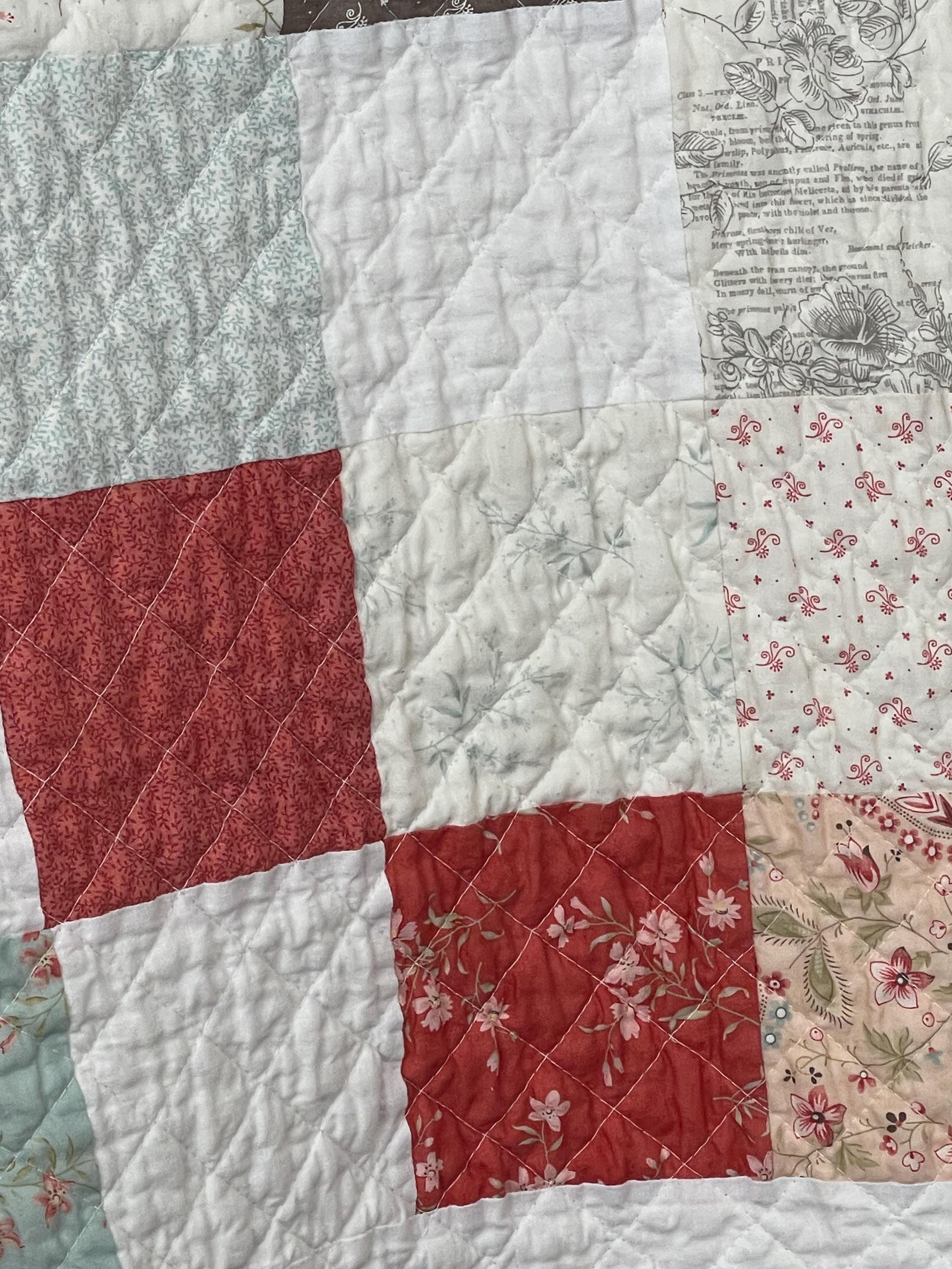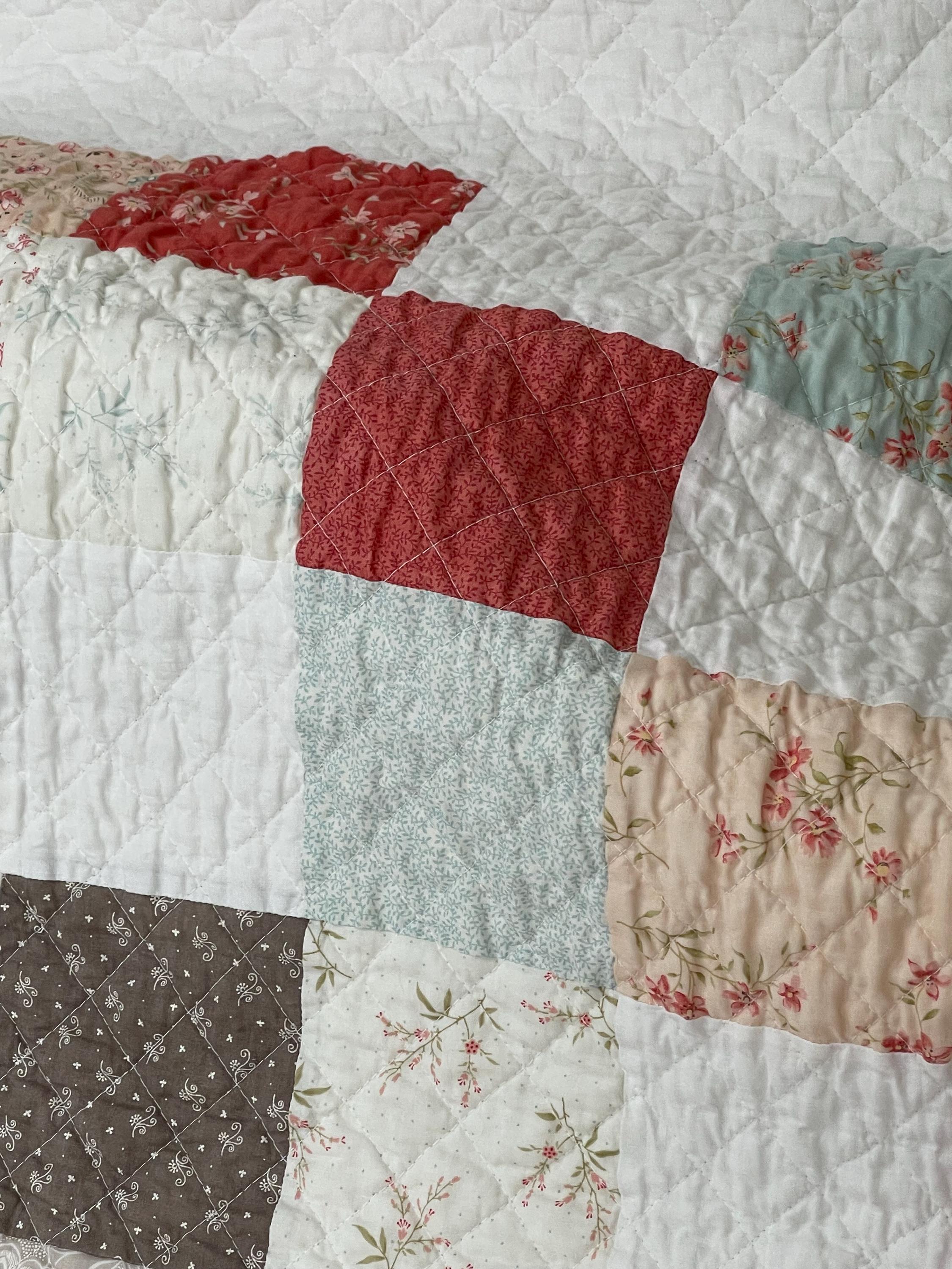 Patchwork Charm: The quilt features a classic Nine-Patch-inspired layout, alternating between charming patterned squares and crisp, solid white squares. This simple design highlights the quality of the fabrics and the meticulous quilting.