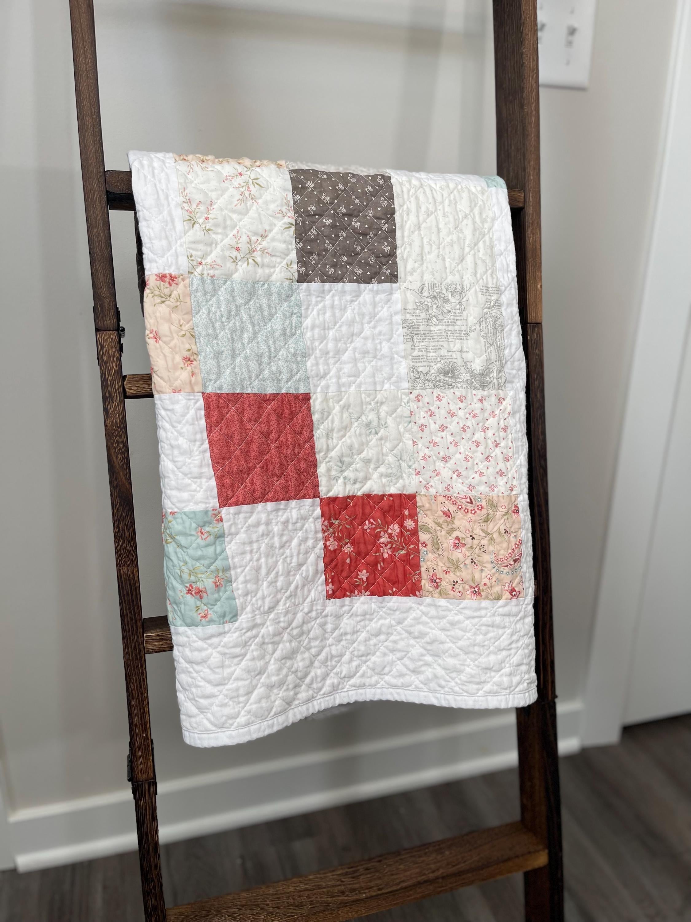 This beautifully handcrafted baby quilt combines the timeless charm of farmhouse style with a soft, comforting color palette, making it the perfect addition to a nursery or a lovely gift for a baby shower. It's more than just a blanket; it's a future heirloom that will be cherished for years to come.