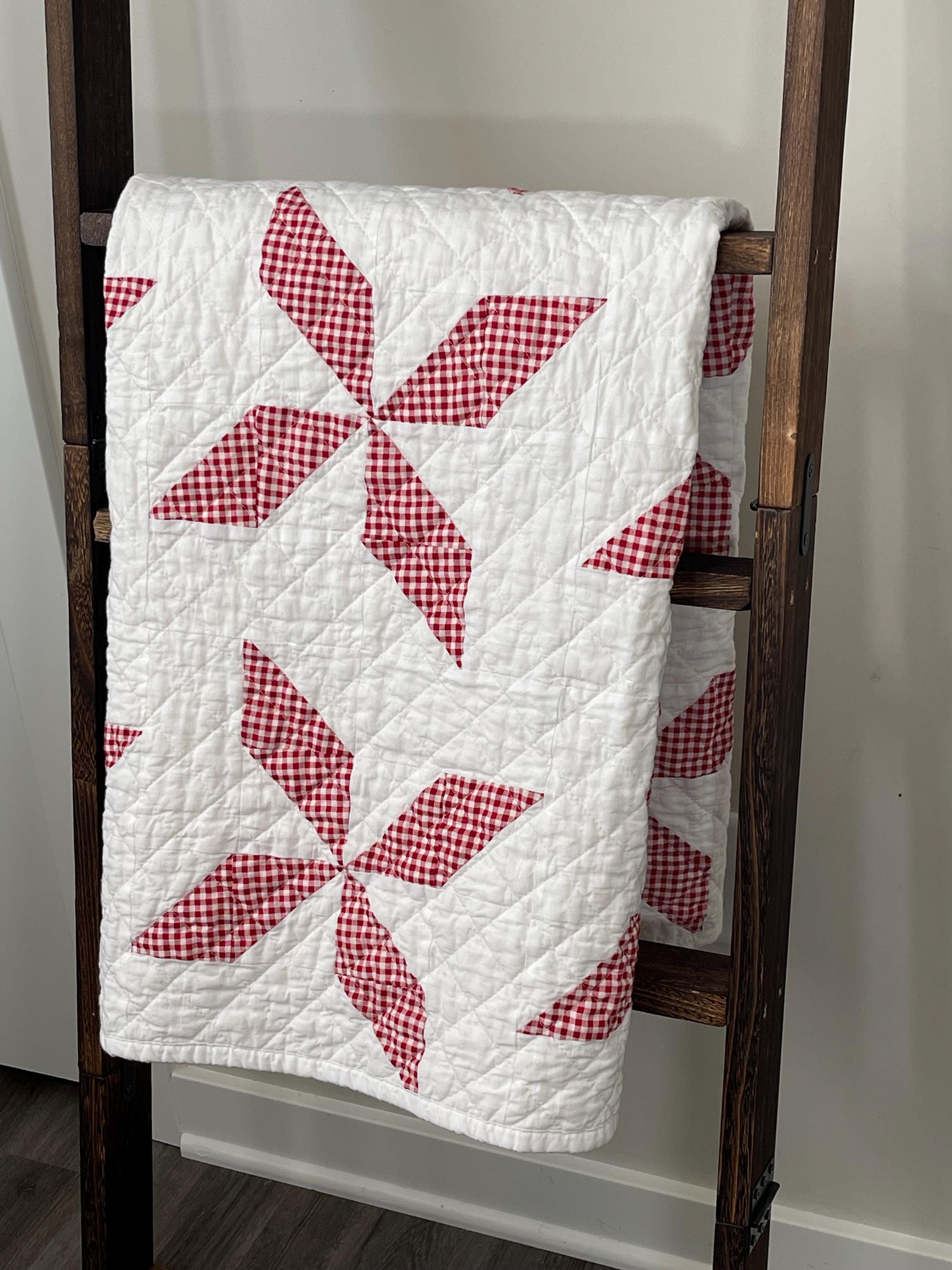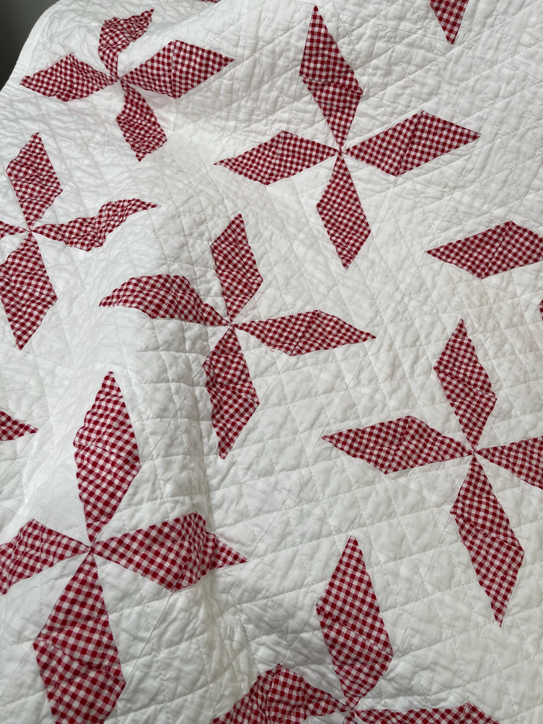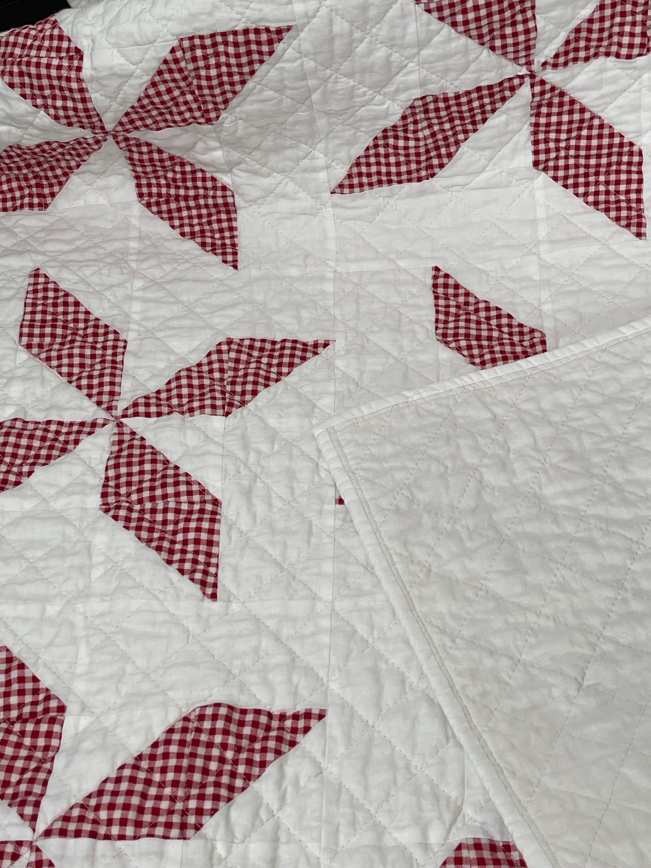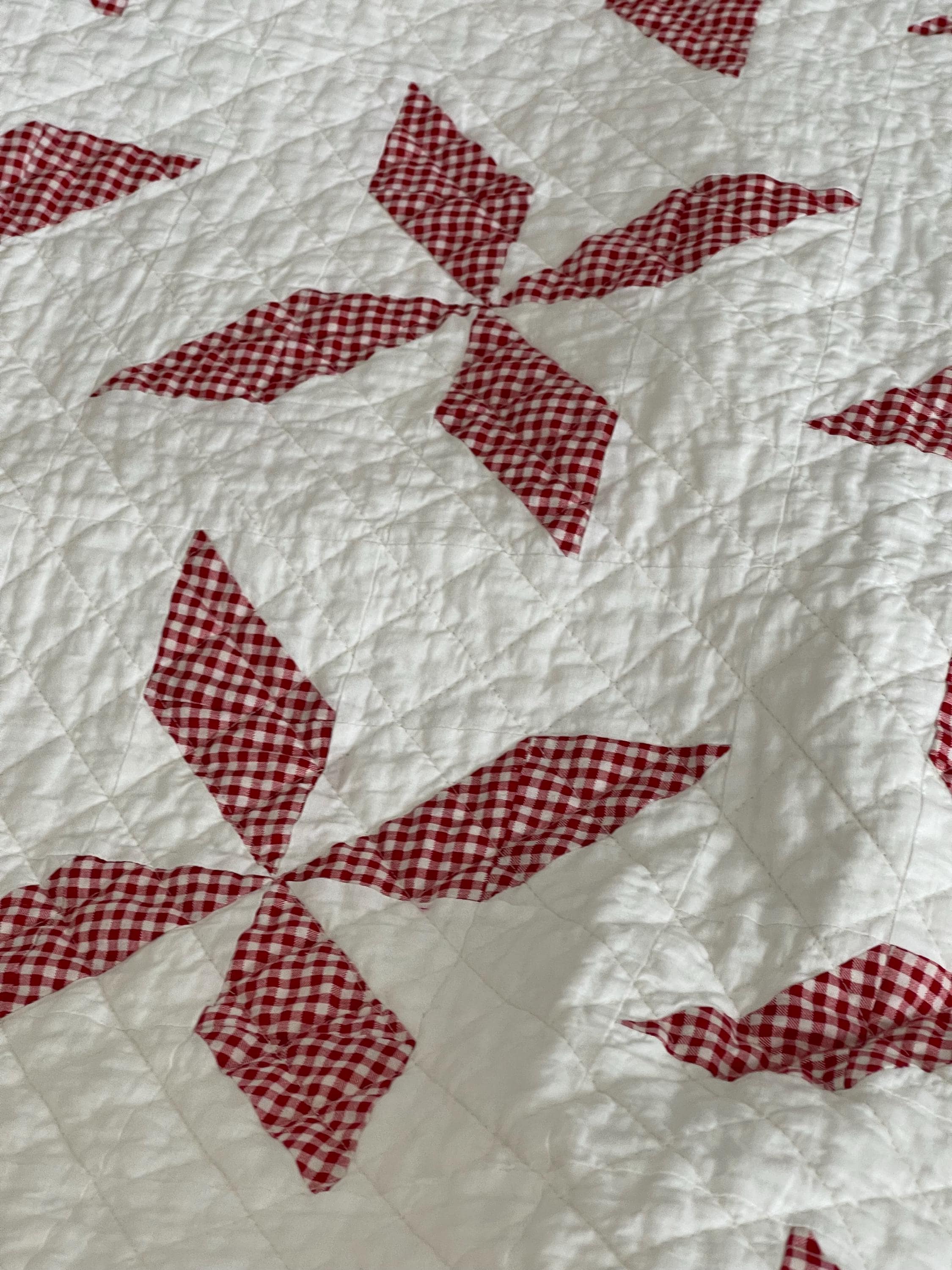 Striking Pattern: The design showcases bold Pinwheel blocks constructed from classic red and white gingham check fabric. The vibrant red against the crisp white background creates a cheerful, iconic look.