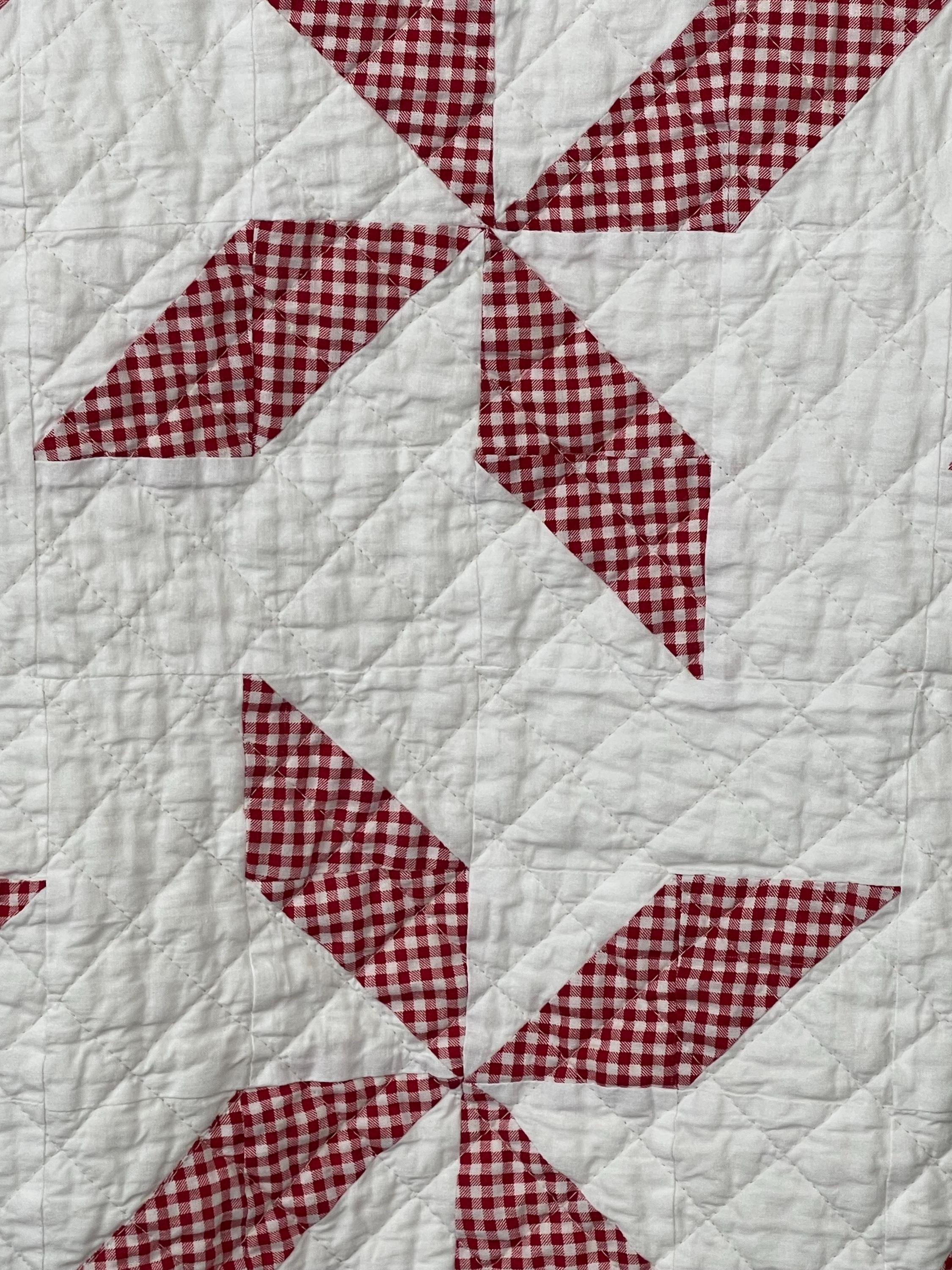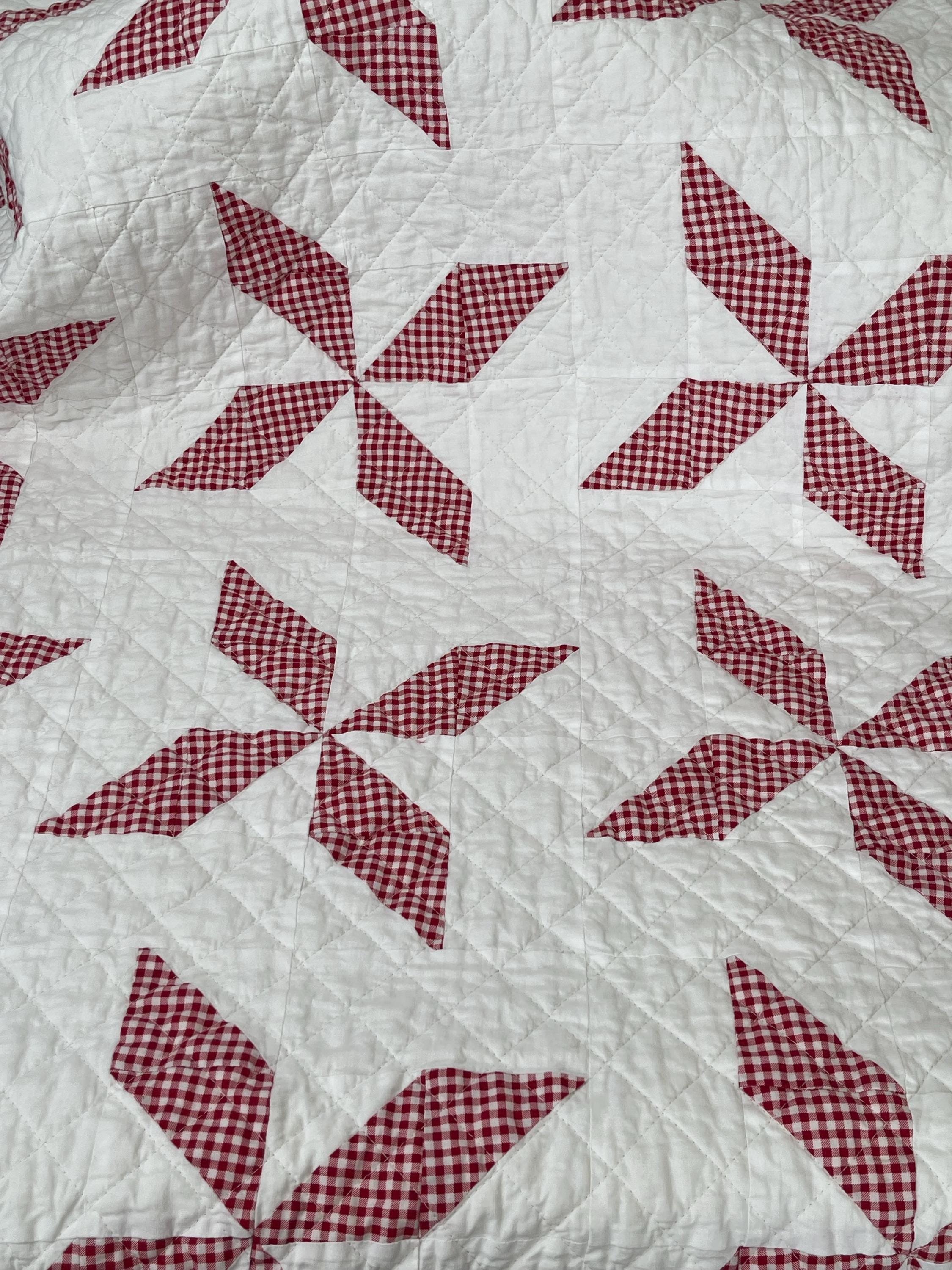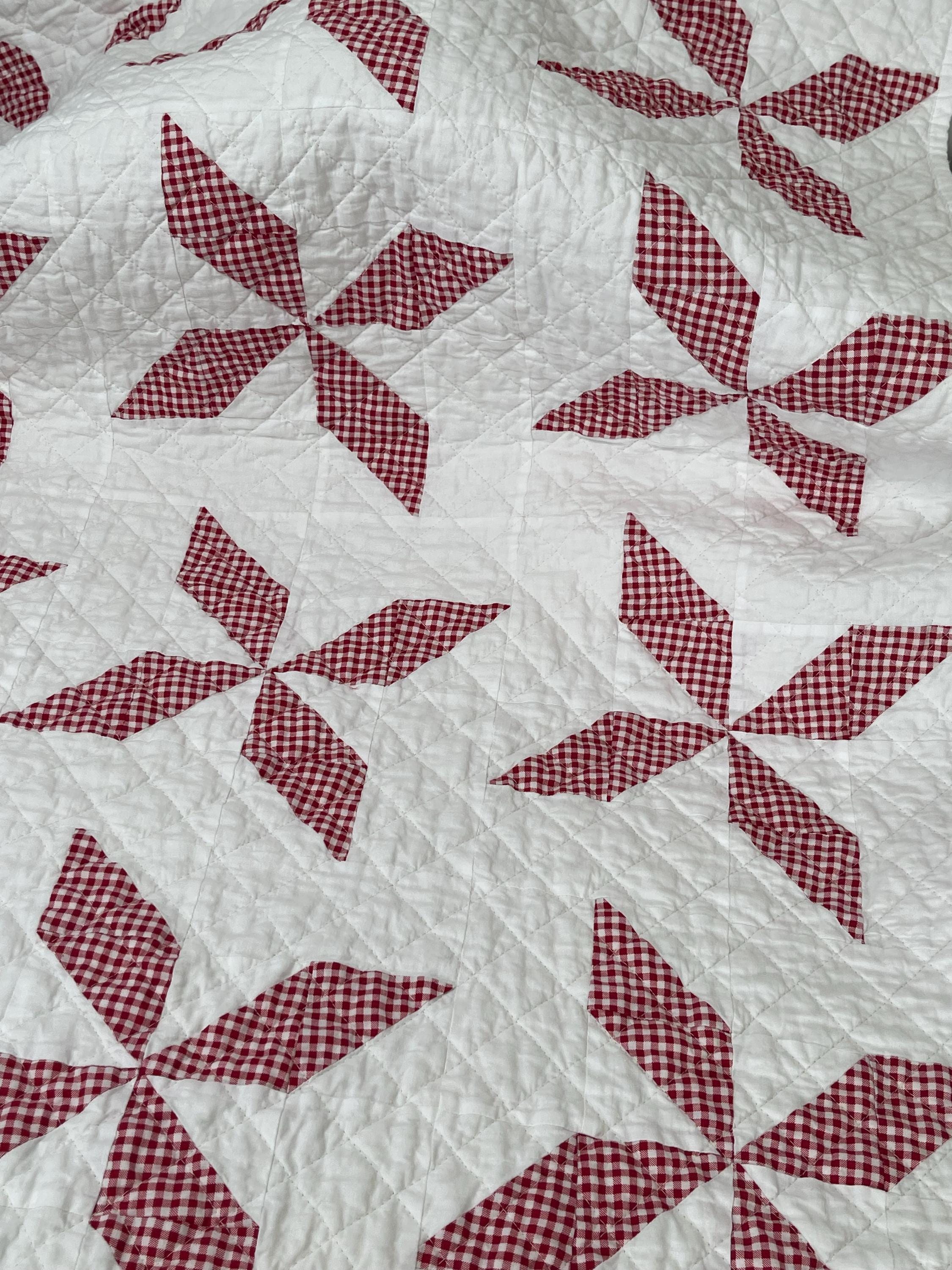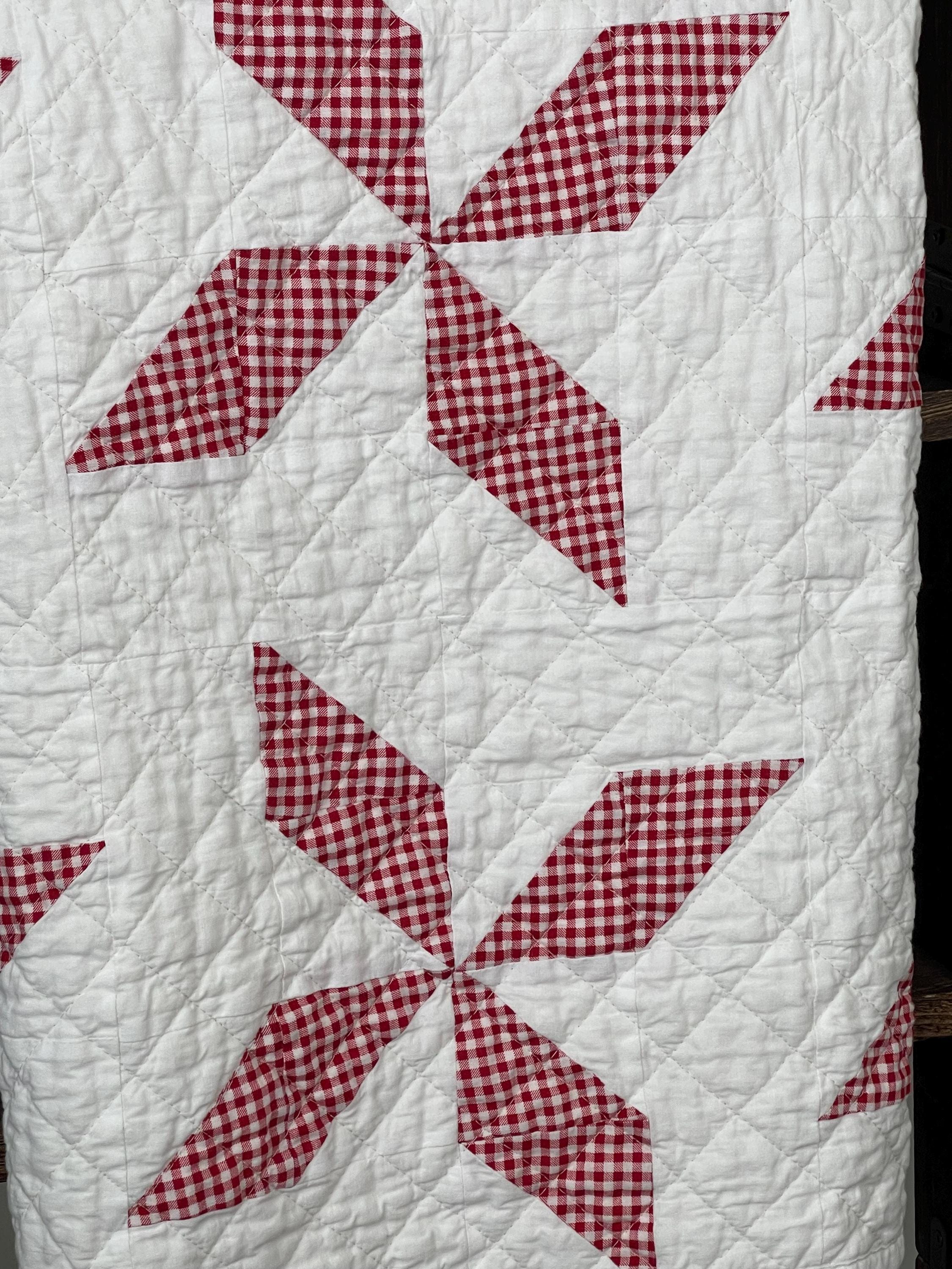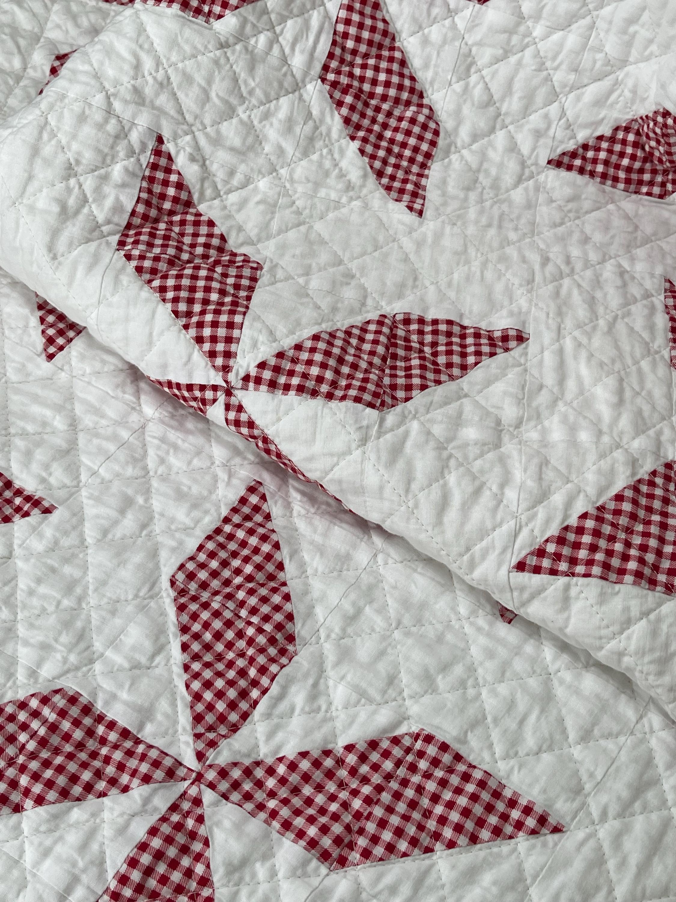 Striking Pattern: The design showcases bold Pinwheel blocks constructed from classic red and white gingham check fabric. The vibrant red against the crisp white background creates a cheerful, iconic look.