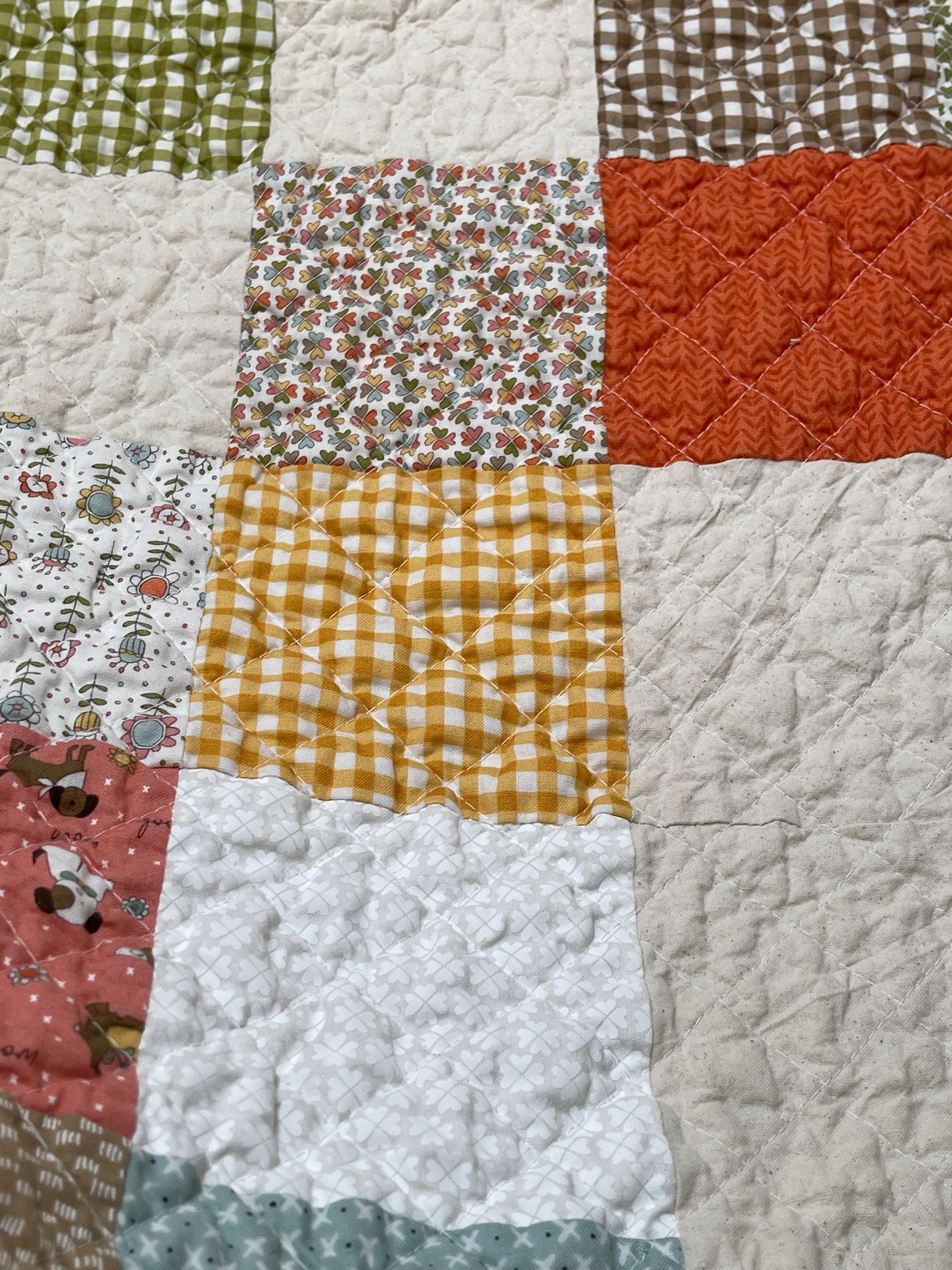 * Vibrant Patchwork Design: A cozy mix of colors including mustard yellow, coral pink, earthy brown, sage green, burnt orange, and soft white. Patterns include gingham, florals, chevrons, and small geometric prints.