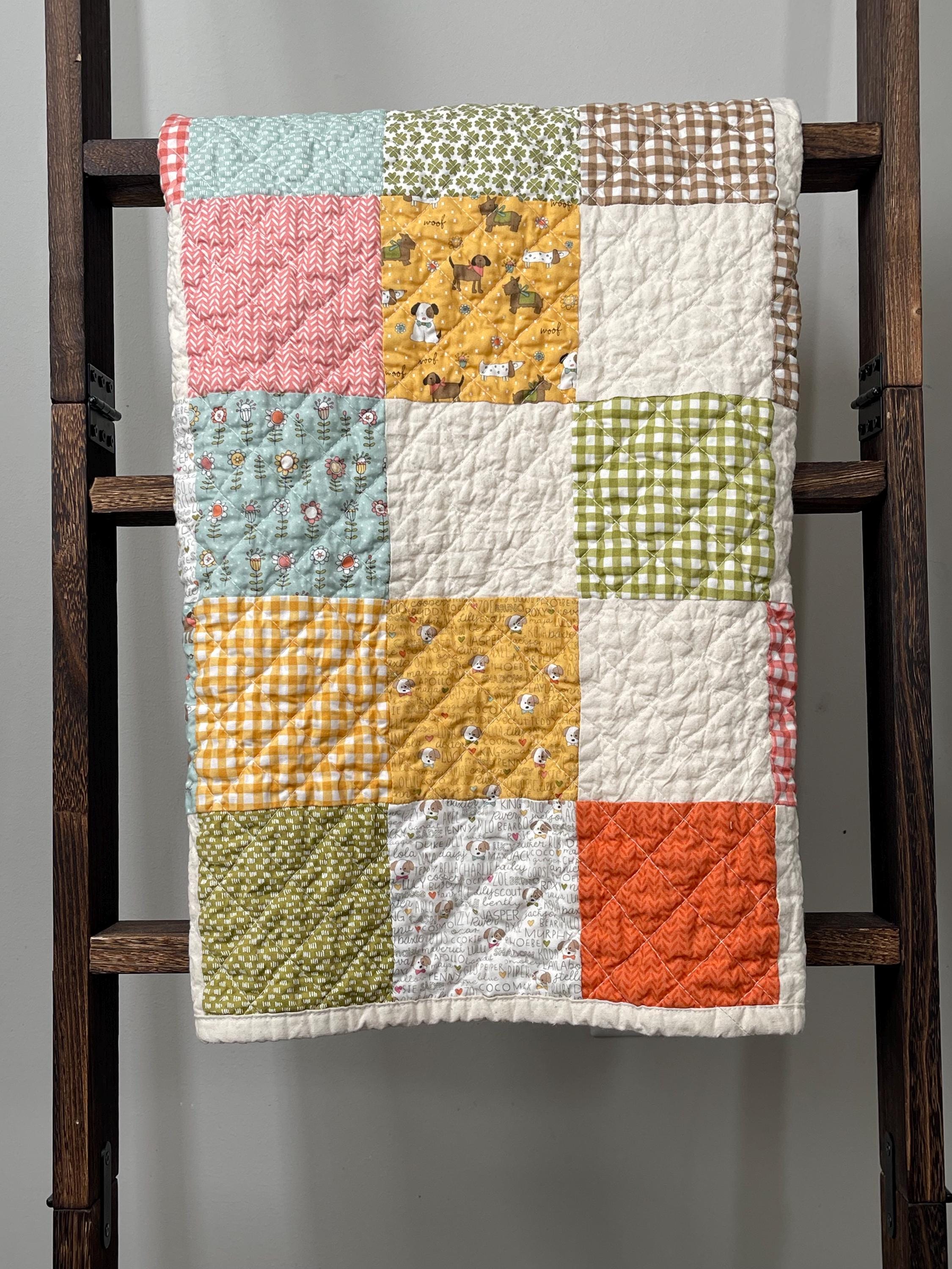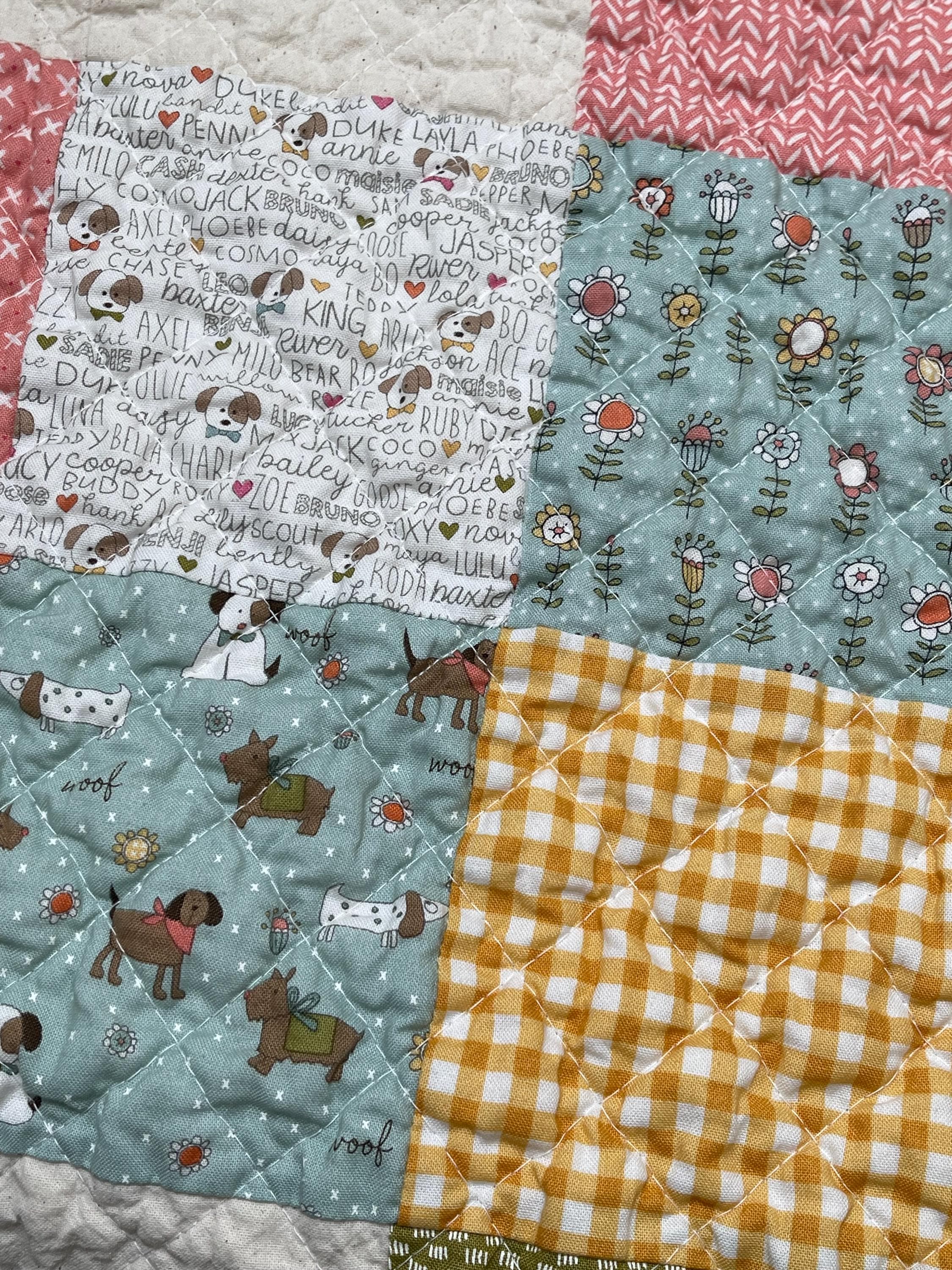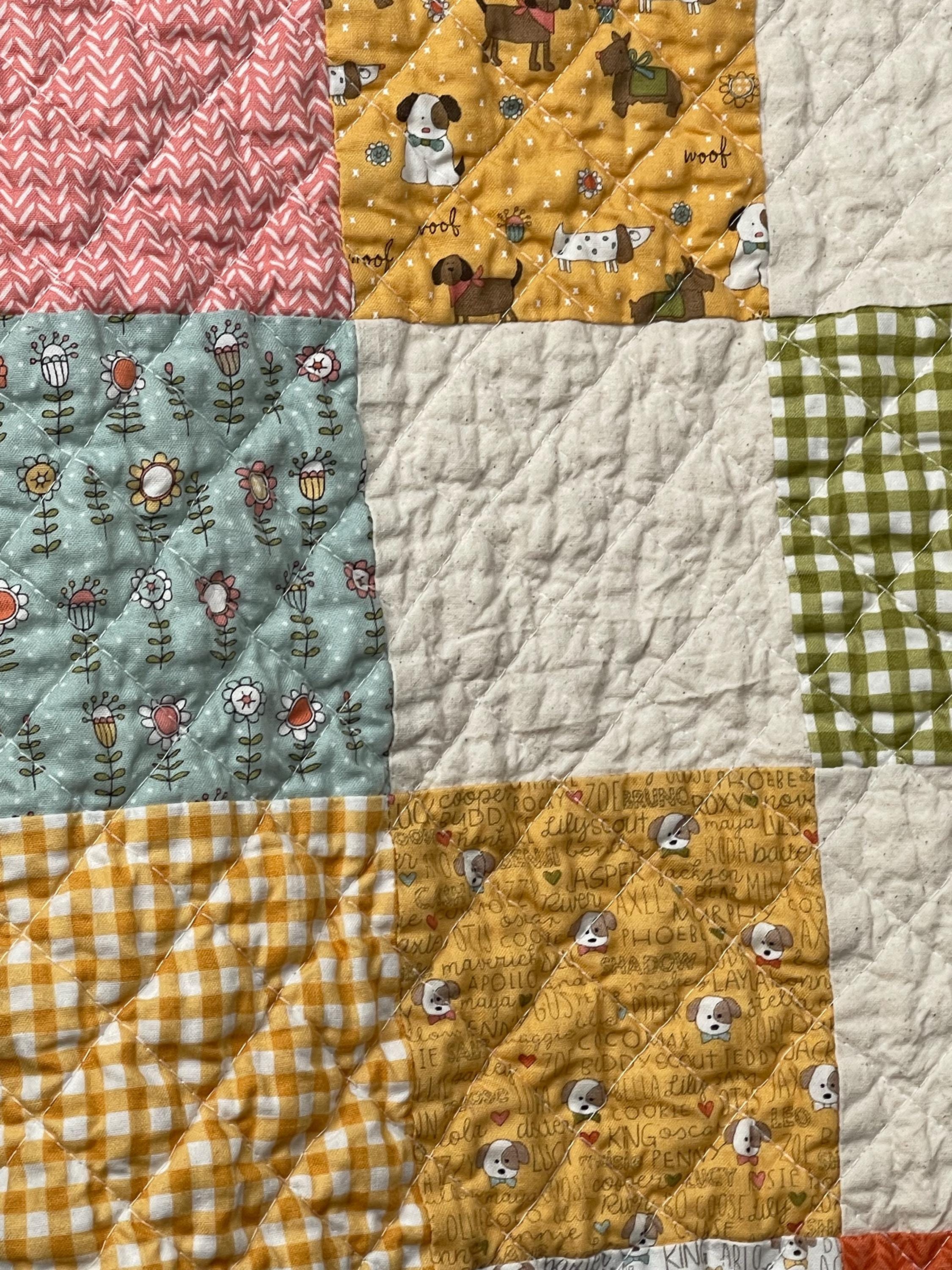 Celebrate your love for dogs with this charming, one-of-a-kind patchwork quilt! This cozy muslin and cotton blanket is a beautiful blend of whimsical puppy prints, classic gingham checks, and cheerful florals, perfect for the dog lover in your life or as a unique, personalized baby blanket.