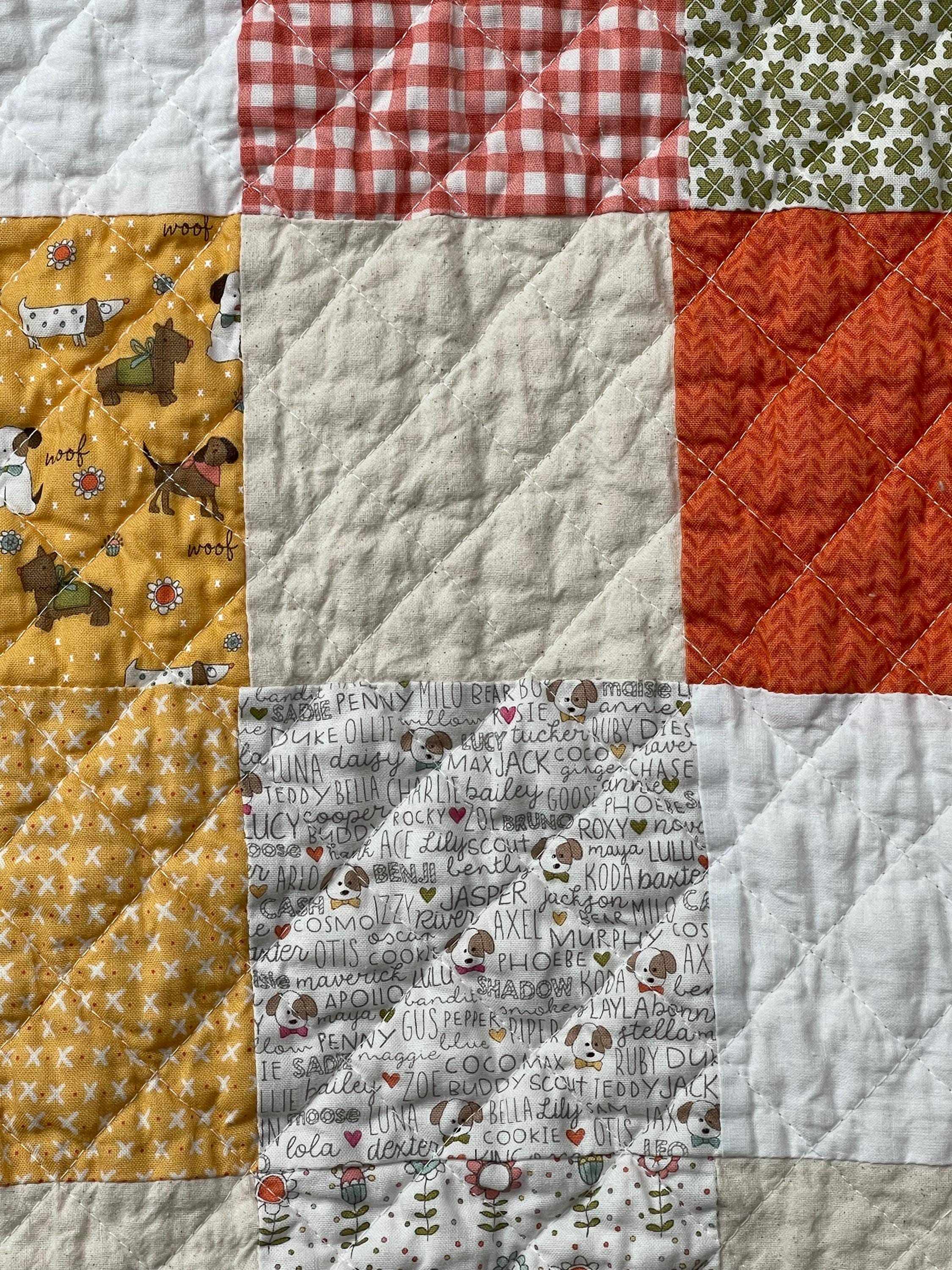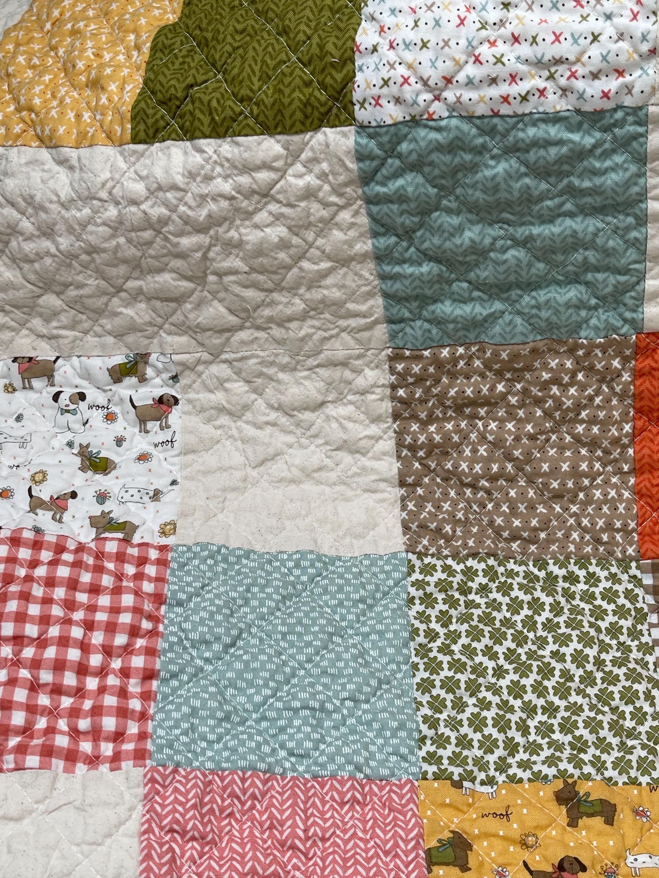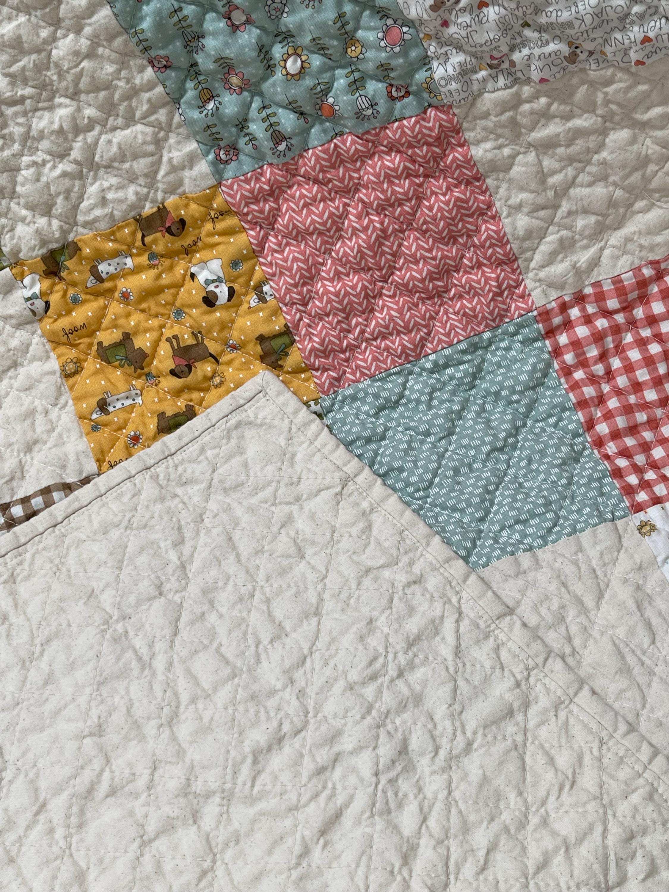 Celebrate your love for dogs with this charming, one-of-a-kind patchwork quilt! This cozy muslin and cotton blanket is a beautiful blend of whimsical puppy prints, classic gingham checks, and cheerful florals, perfect for the dog lover in your life or as a unique, personalized baby blanket.