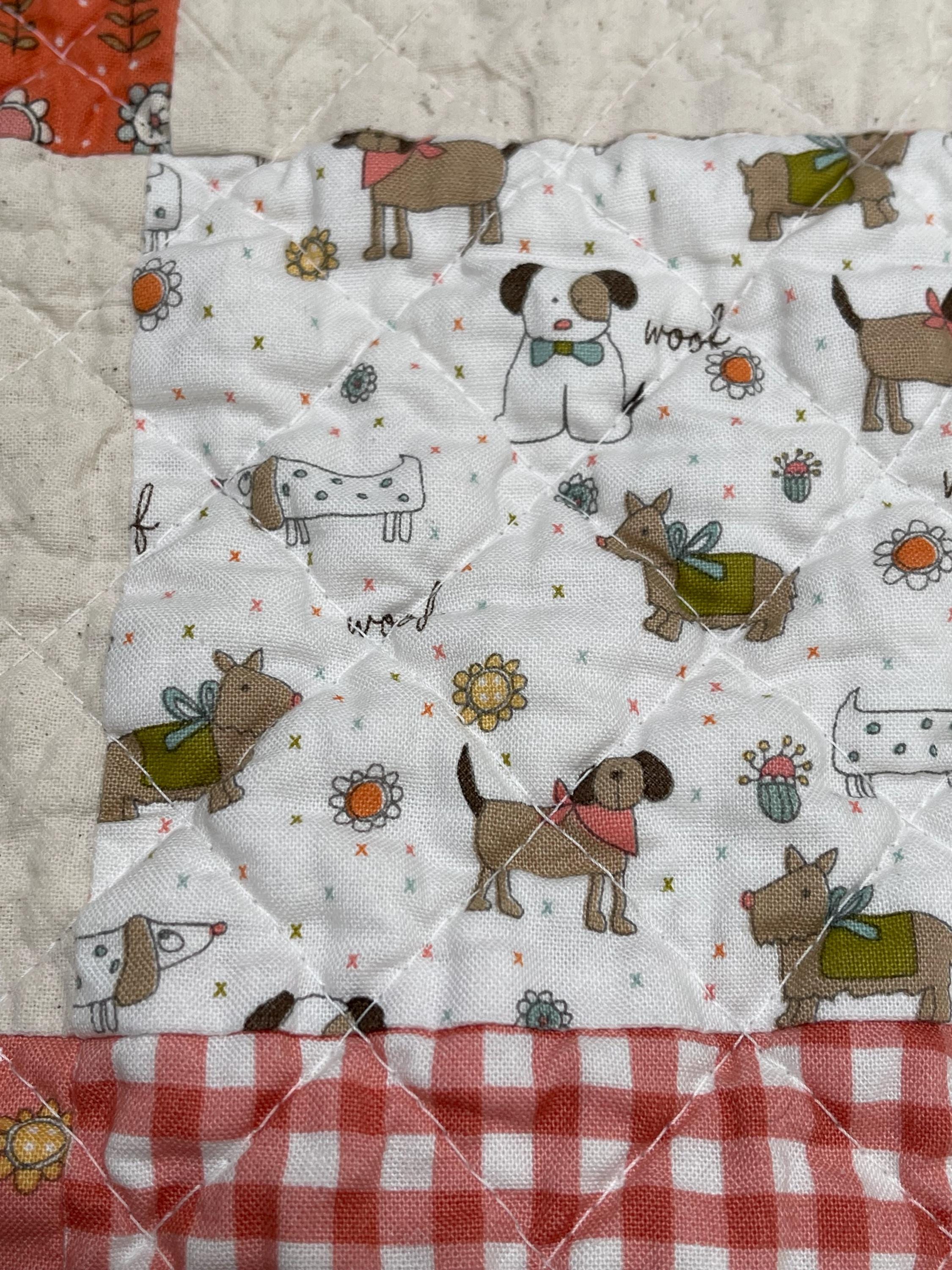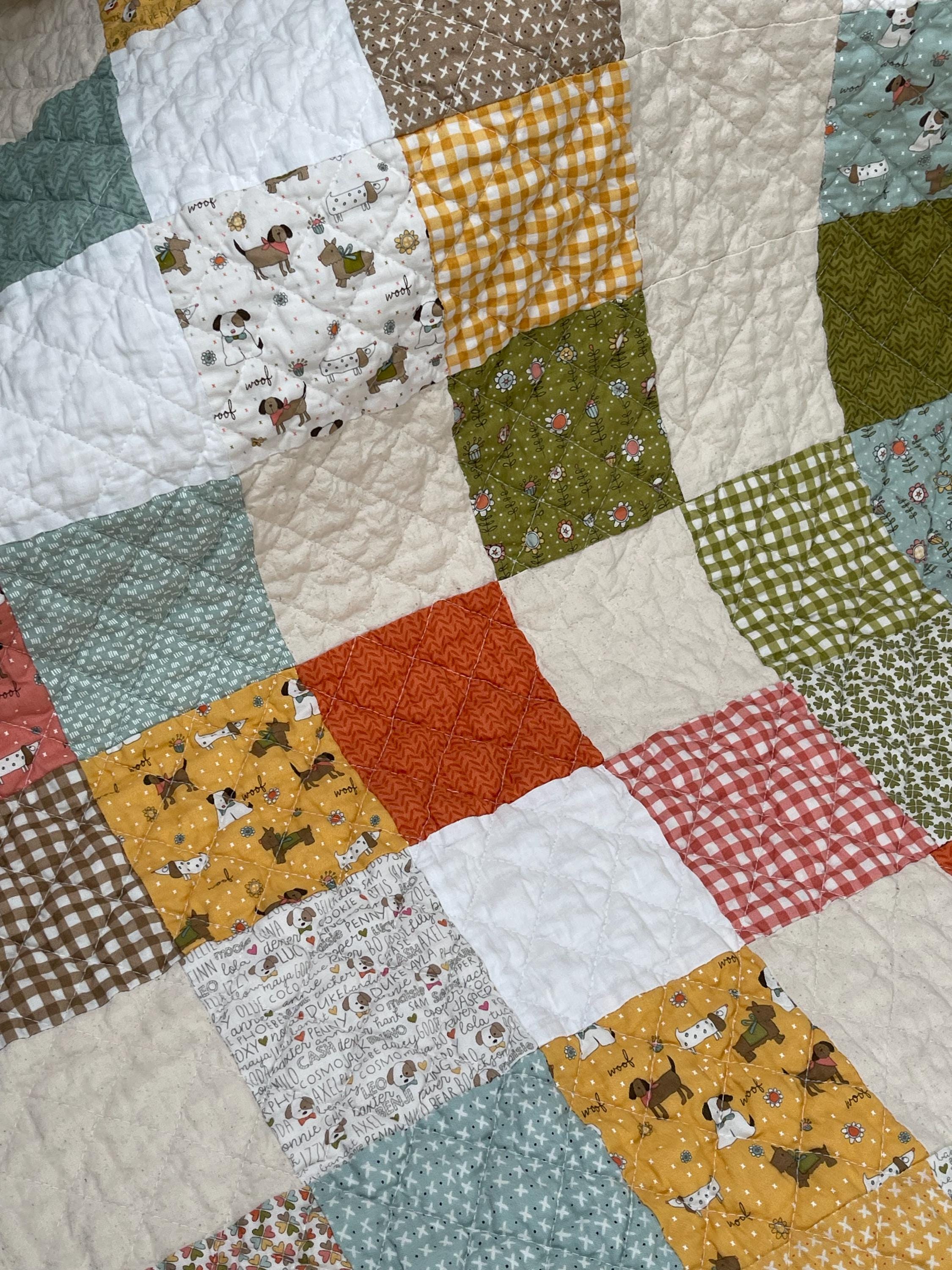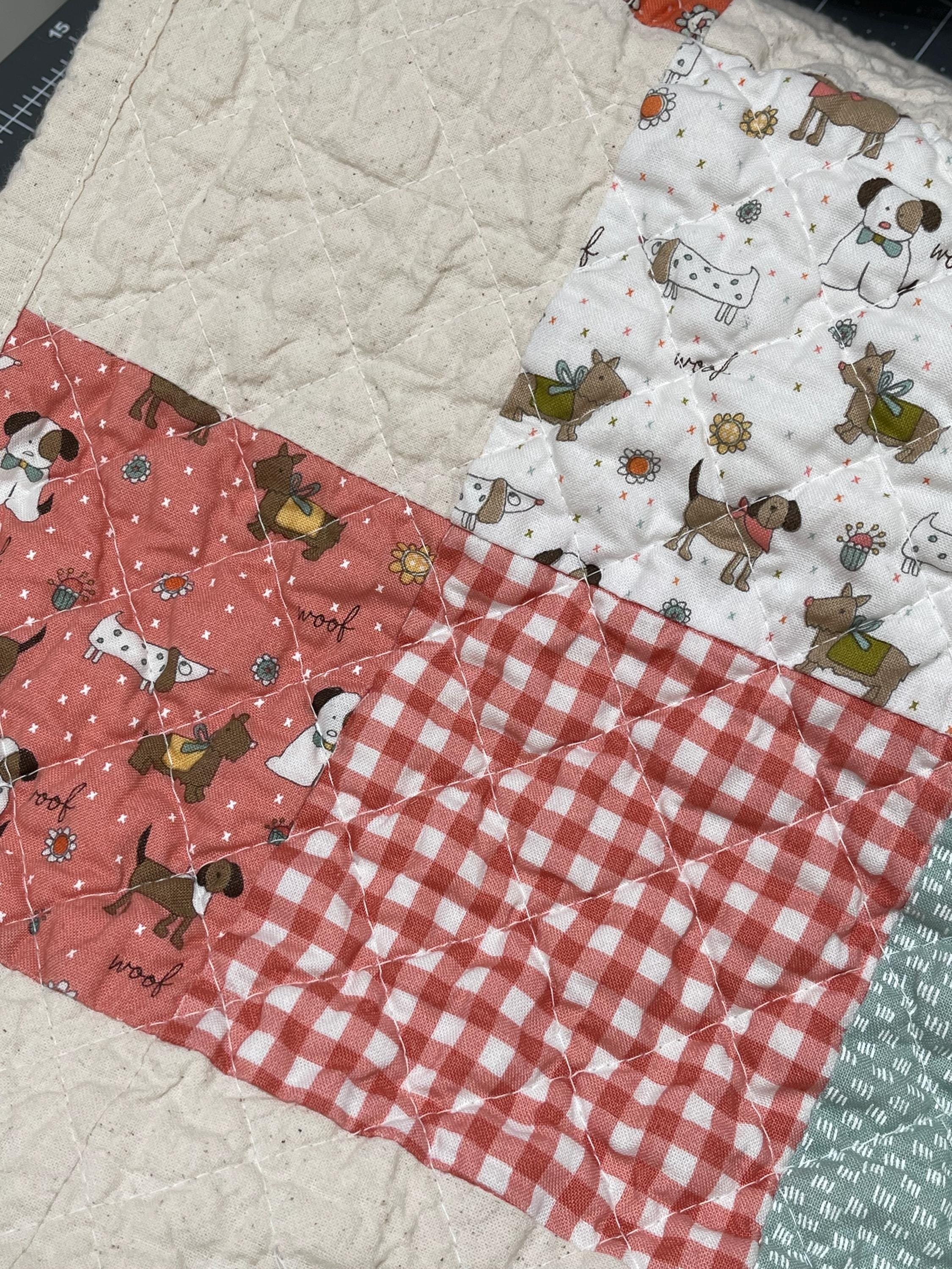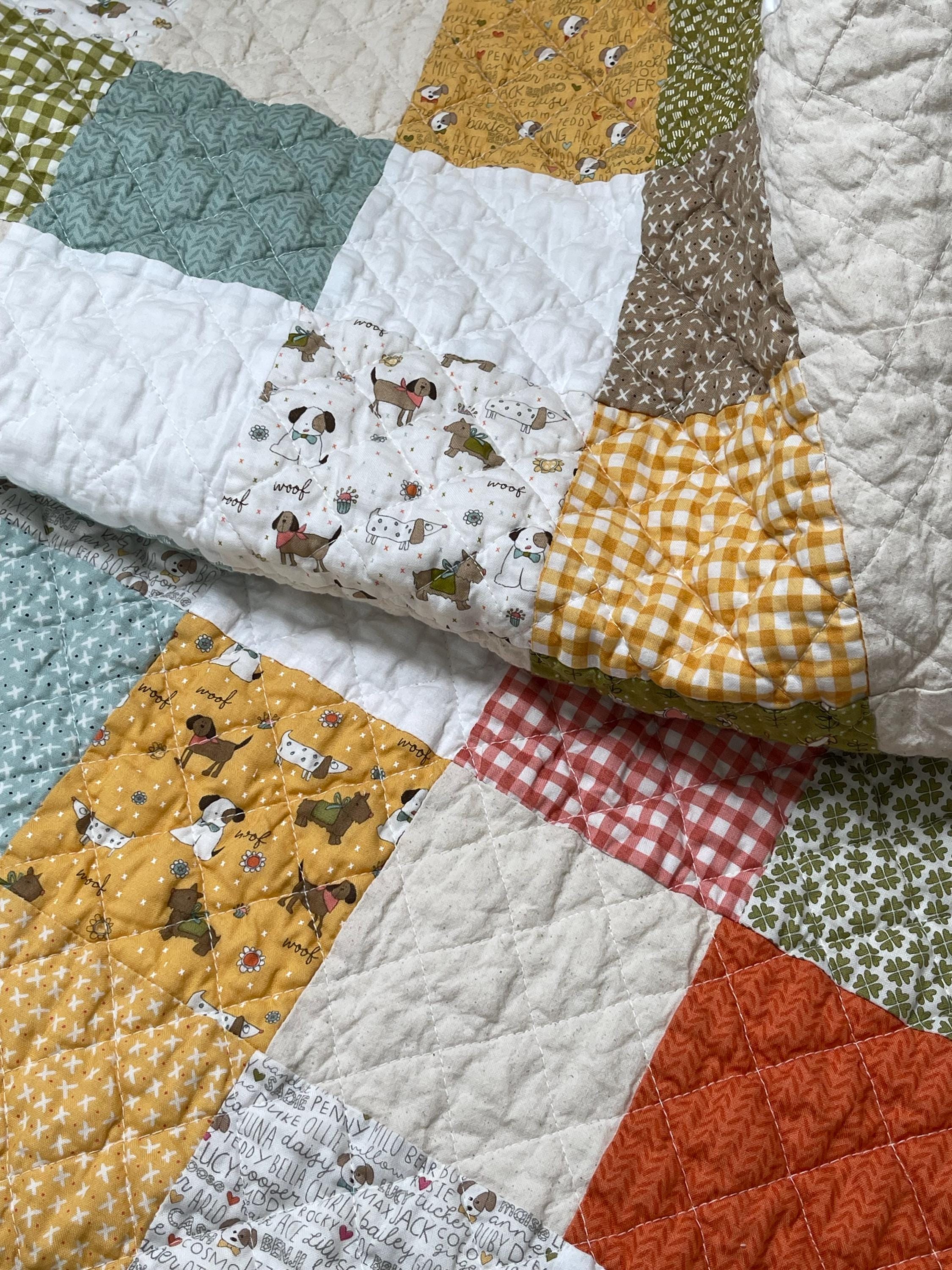 Celebrate your love for dogs with this charming, one-of-a-kind patchwork quilt! This cozy muslin and cotton blanket is a beautiful blend of whimsical puppy prints, classic gingham checks, and cheerful florals, perfect for the dog lover in your life or as a unique, personalized baby blanket.
