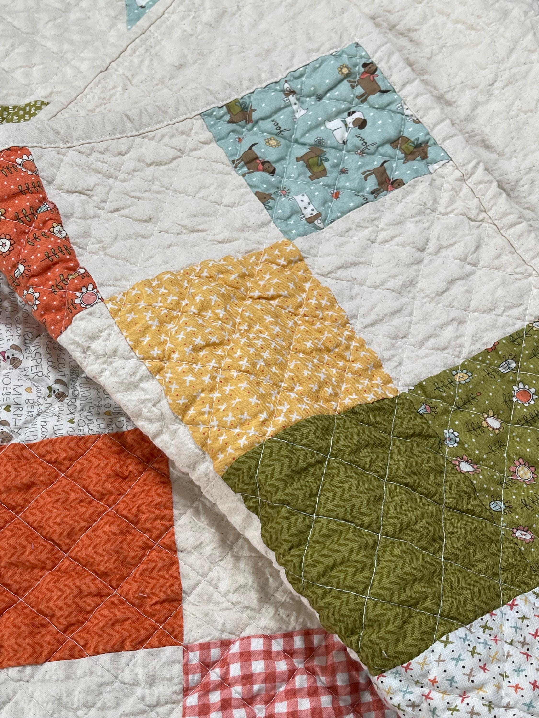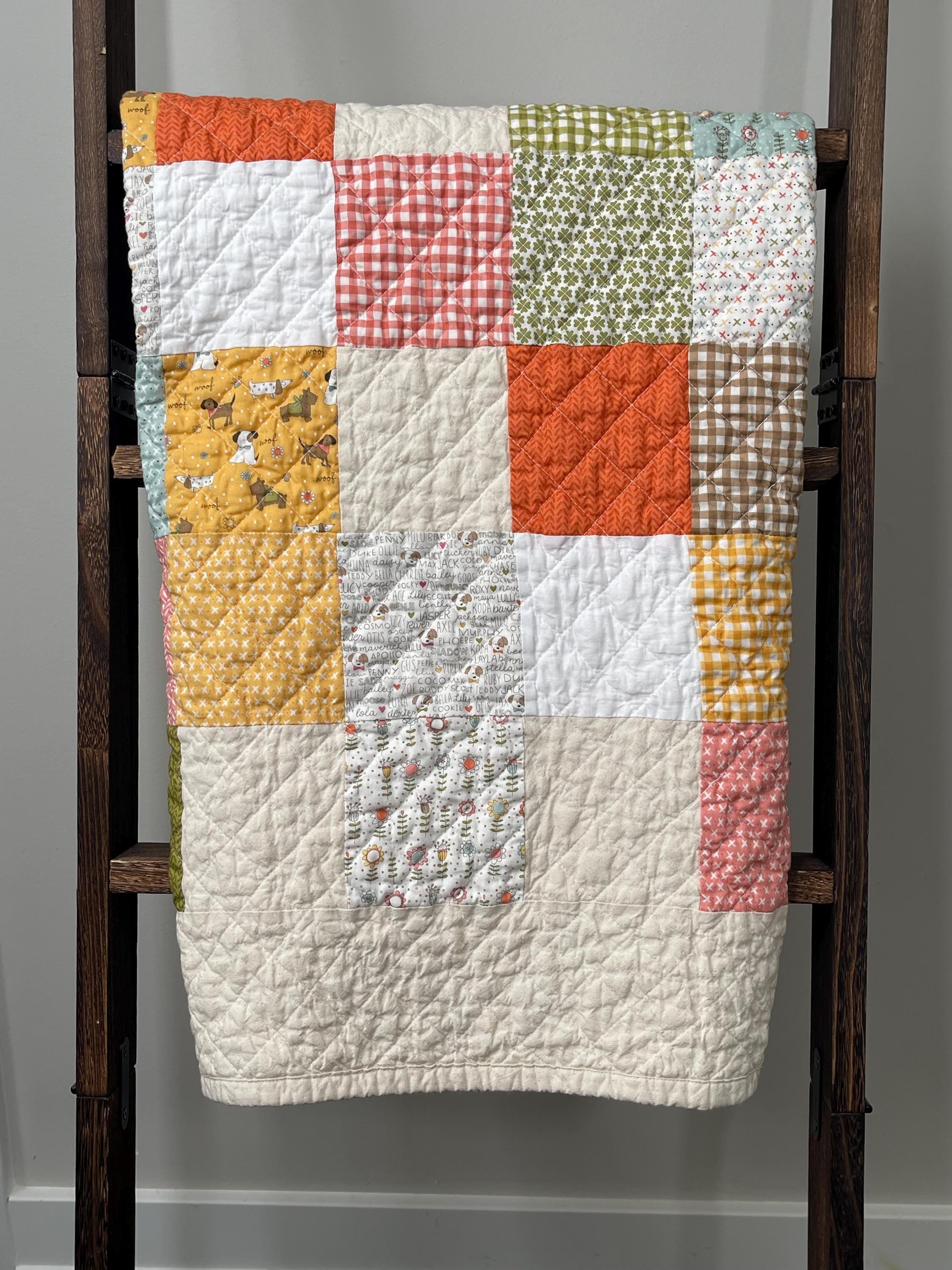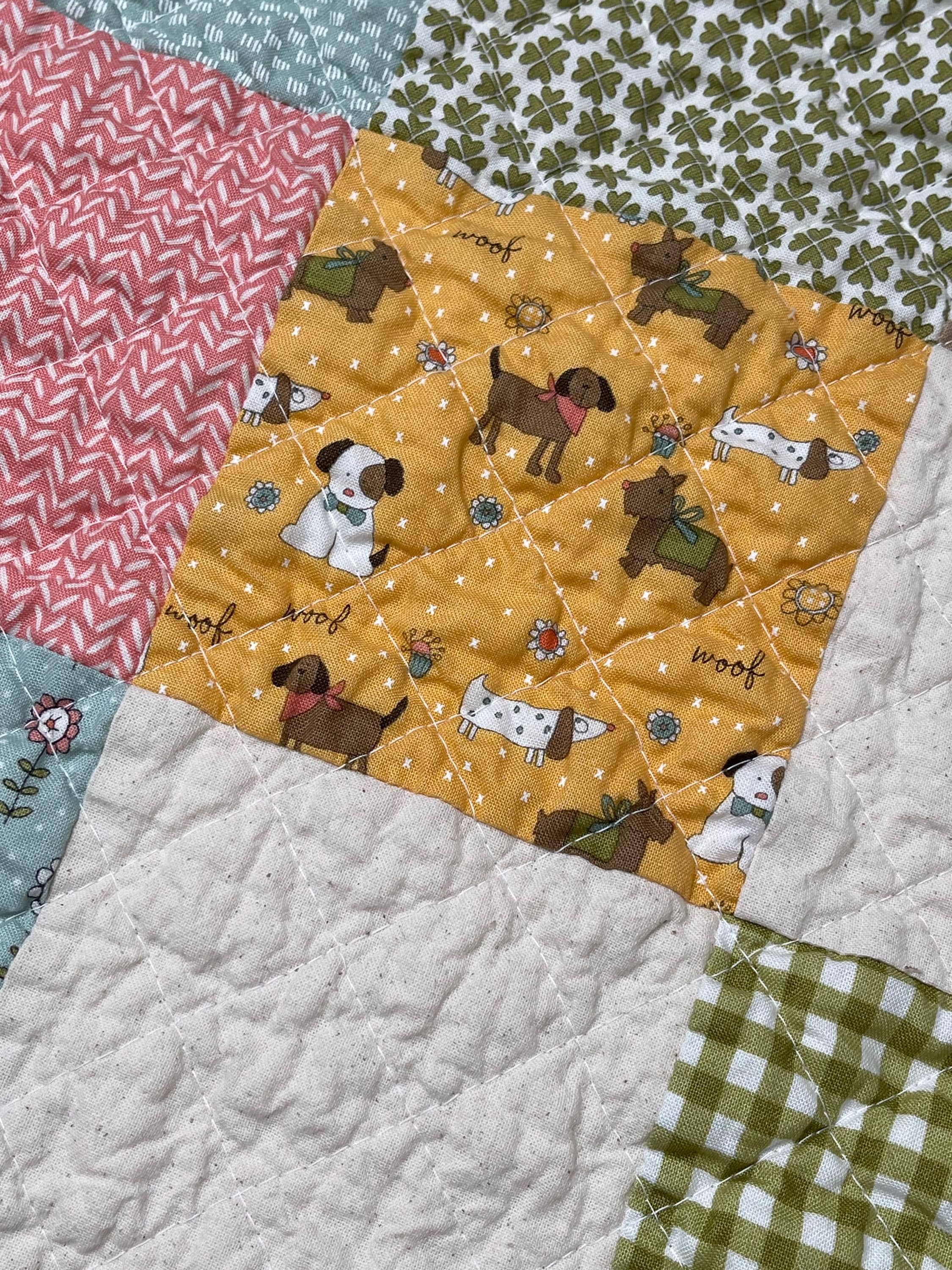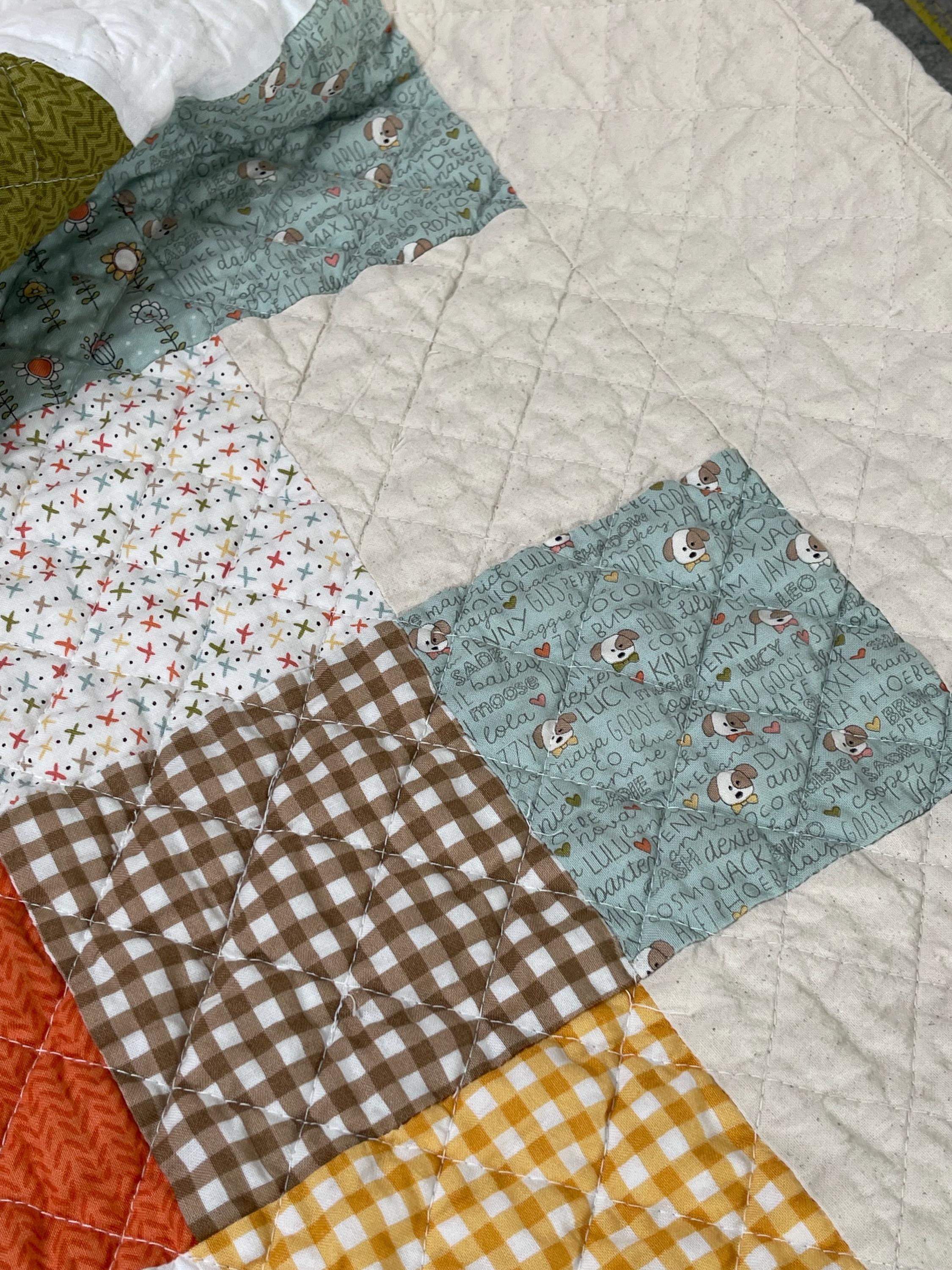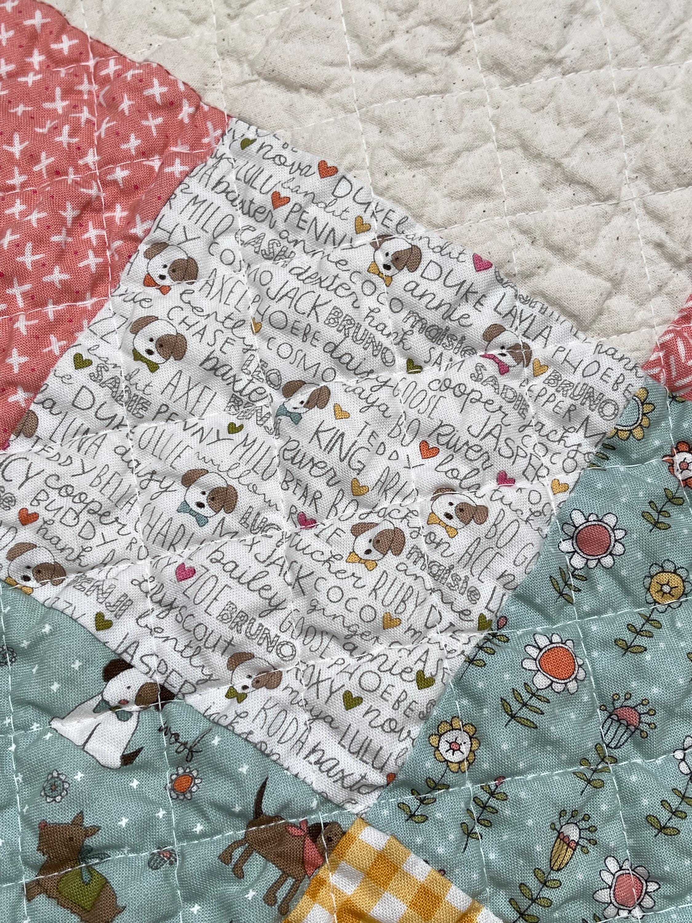 Celebrate your love for dogs with this charming, one-of-a-kind patchwork quilt! This cozy muslin and cotton blanket is a beautiful blend of whimsical puppy prints, classic gingham checks, and cheerful florals, perfect for the dog lover in your life or as a unique, personalized baby blanket.