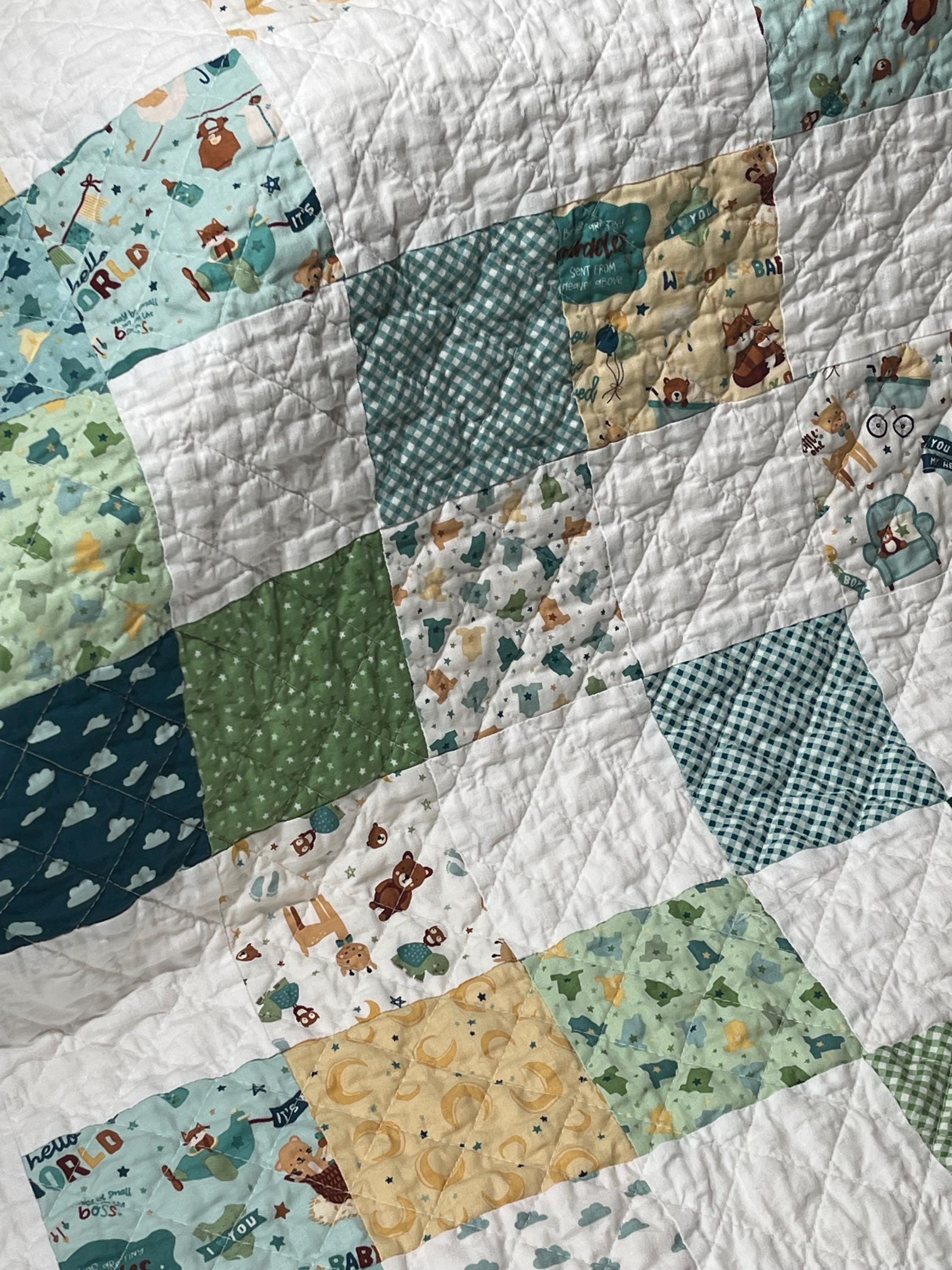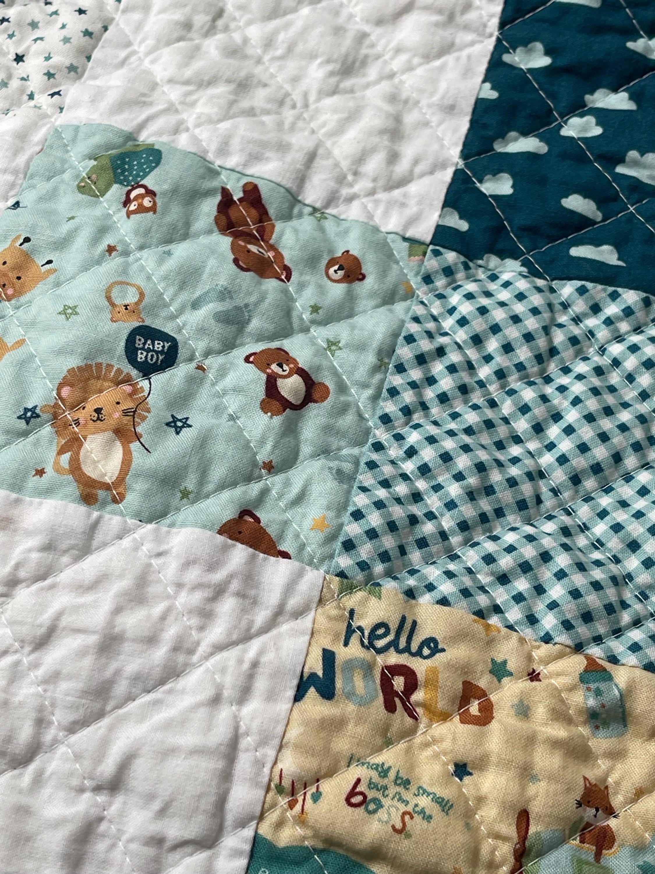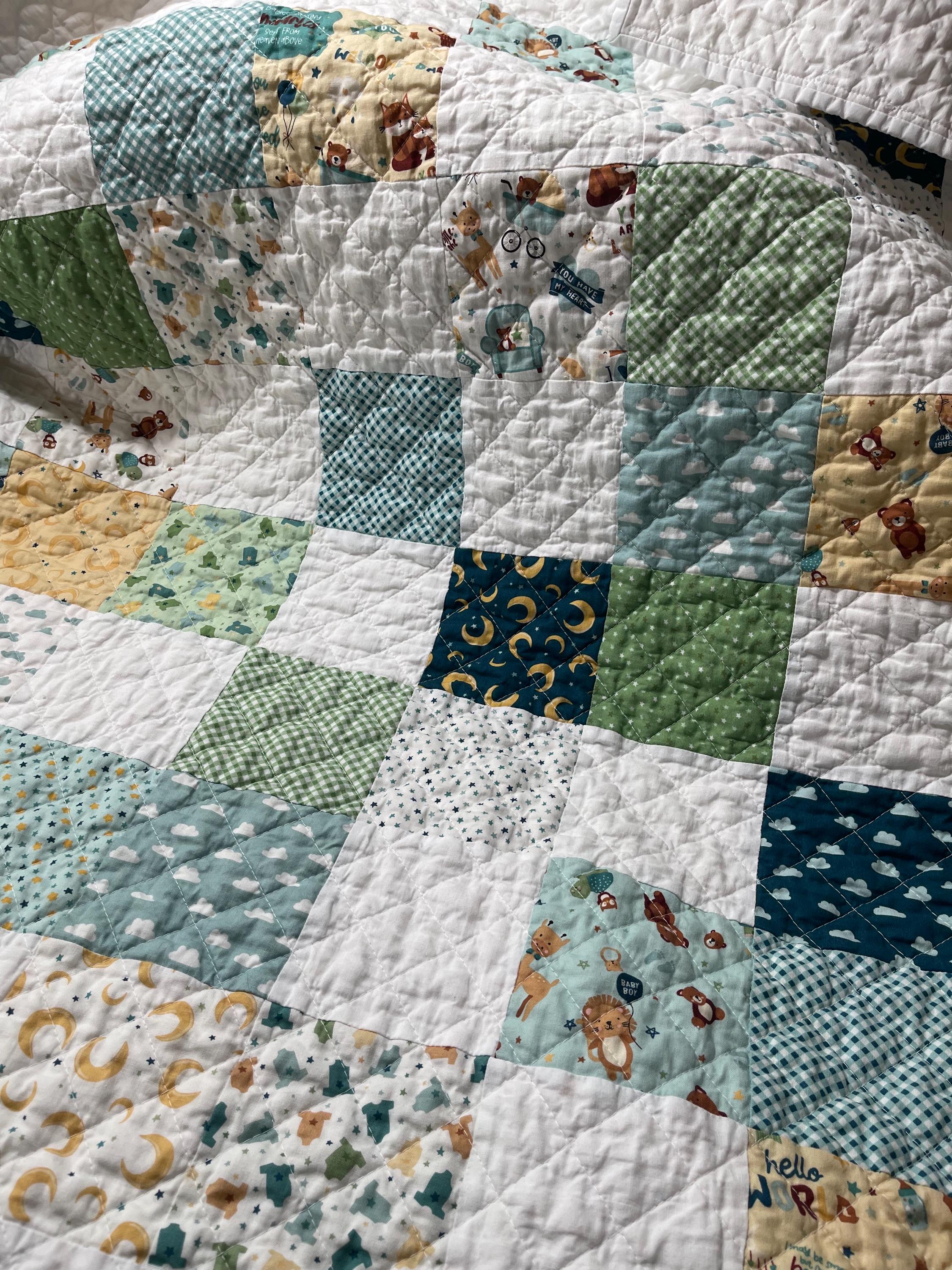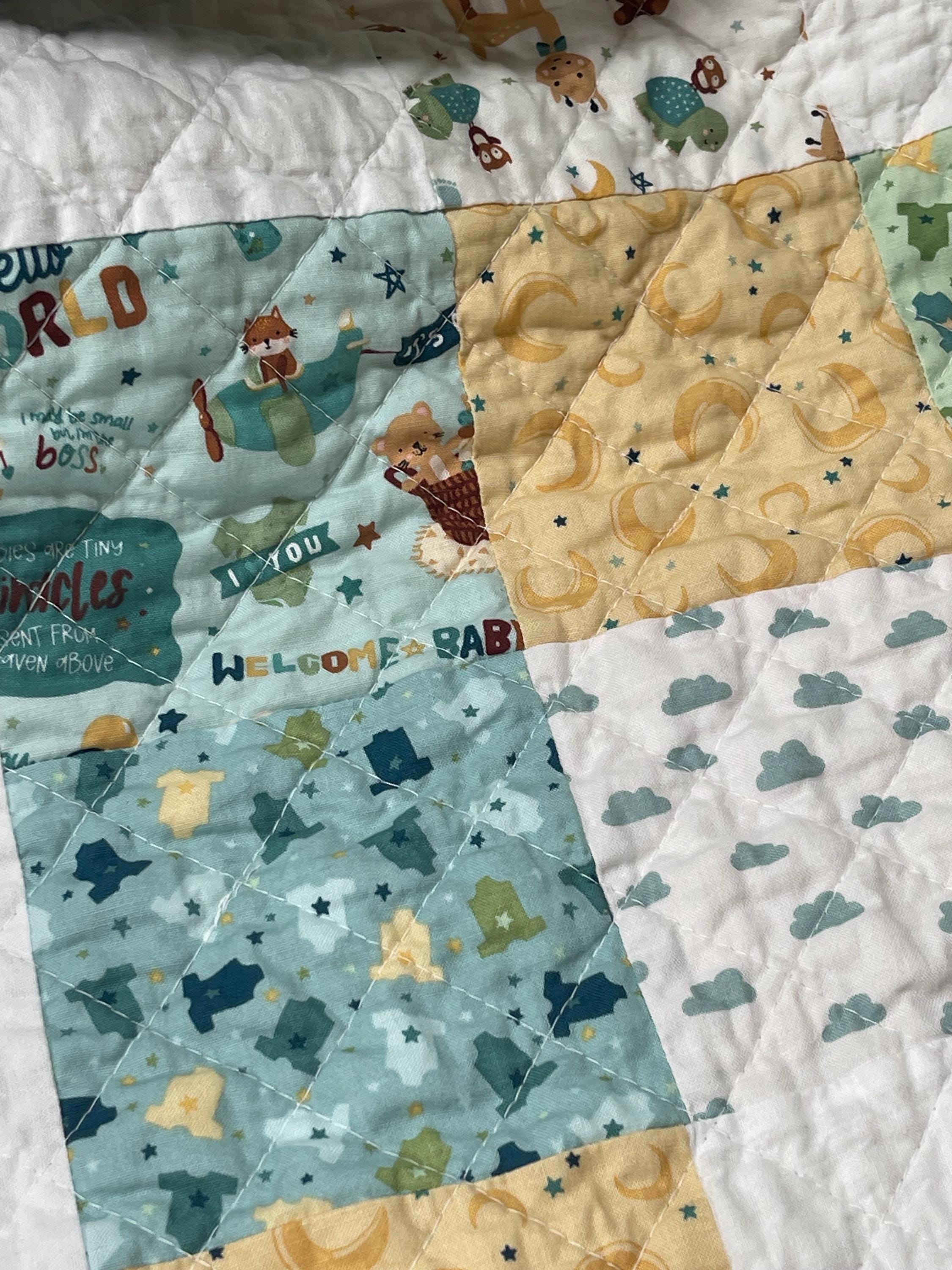 Give the perfect gift with this charming, handmade patchwork baby quilt, a cozy treasure that will be cherished for years to come. Crafted with love, this quilt features a delightful mix of whimsical patterns in soothing, gender-neutral colors perfect for a little boy's nursery.
