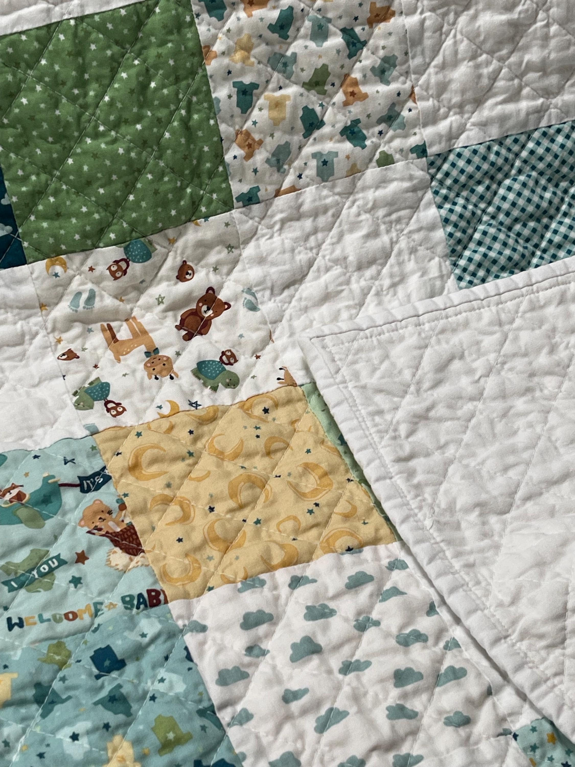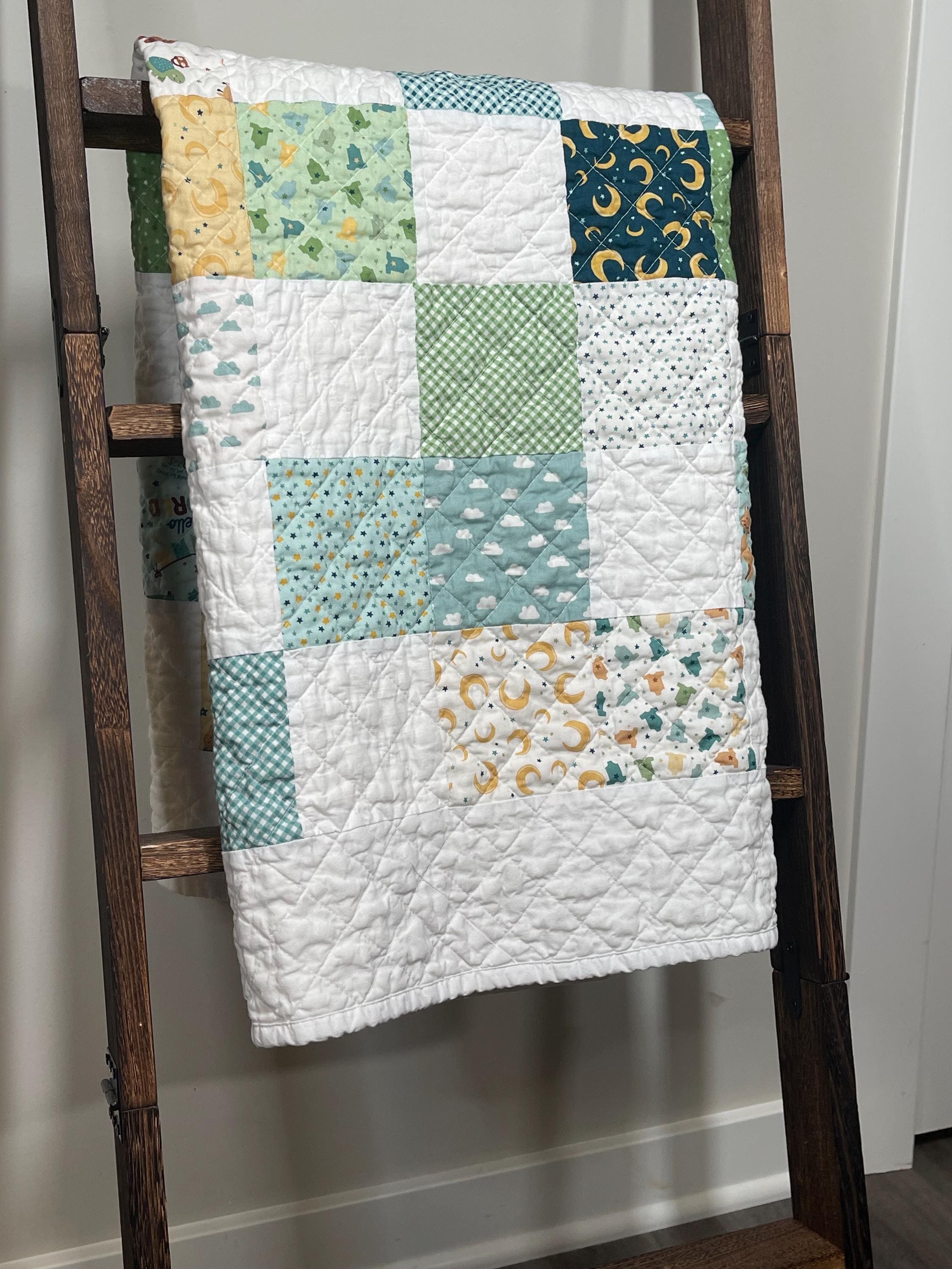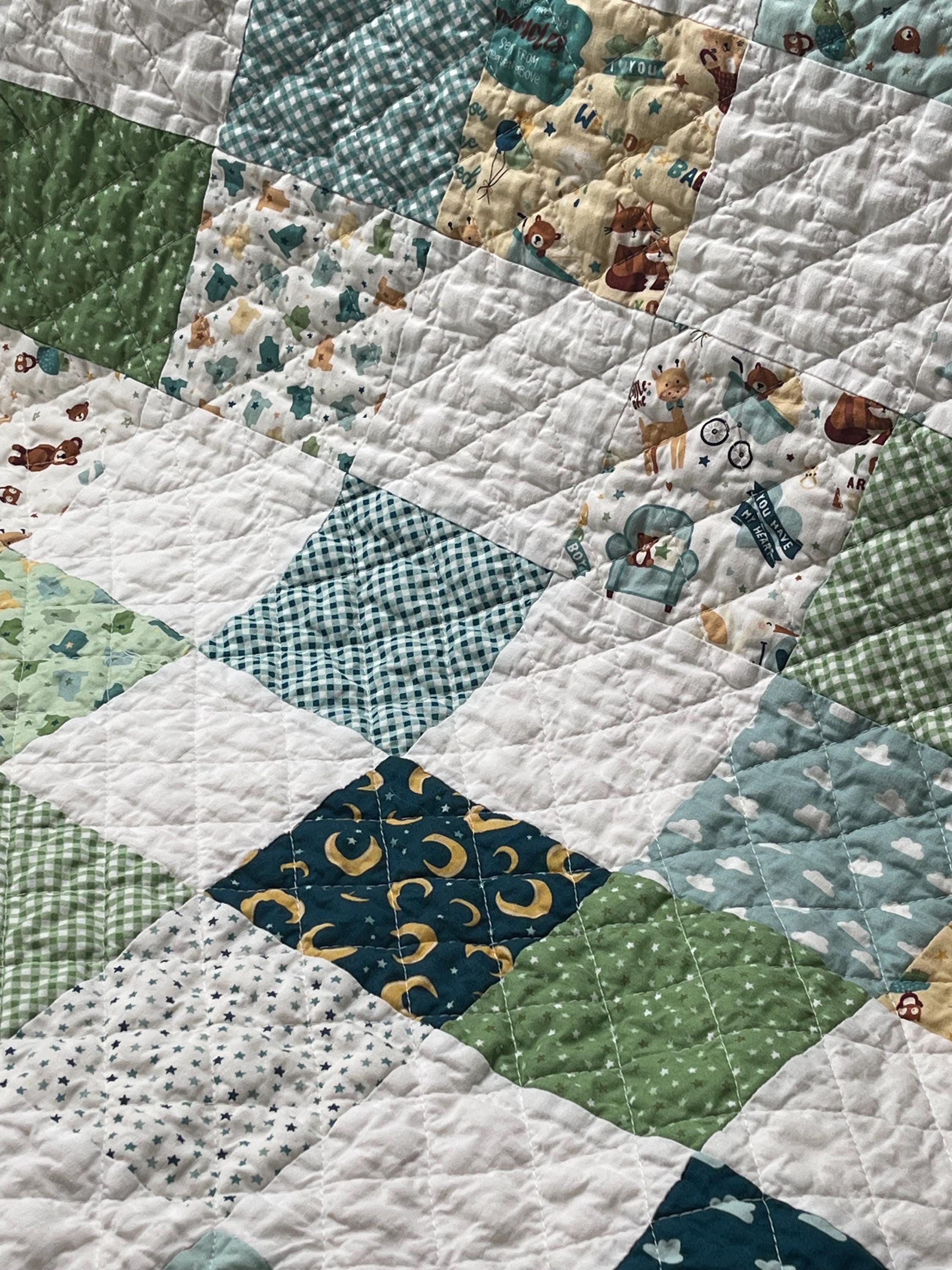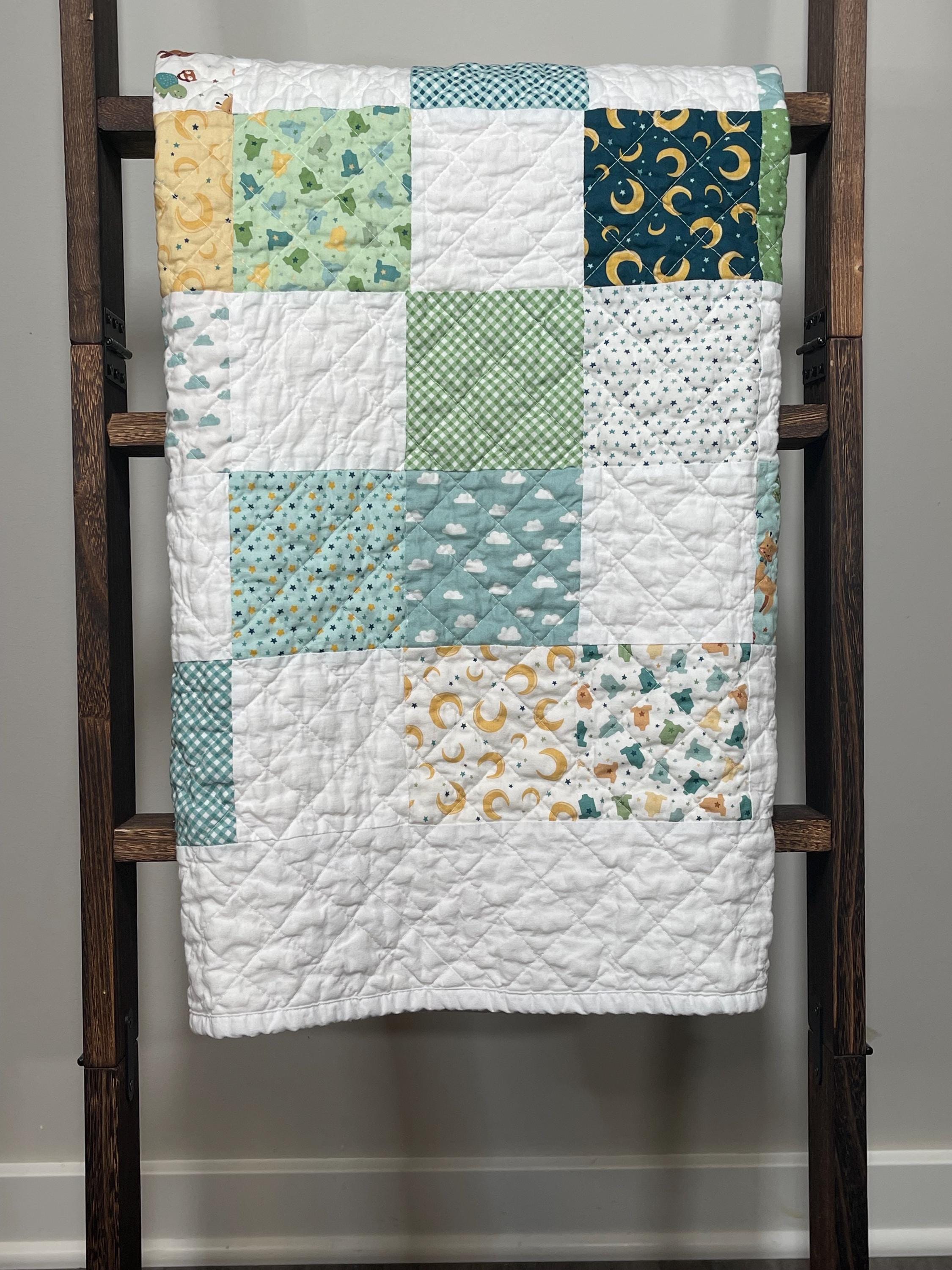 Give the perfect gift with this charming, handmade patchwork baby quilt, a cozy treasure that will be cherished for years to come. Crafted with love, this quilt features a delightful mix of whimsical patterns in soothing, gender-neutral colors perfect for a little boy's nursery.