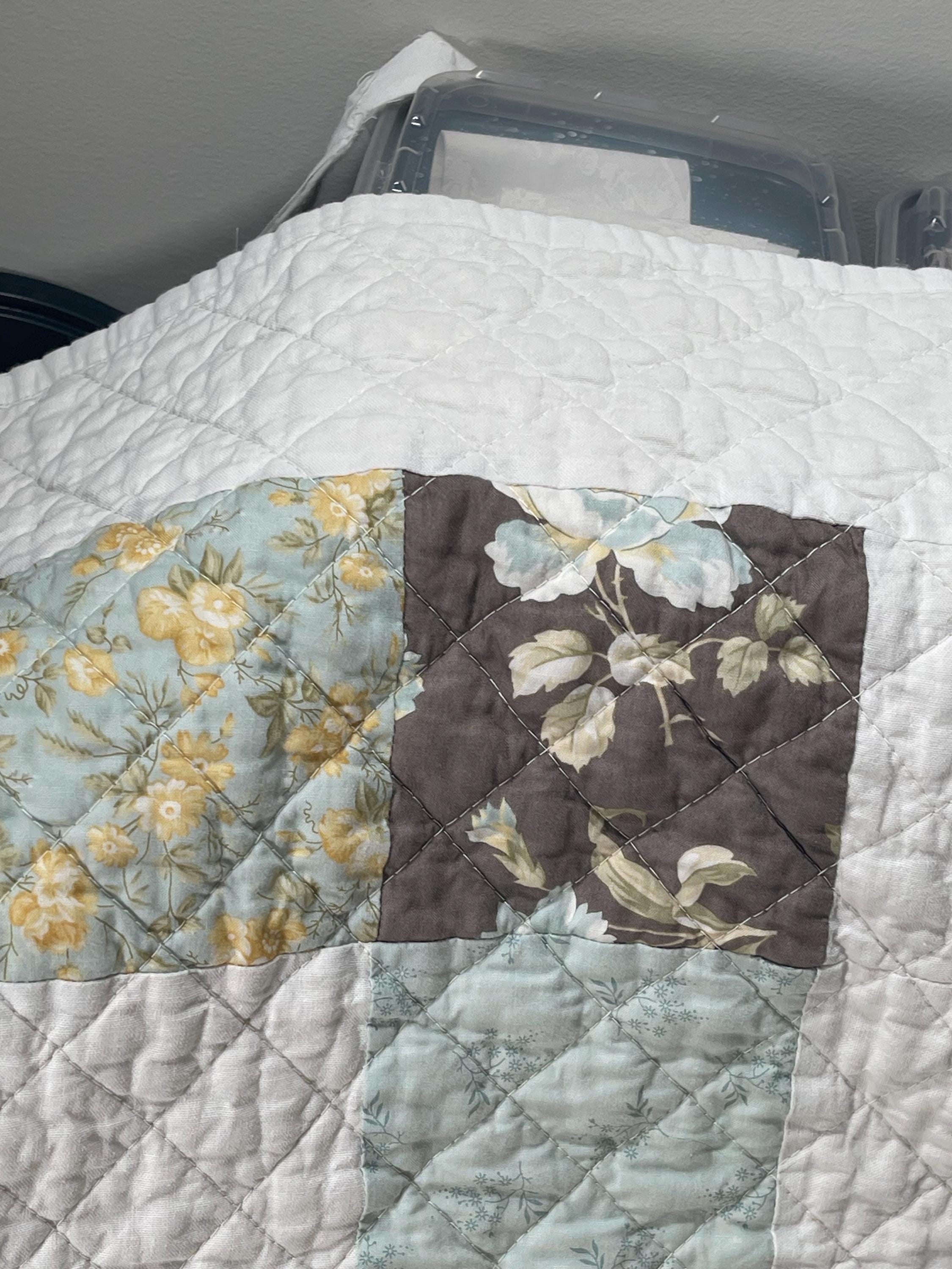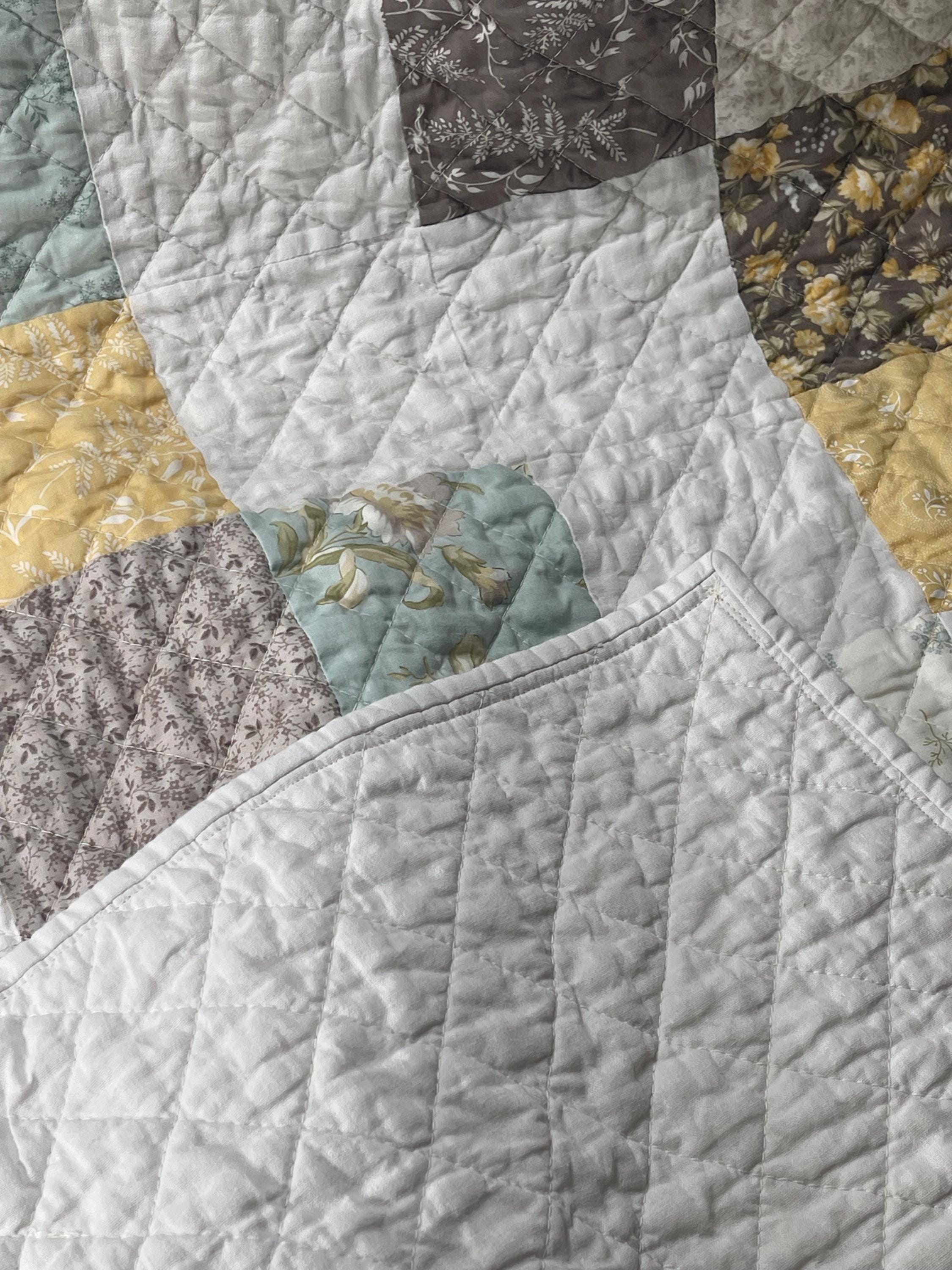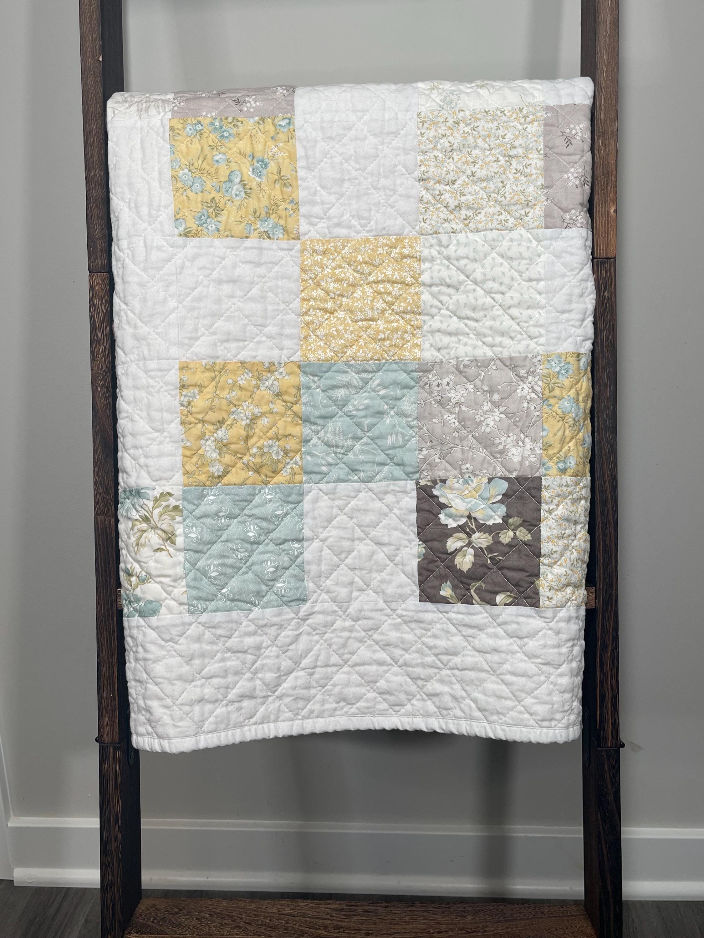Discover the understated elegance of this handmade baby quilt, perfect for creating a tranquil and charming nursery. With its unique blend of soft hues and classic floral patterns, this quilt offers a sophisticated touch that works beautifully for a gender-neutral nursery or any space seeking a touch of vintage-inspired calm. It’s more than just a blanket; it’s a future heirloom, lovingly crafted for your family.