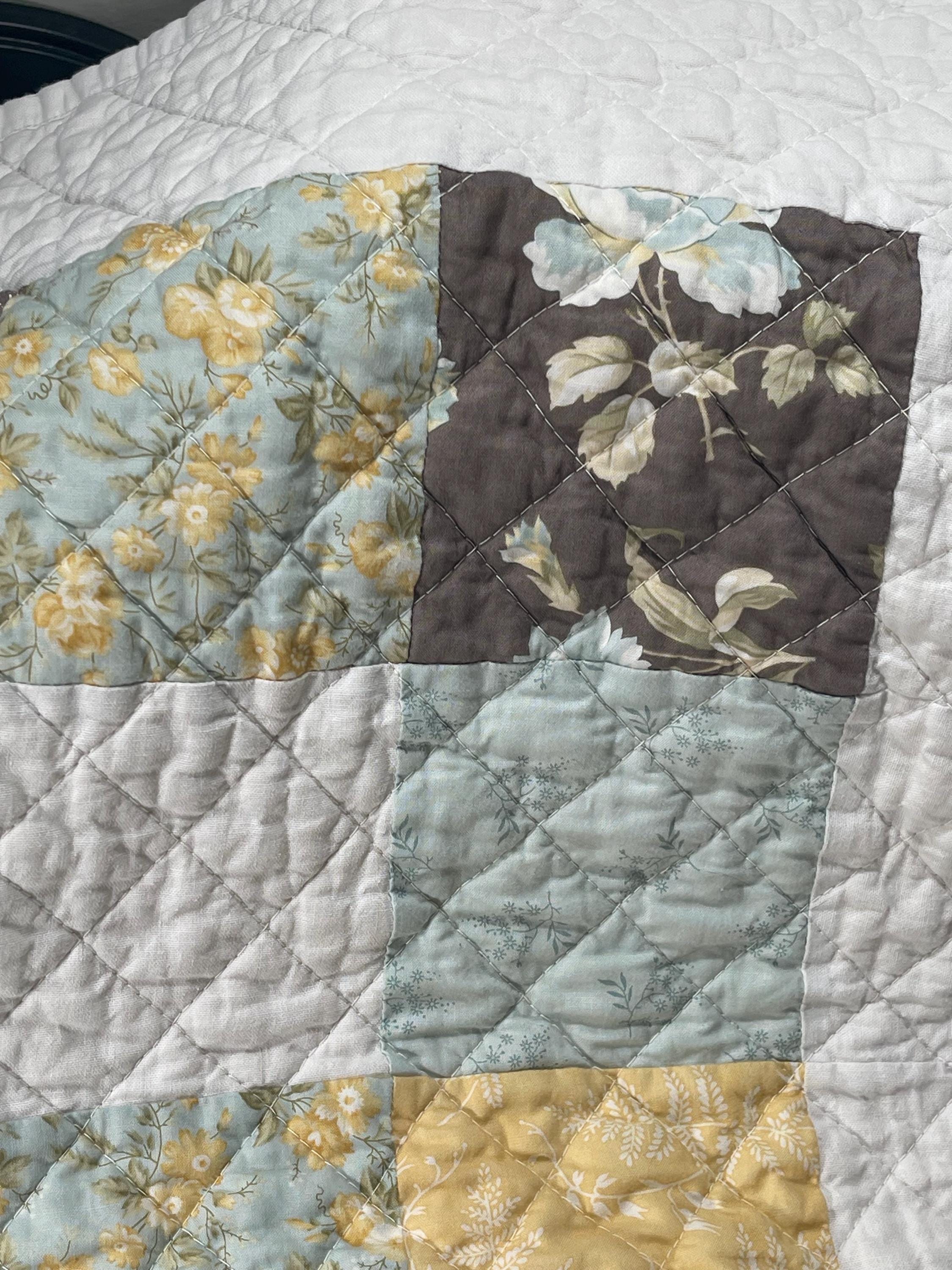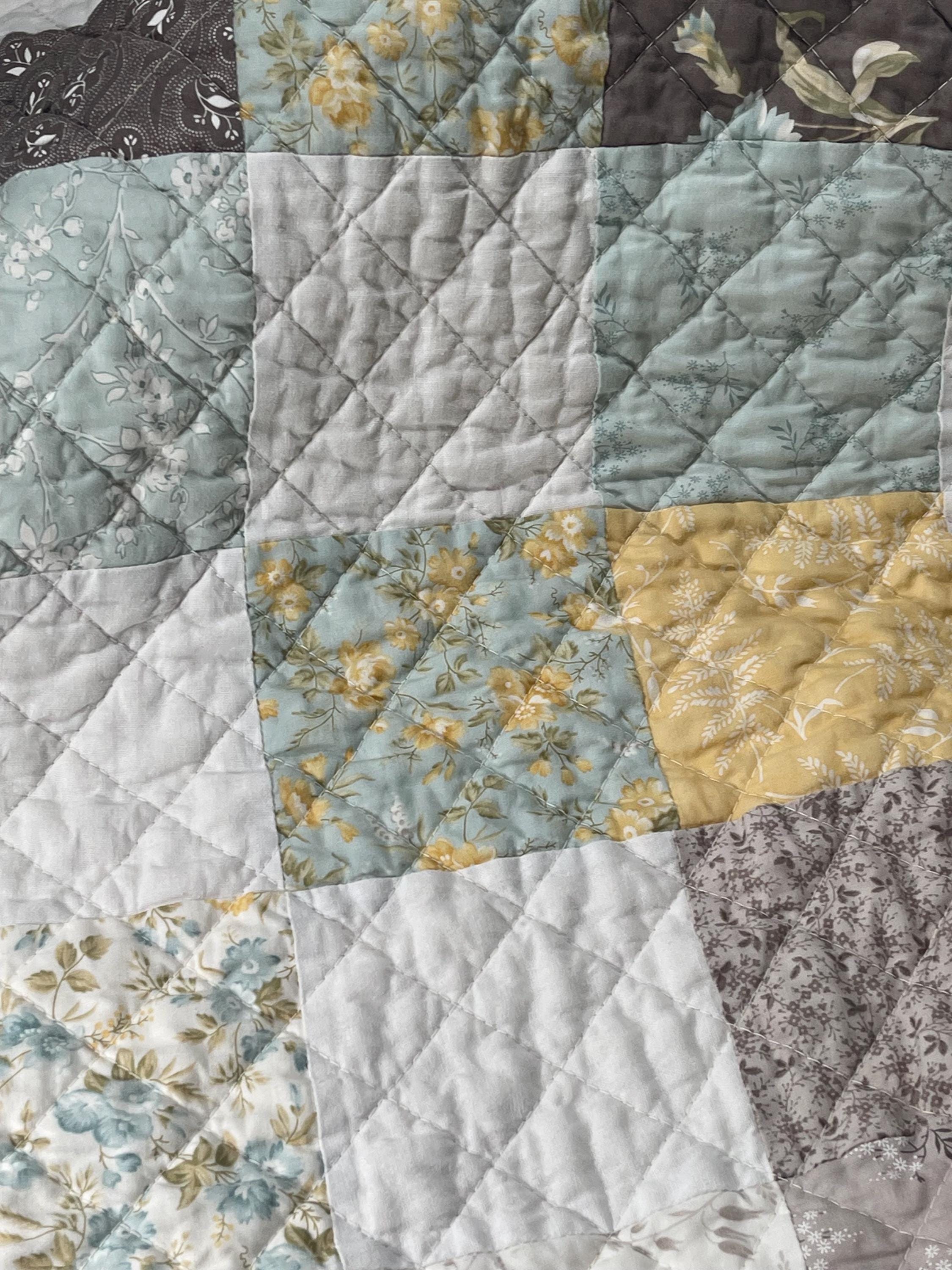Elegant Patchwork: This quilt features a classic square block patchwork design, showcasing a delightful array of coordinating prints and soothing solid squares.