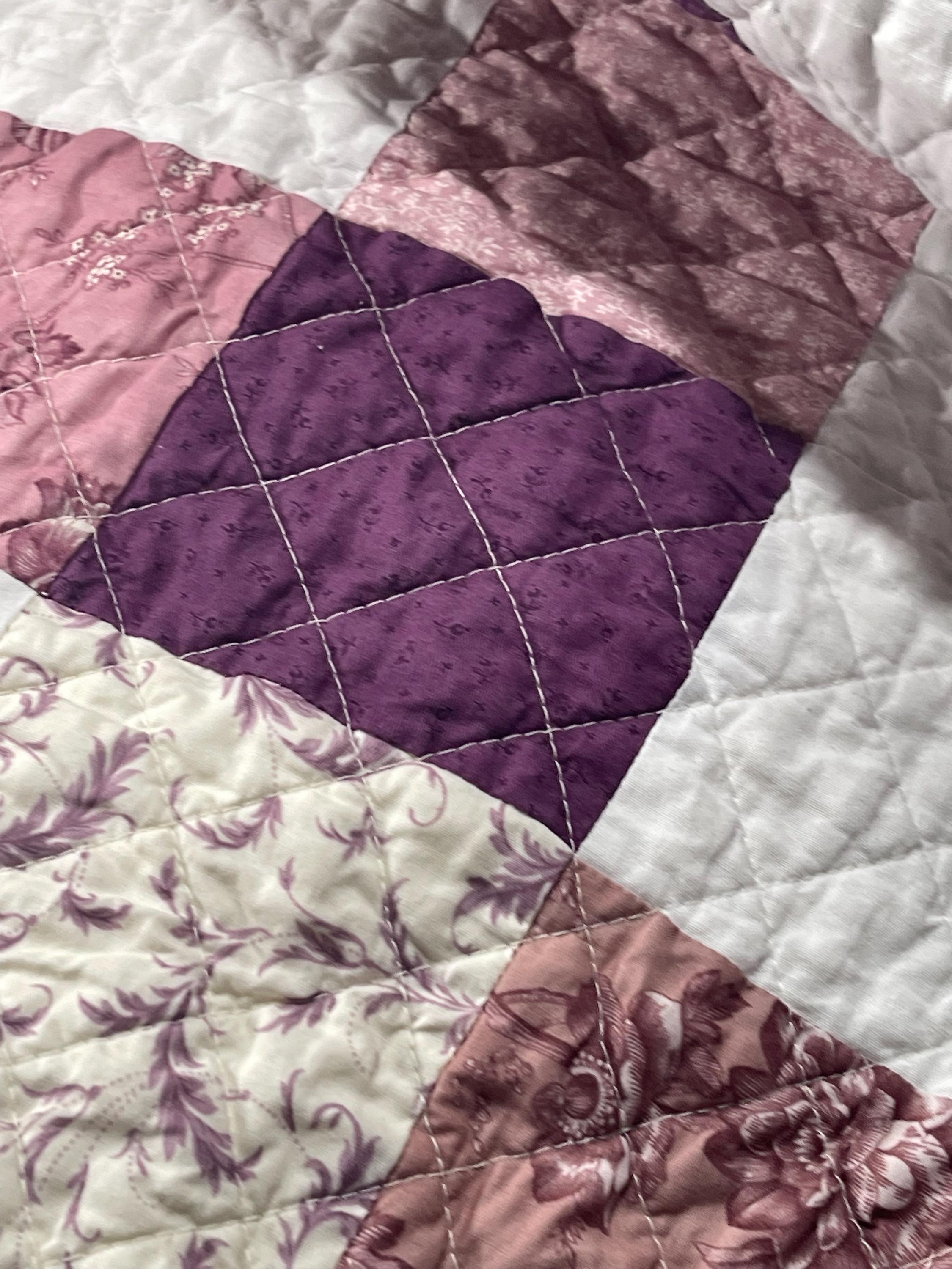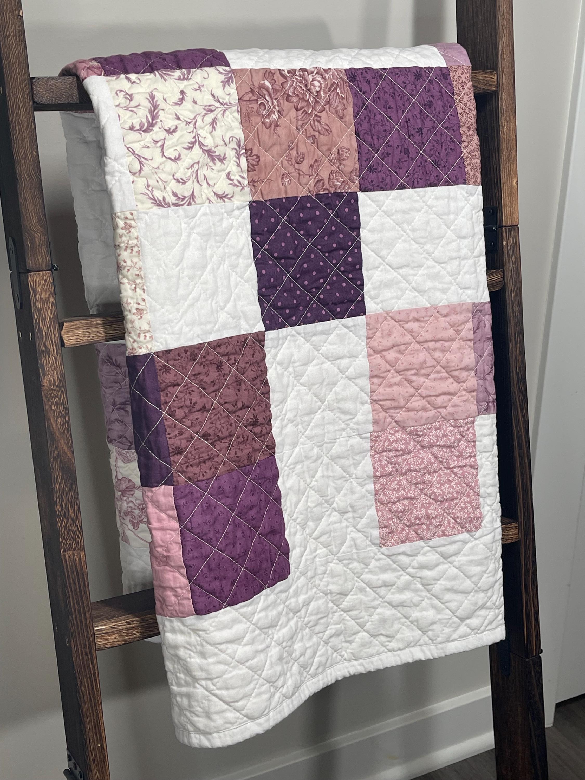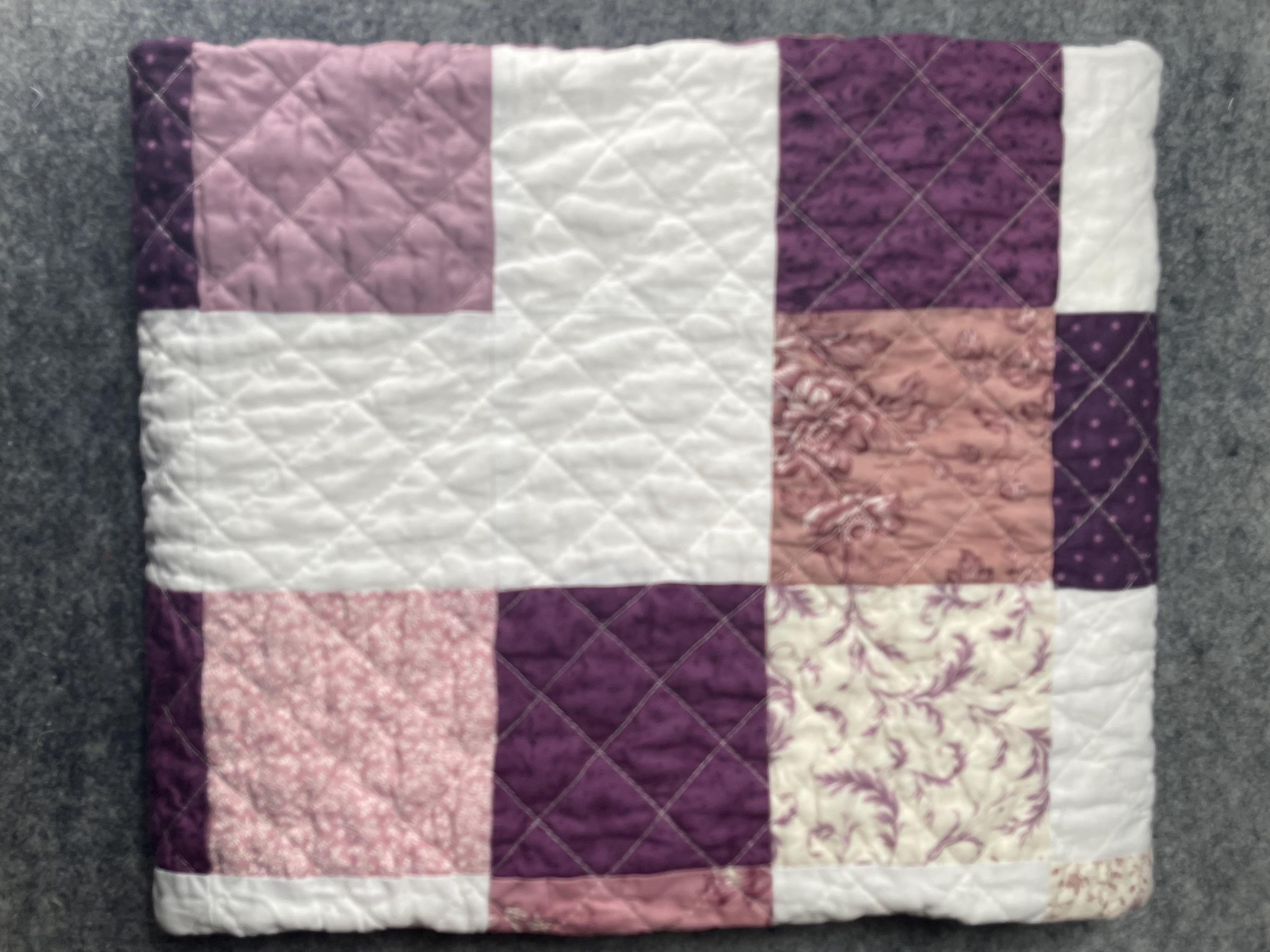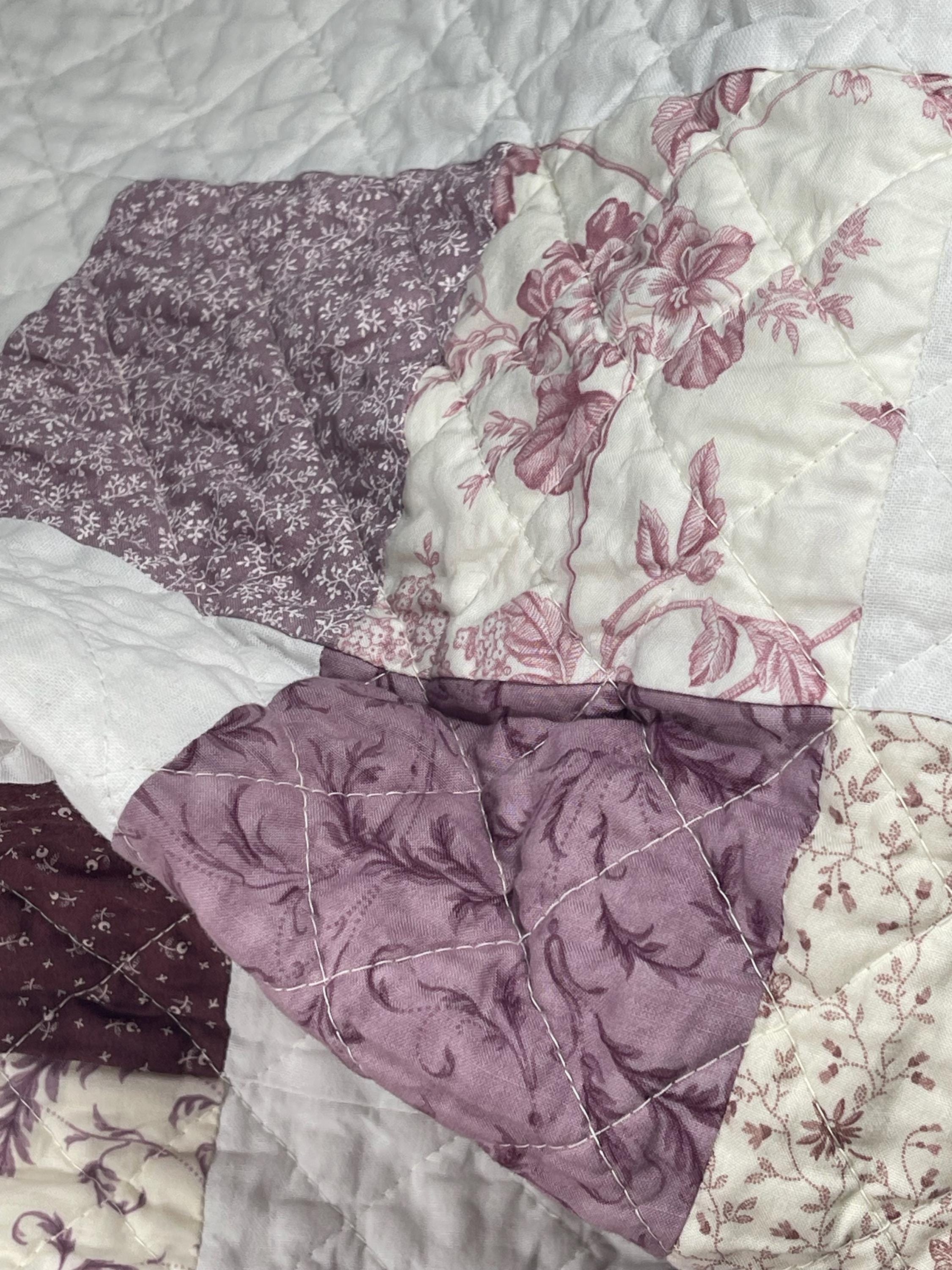 Welcome your newest family member with this gorgeous, handcrafted baby quilt. This charming quilt features a soft, elegant color palette of lilac, plum, mauve, and white, making it a lovely addition to any nursery decor. It's more than just a blanket—it's a warm, cozy piece ready to become a cherished family heirloom.