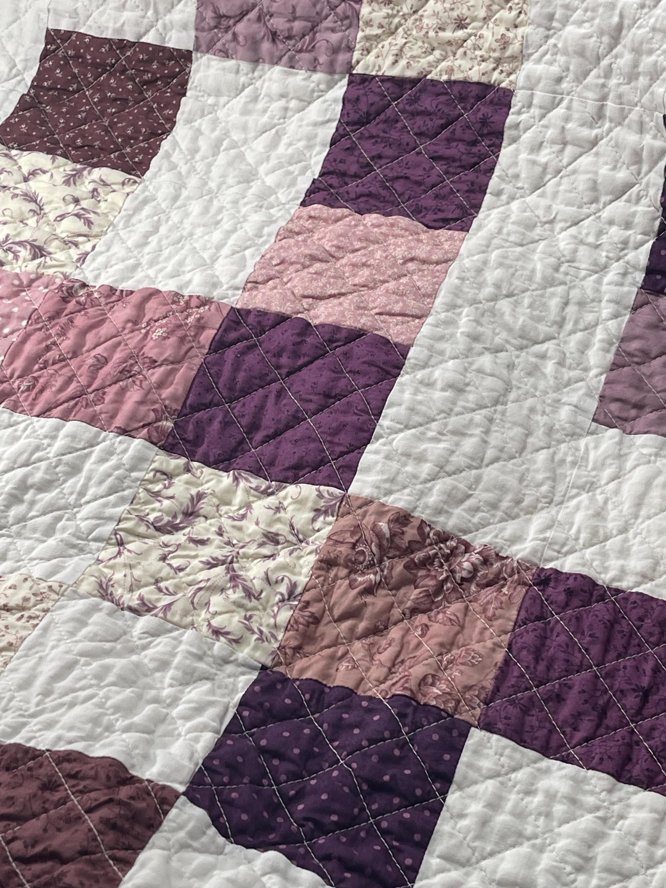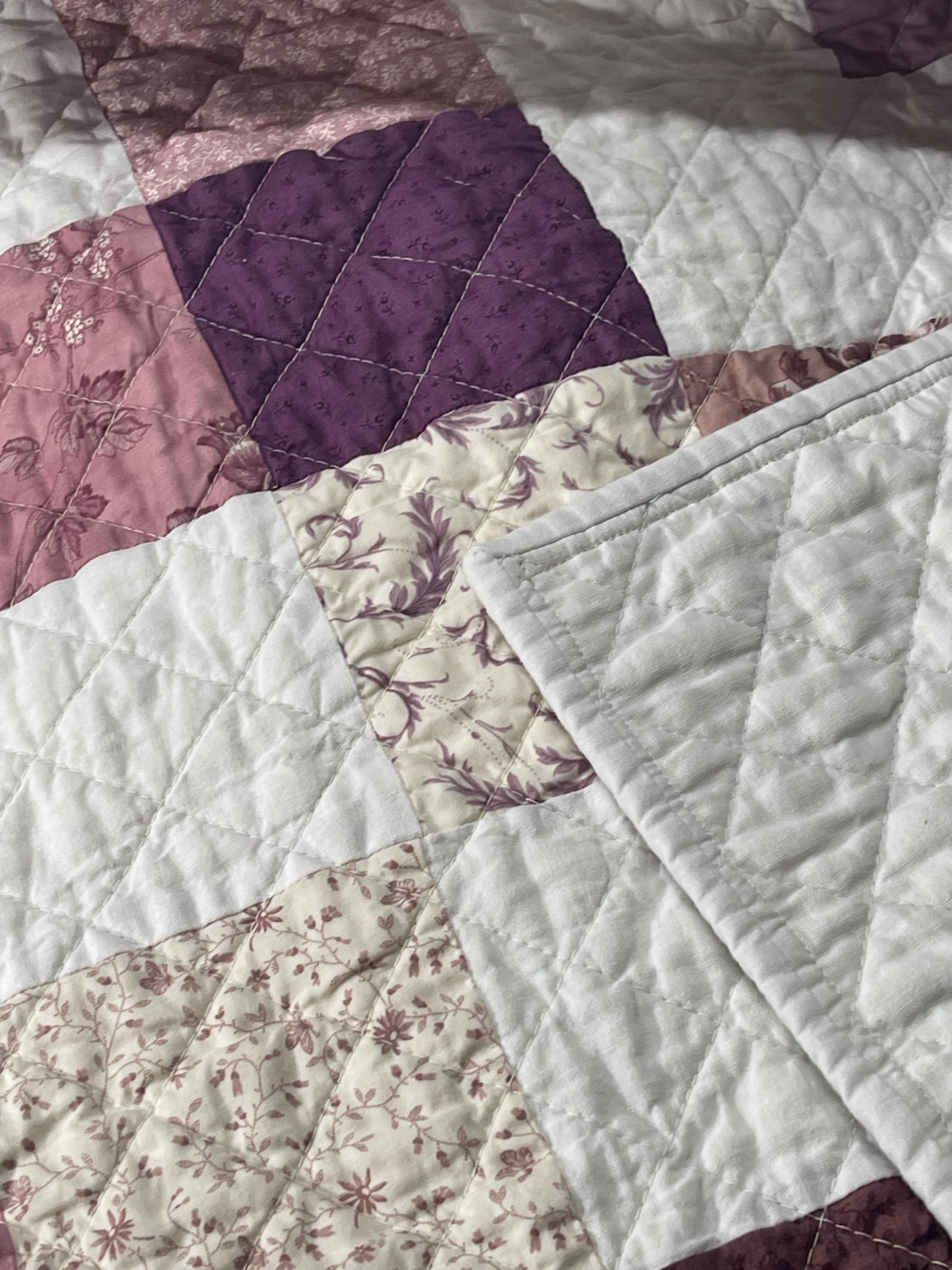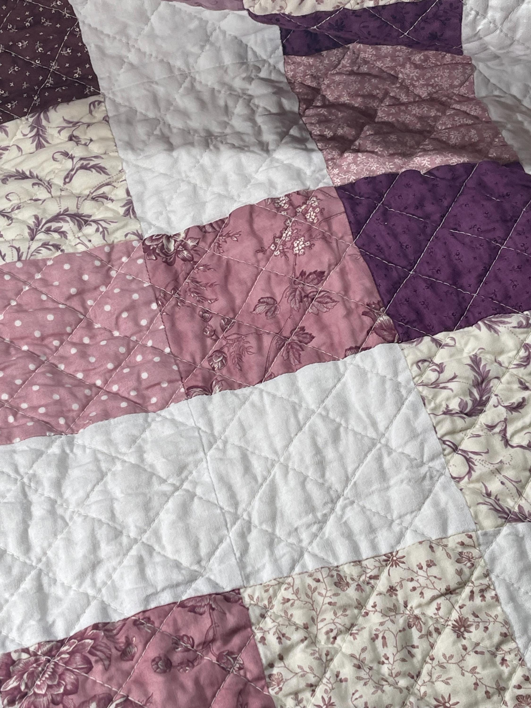 Welcome your newest family member with this gorgeous, handcrafted baby quilt. This charming quilt features a soft, elegant color palette of lilac, plum, mauve, and white, making it a lovely addition to any nursery decor. It's more than just a blanket—it's a warm, cozy piece ready to become a cherished family heirloom.