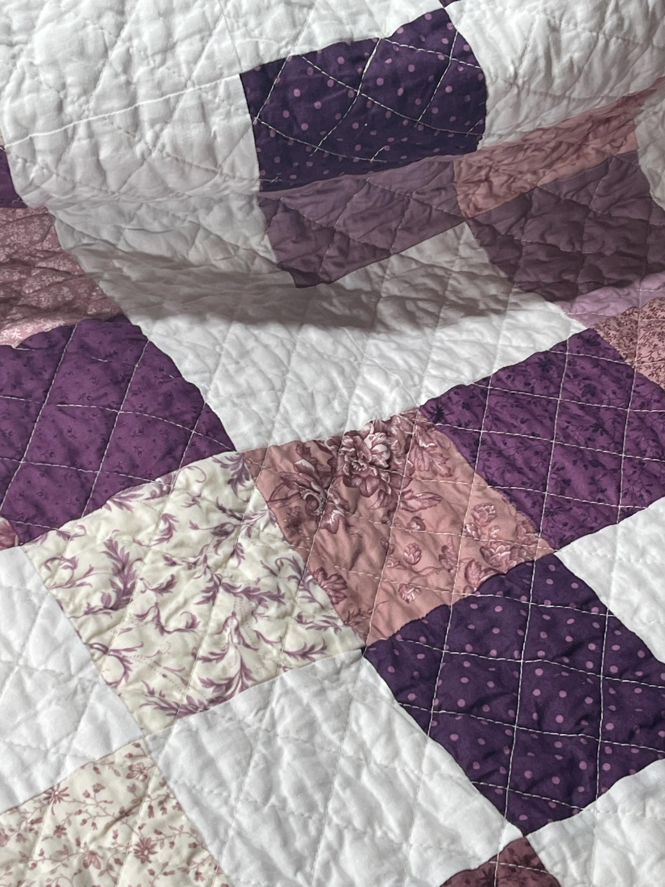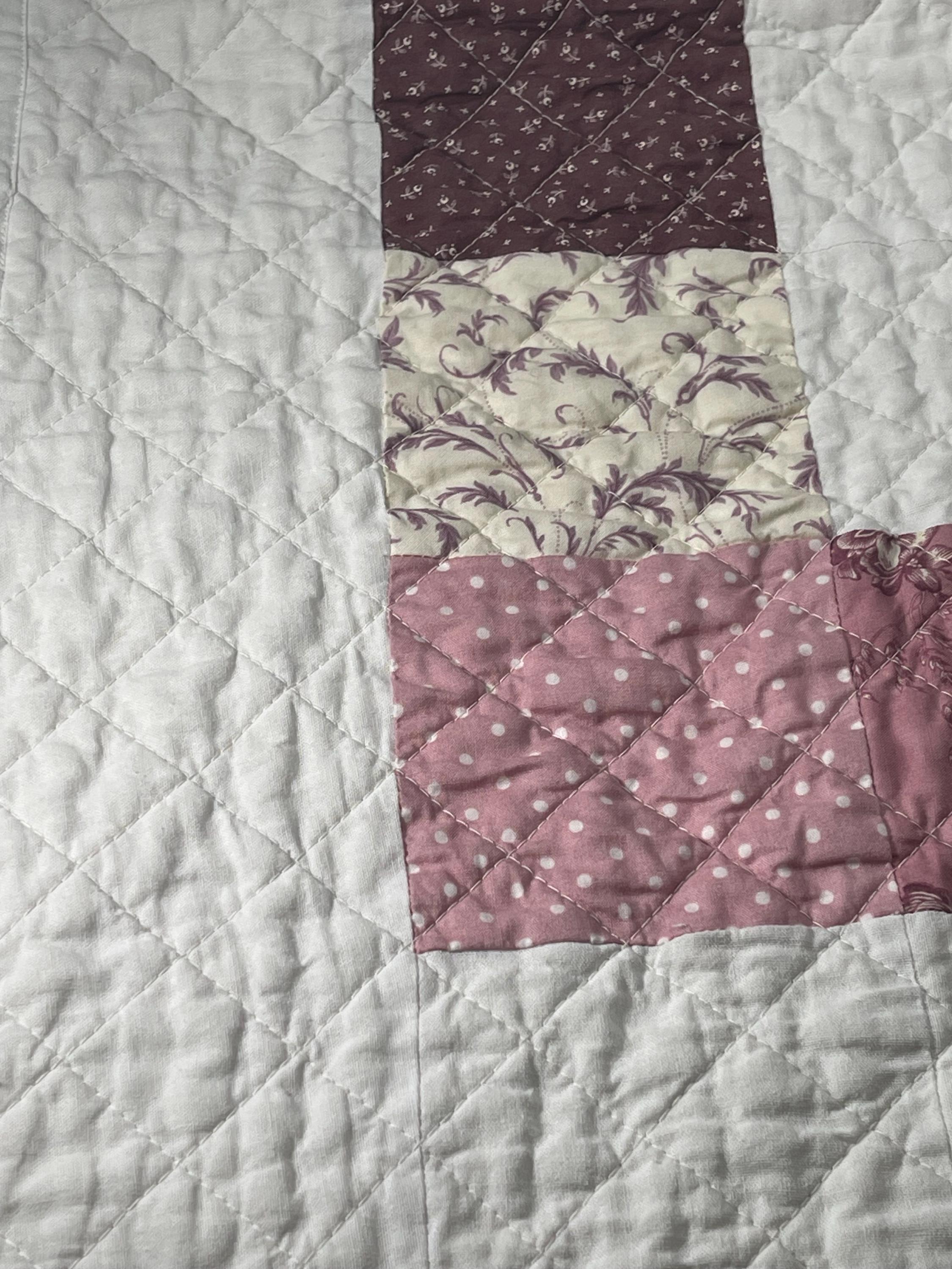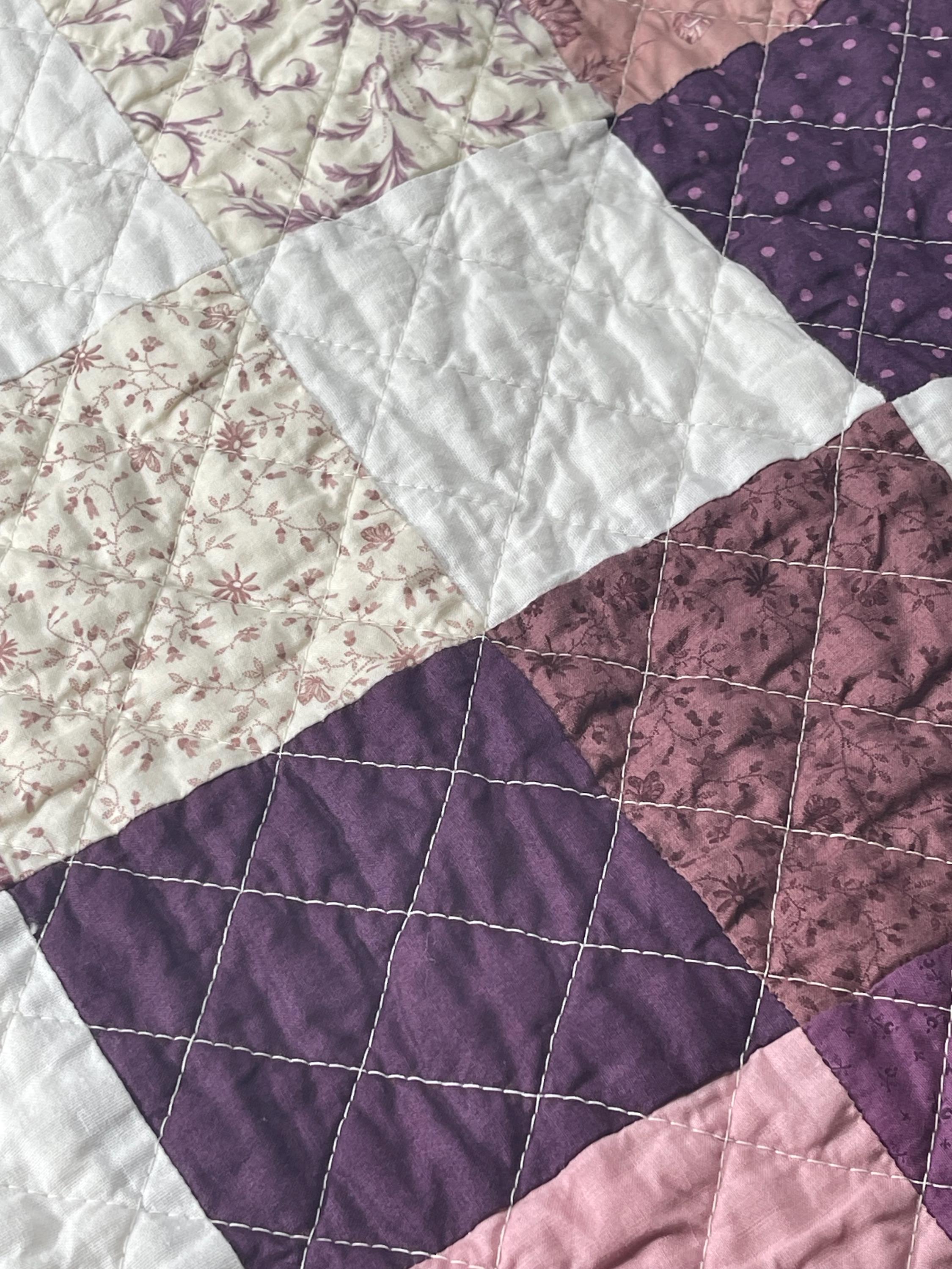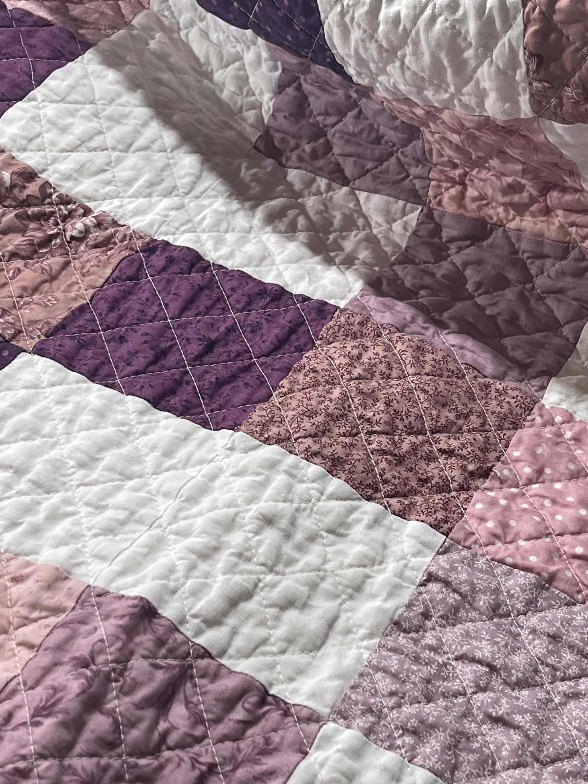 Welcome your newest family member with this gorgeous, handcrafted baby quilt. This charming quilt features a soft, elegant color palette of lilac, plum, mauve, and white, making it a lovely addition to any nursery decor. It's more than just a blanket—it's a warm, cozy piece ready to become a cherished family heirloom.