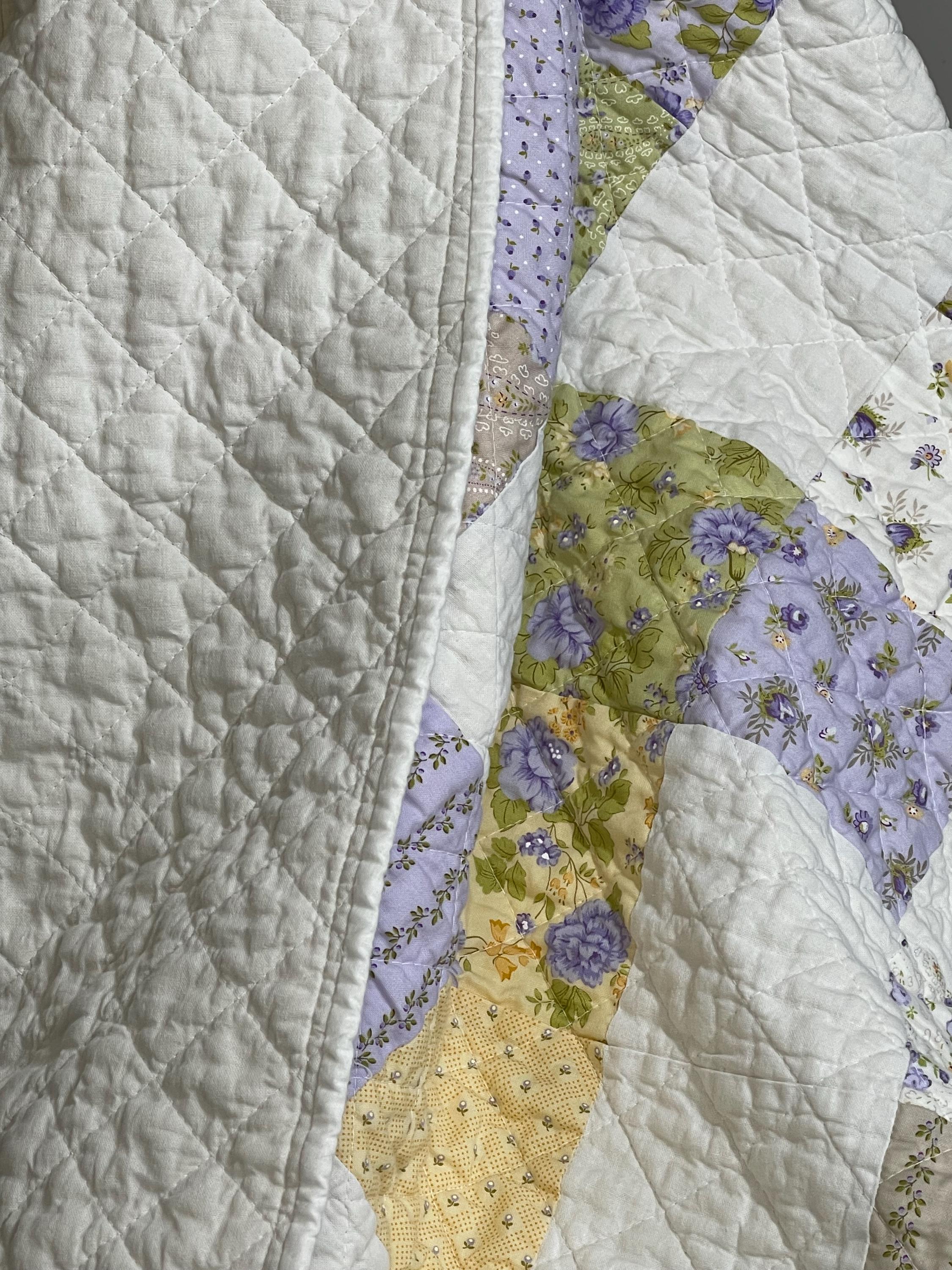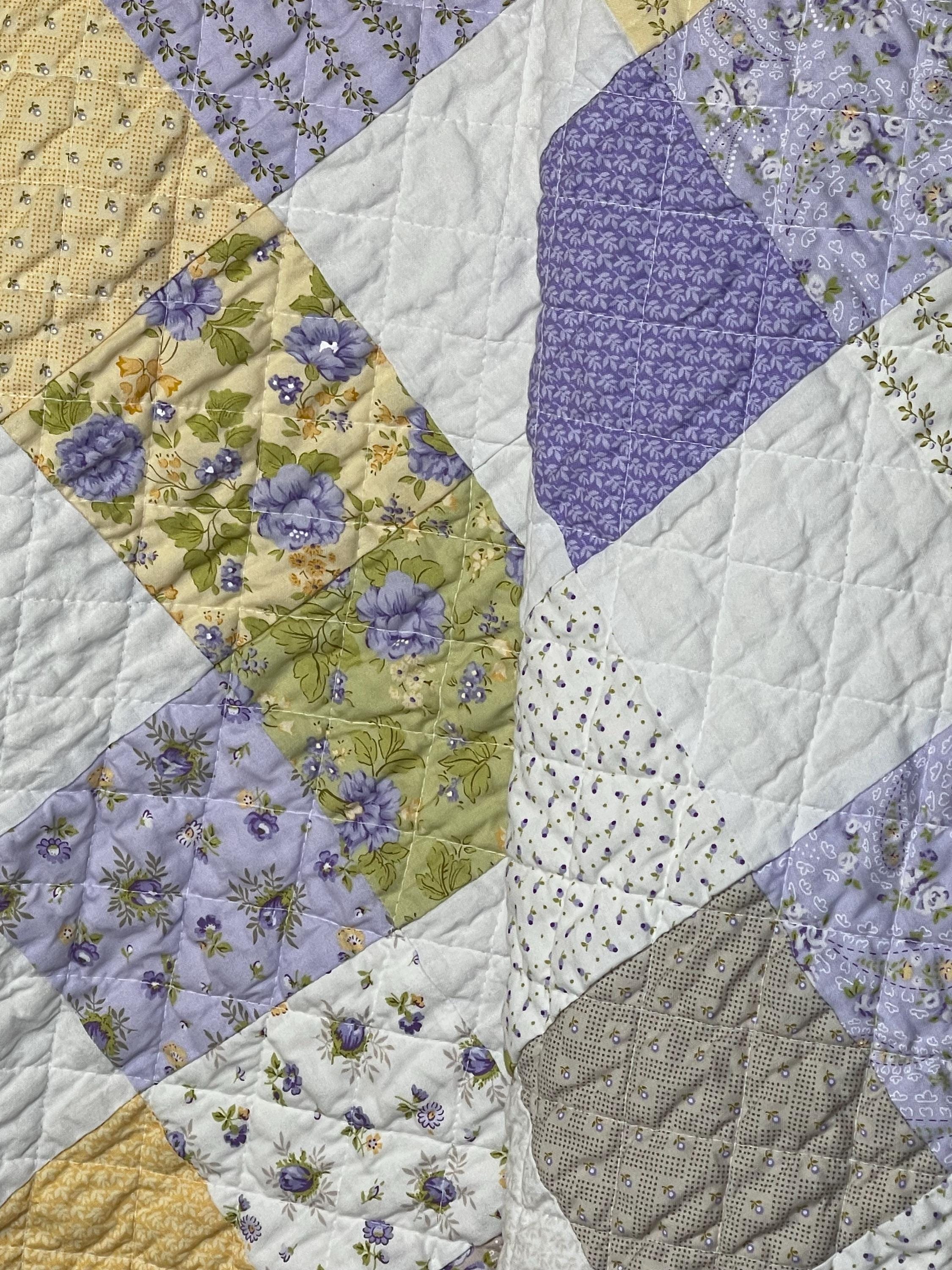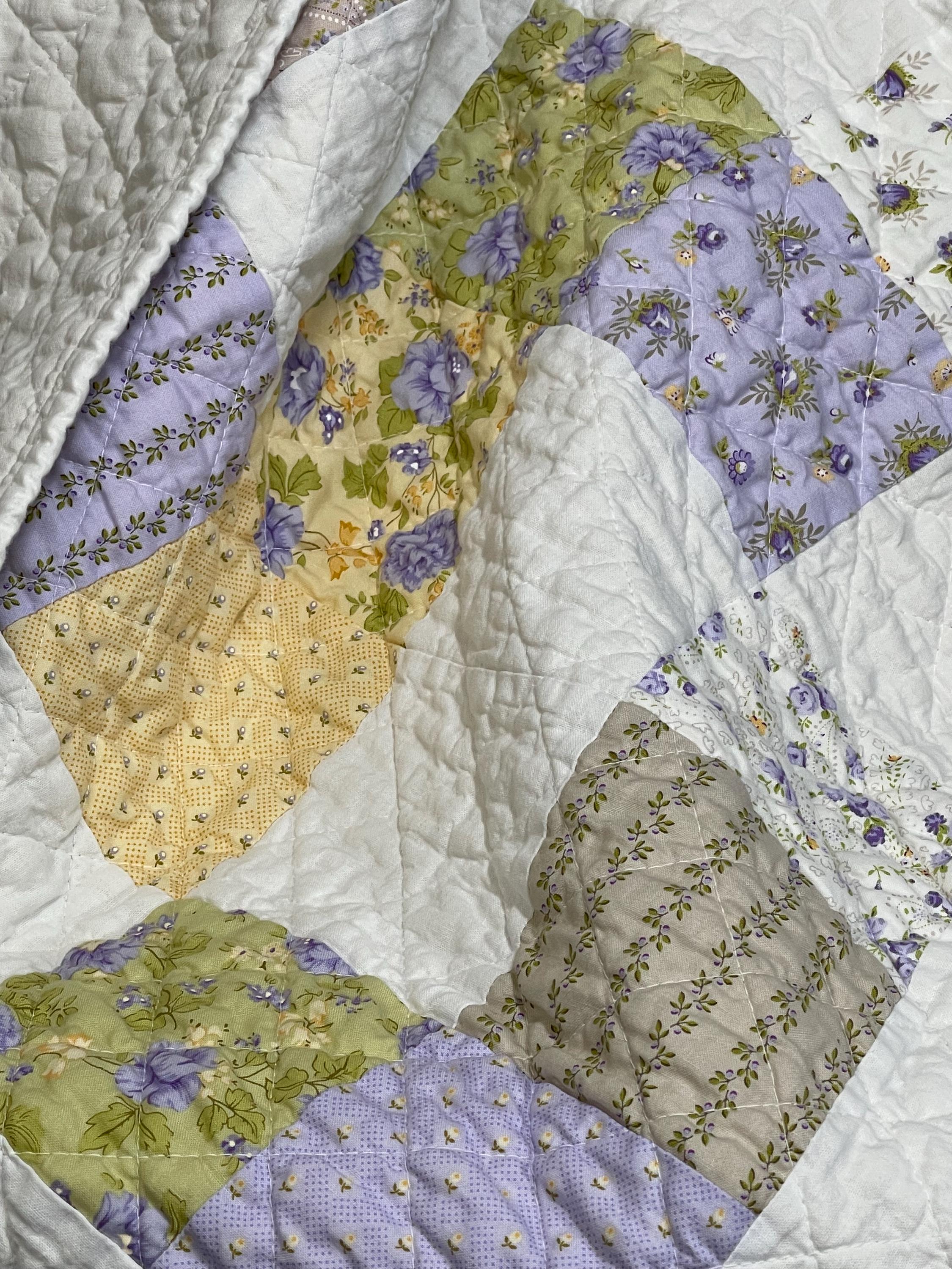Welcome your little one with this exquisite, handmade patchwork baby quilt. Featuring a charming mix of vintage-inspired floral fabrics in a soothing palette of soft lavender, gentle sage green, and light buttercup yellow, this blanket is the perfect cozy addition to any nursery.